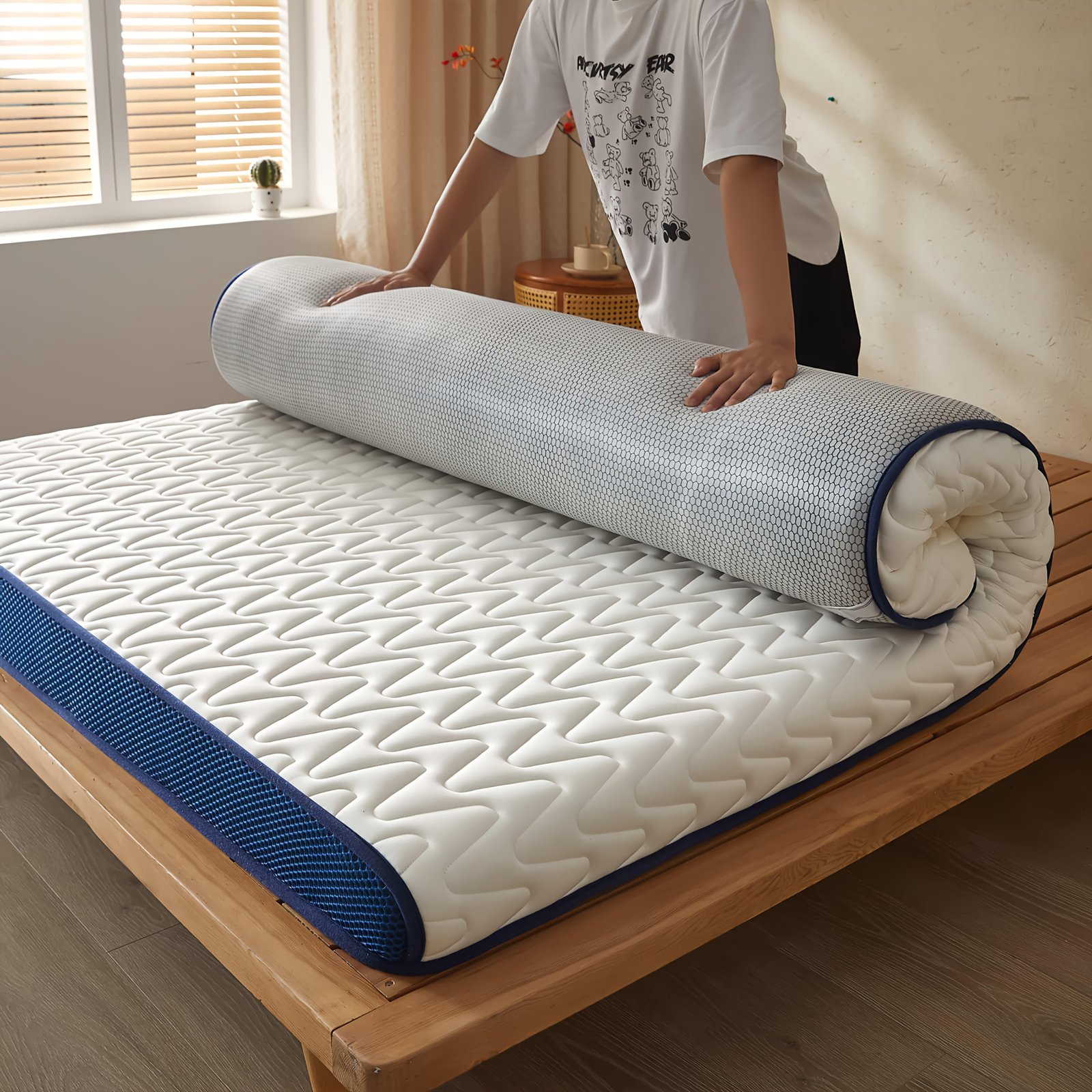 - تصميم شبكي يسمح بالتهوية: يضمن دوران الهواء المستمر والفعال، مما يبقيك منتعشاً ومريحاً طوال الليل ويمنع الشعور بالحرارة والرطوبة، لراحة مثالية في جميع الأوقات.