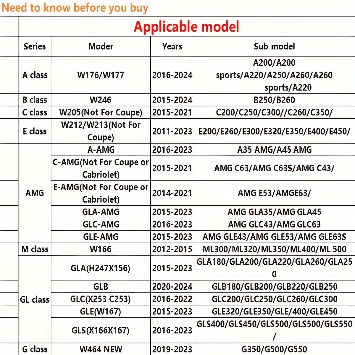 - توافق مثالي مع موديلات مرسيدس المختارة: مصممة خصيصًا لتناسب مجموعة واسعة من موديلات مرسيدس-بنز الشهيرة، بما في ذلك الفئات A, B, C, E, M, GL, GLA, GLC, GLE, GLS (مثل W205, W213, W176, W166)، لتضمن ملاءمة مثالية وتكاملًا سلسًا.