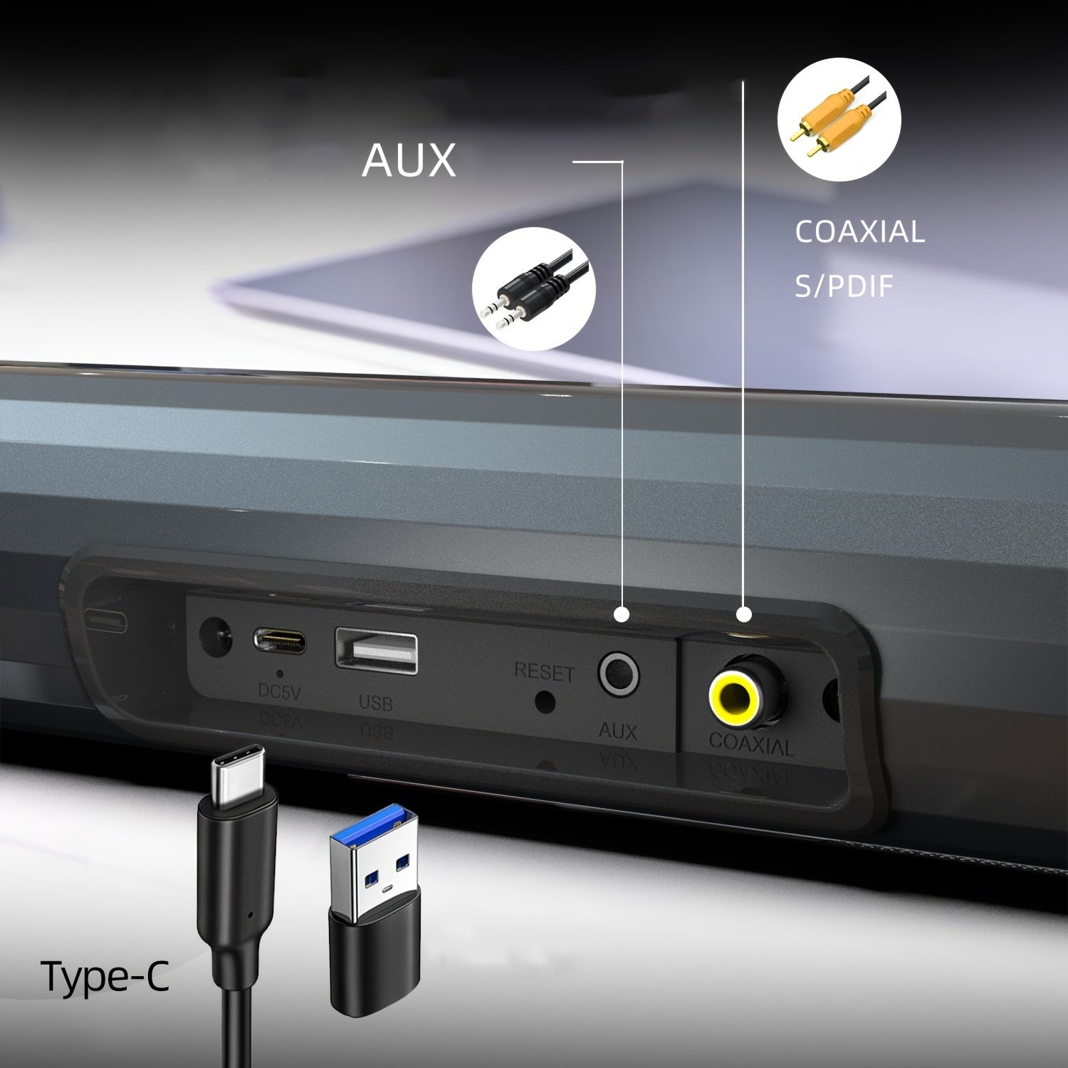 - تعدد مصادر الصوت: يدعم إدخالات متنوعة مثل Coaxial، و AUX، و 3.5 ملم، بالإضافة إلى راديو FM وتشغيل USB، مما يضمن توافقاً واسعاً مع جميع أجهزتك المفضلة.