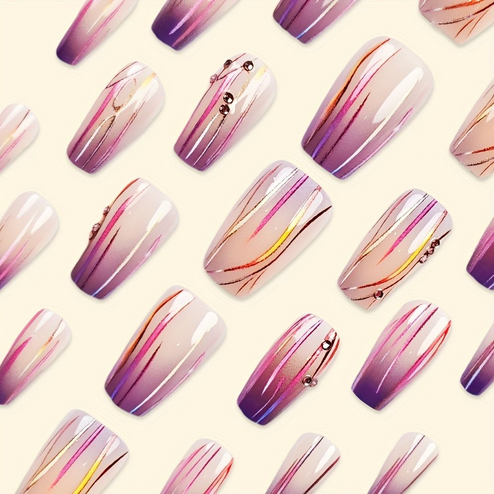 - تصميم متدرج بلمسة فرنسية ساحرة: استمتعي بانسجام الألوان المتدرجة من البنفسجي العميق إلى الوردي الرقيق، مع لمسة فرنسية عصرية تضفي رقيًا فريدًا يبرز جمال يديكِ ويجعلهما محط الأنظار.
