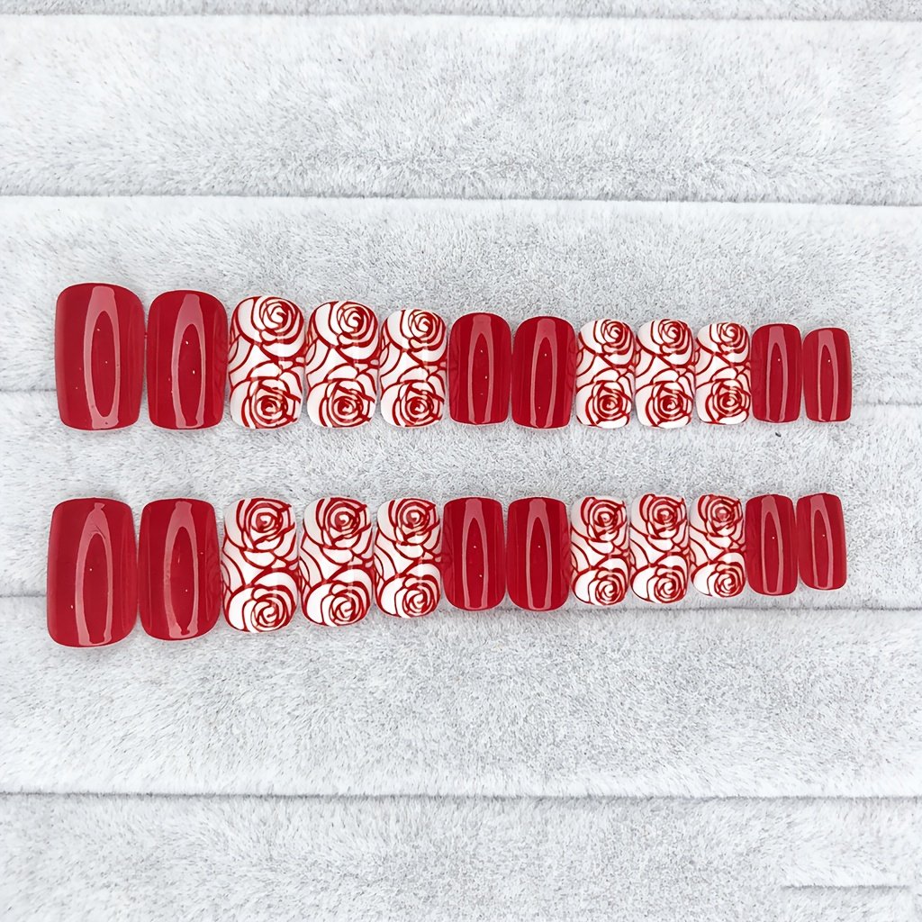 - تصميم وردي أحمر آسر: استمتعي بجمال نقوش الورد المجوفة الأنيقة باللون الأحمر اللامع، الذي يضفي على أظافرك لمسة رومانسية عميقة وجاذبية لا تُقاوم، مثالية للمناسبات الخاصة.