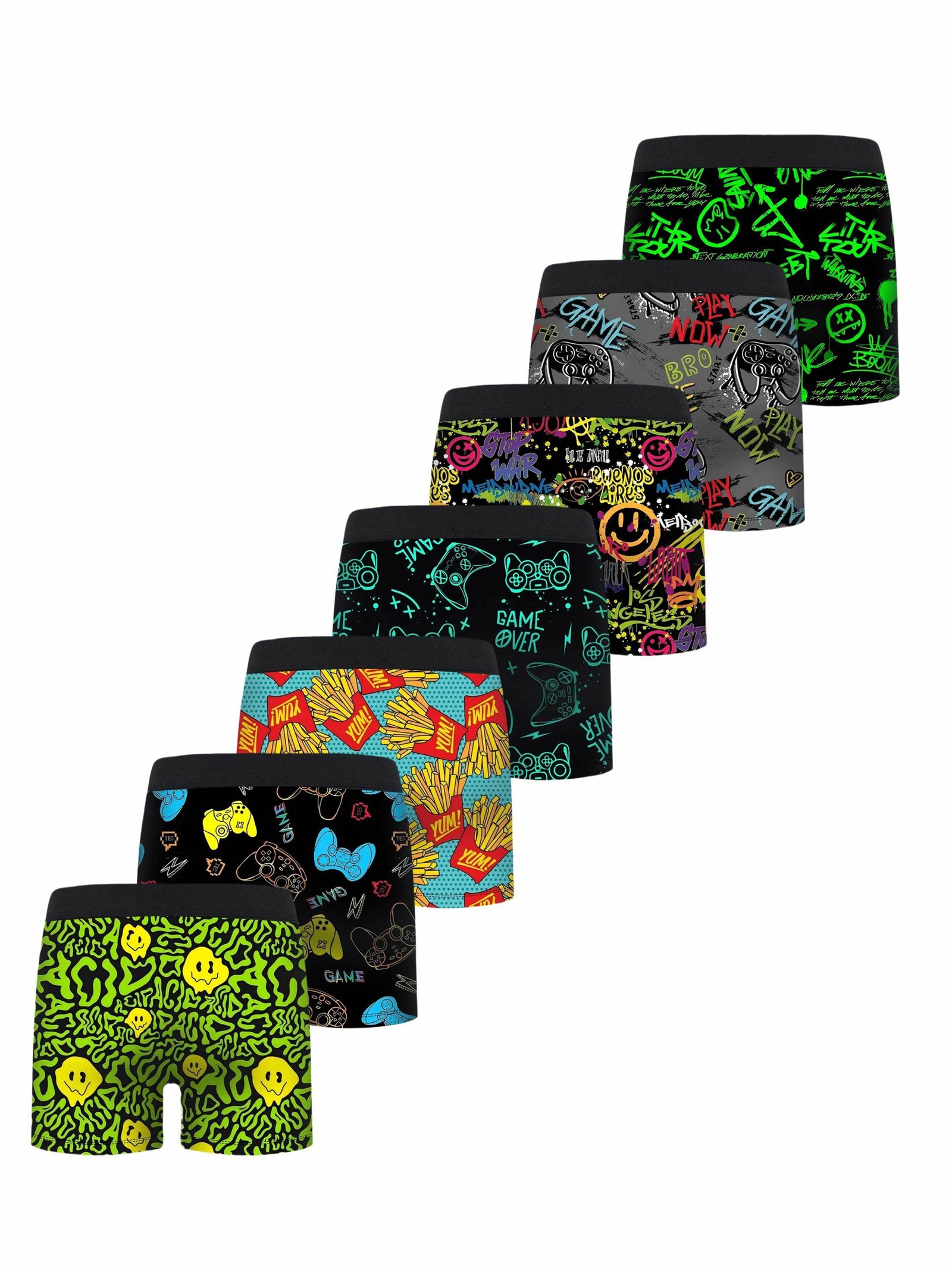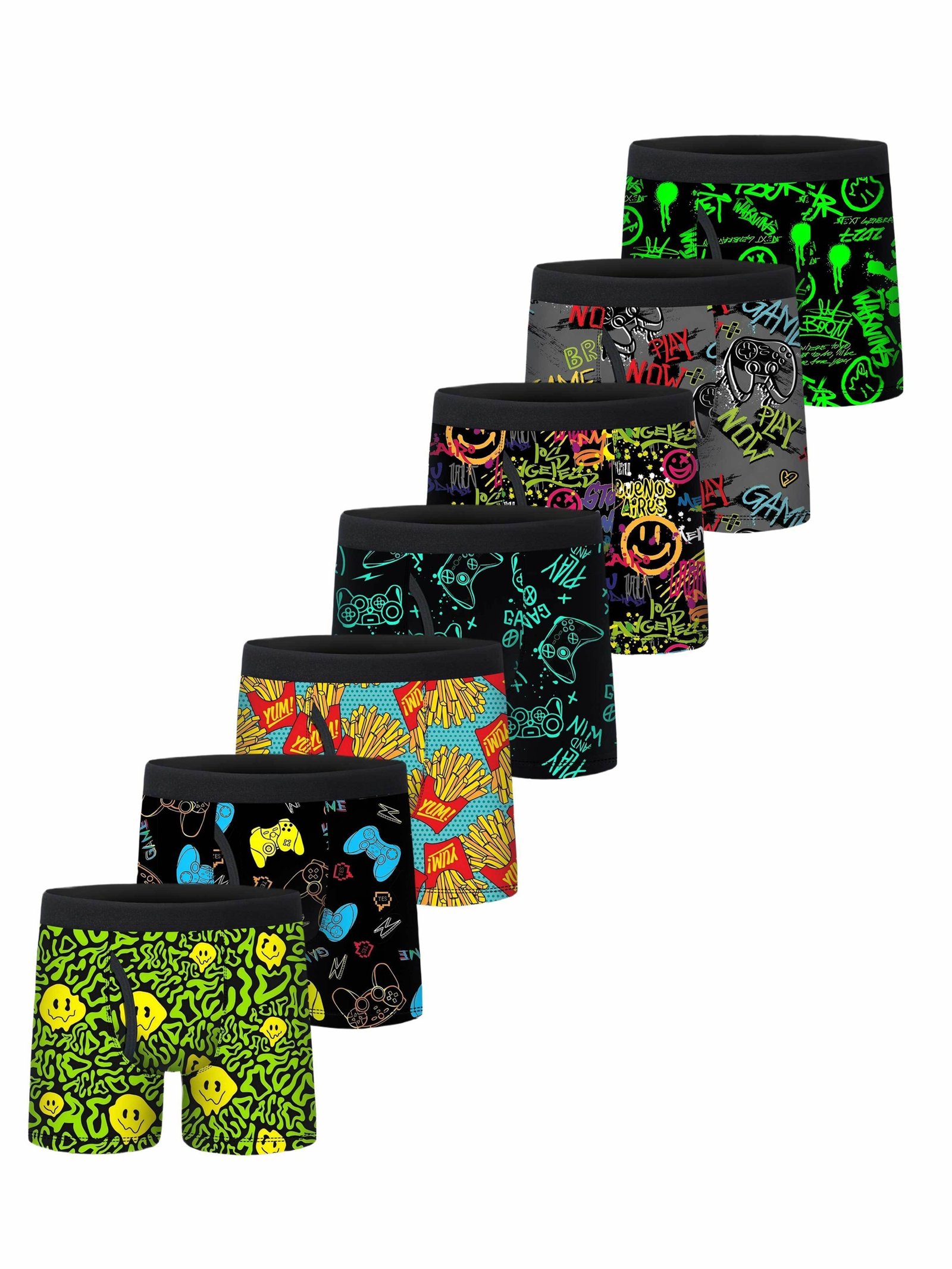 - تصاميم مرحة تعكس شخصيته: كل قطعة تأتي بأنماط مطبوعة بالكامل تتميز بعوالم الألعاب، الطعام اللذيذ، كرة القدم، شخصيات الأنمي والرسوم المتحركة المحببة، مما يضفي لمسة من البهجة والأناقة على إطلالته اليومية.