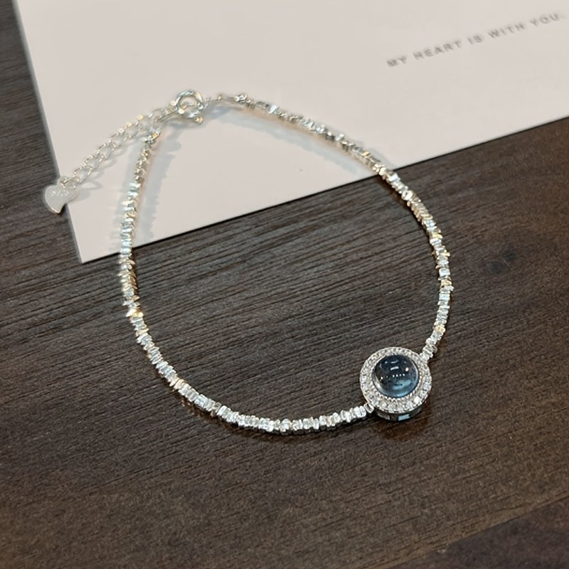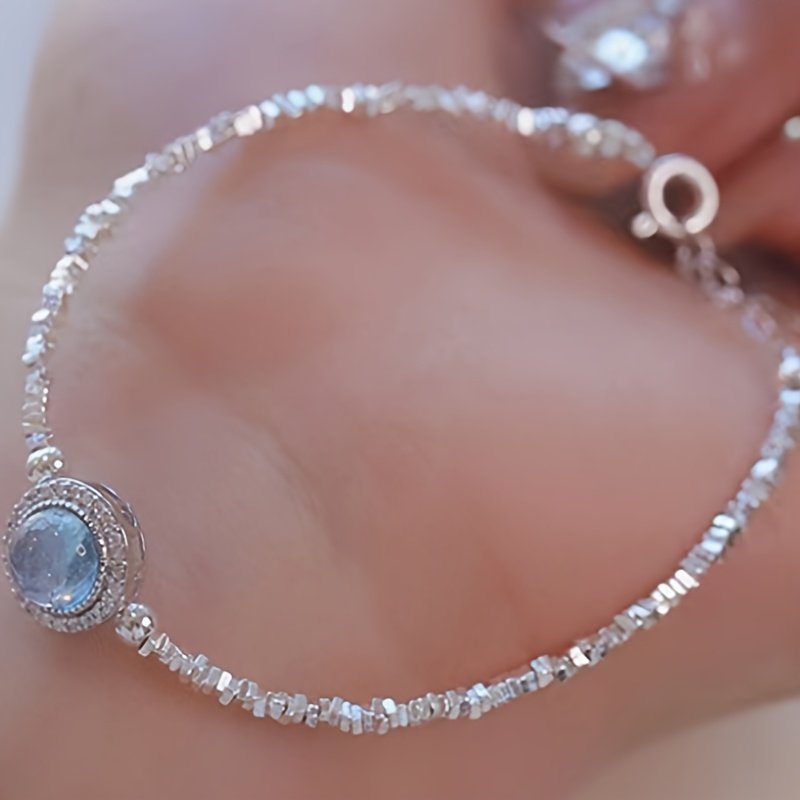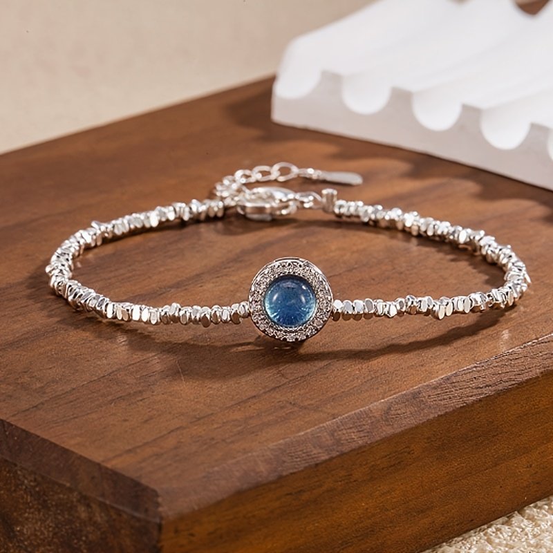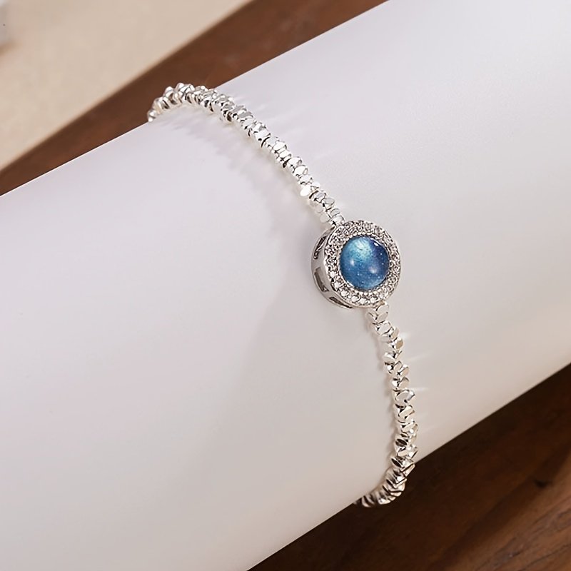 - تصميم مستوحى من الطبيعة: يجمع السوار بين خرز الأكريليك المتلألئ بلون الأزرق الثلجي الساحر، المستوحى من عمق المحيط وسماء الليل المرصعة بالنجوم، مع لمسات فضية دقيقة تضفي عليه بريقًا أخاذًا.