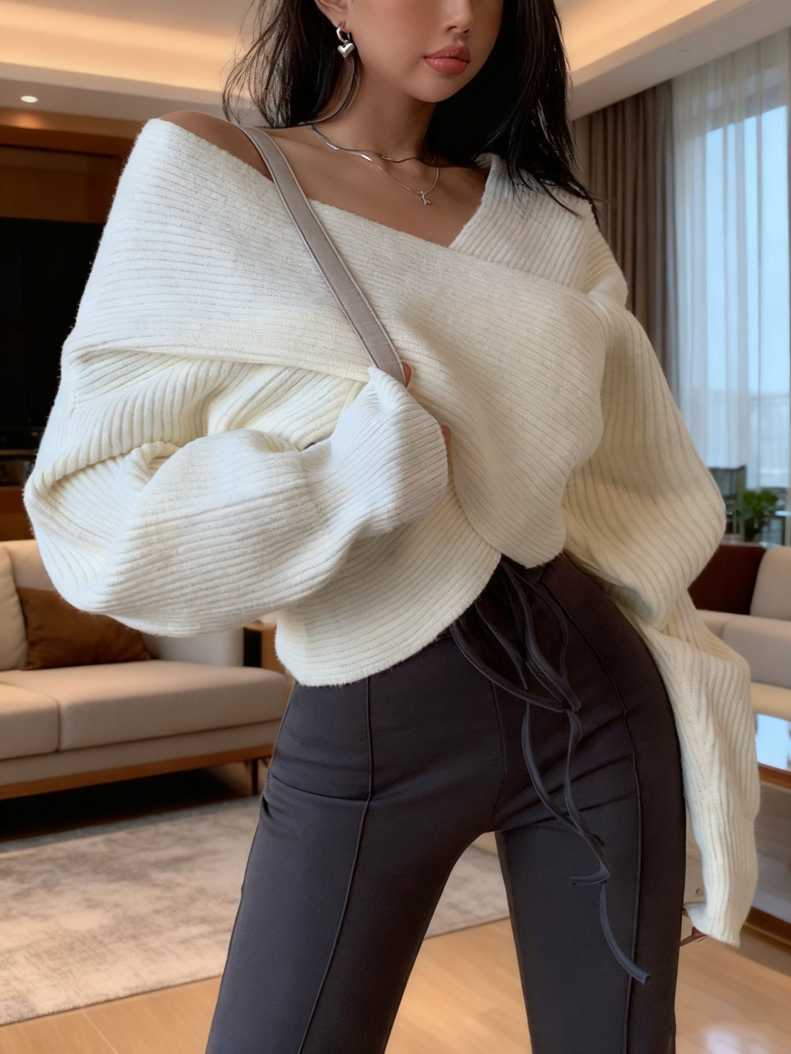 - أكمام واسعة بتصميم فريد: تأتي بأكمام واسعة على شكل جناح الخفاش (Bat Sleeve) مع قصة راجلان مميزة، مما يضفي عليها لمسة فنية ويضمن أقصى درجات الراحة والأناقة.