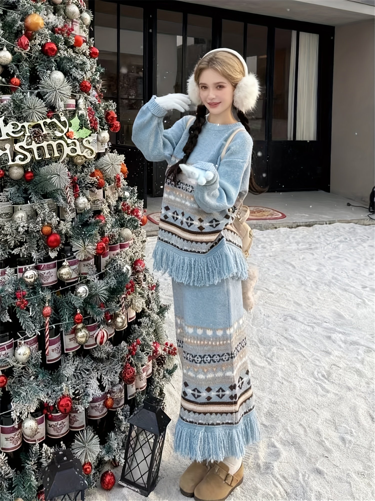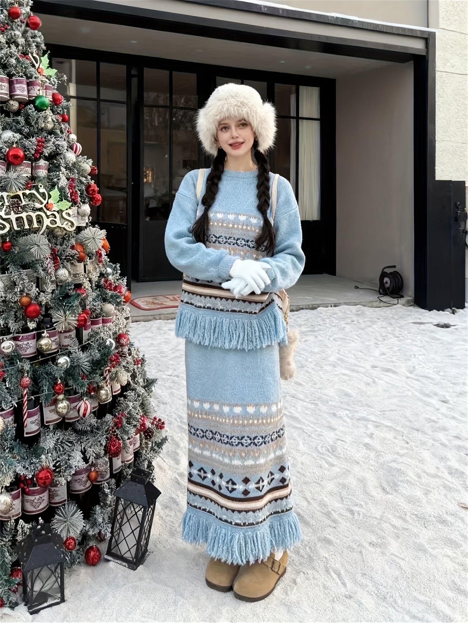 - تصميم “فاير آيل” الفريد والشرابات: يتميز بنمط “فاير آيل” الهندسي الجذاب مع تفاصيل الشرابات الأنيقة، ليضيف لمسة بوهيمية عصرية ولمسة احتفالية مميزة على إطلالتك، مما يجعلك محط الأنظار.