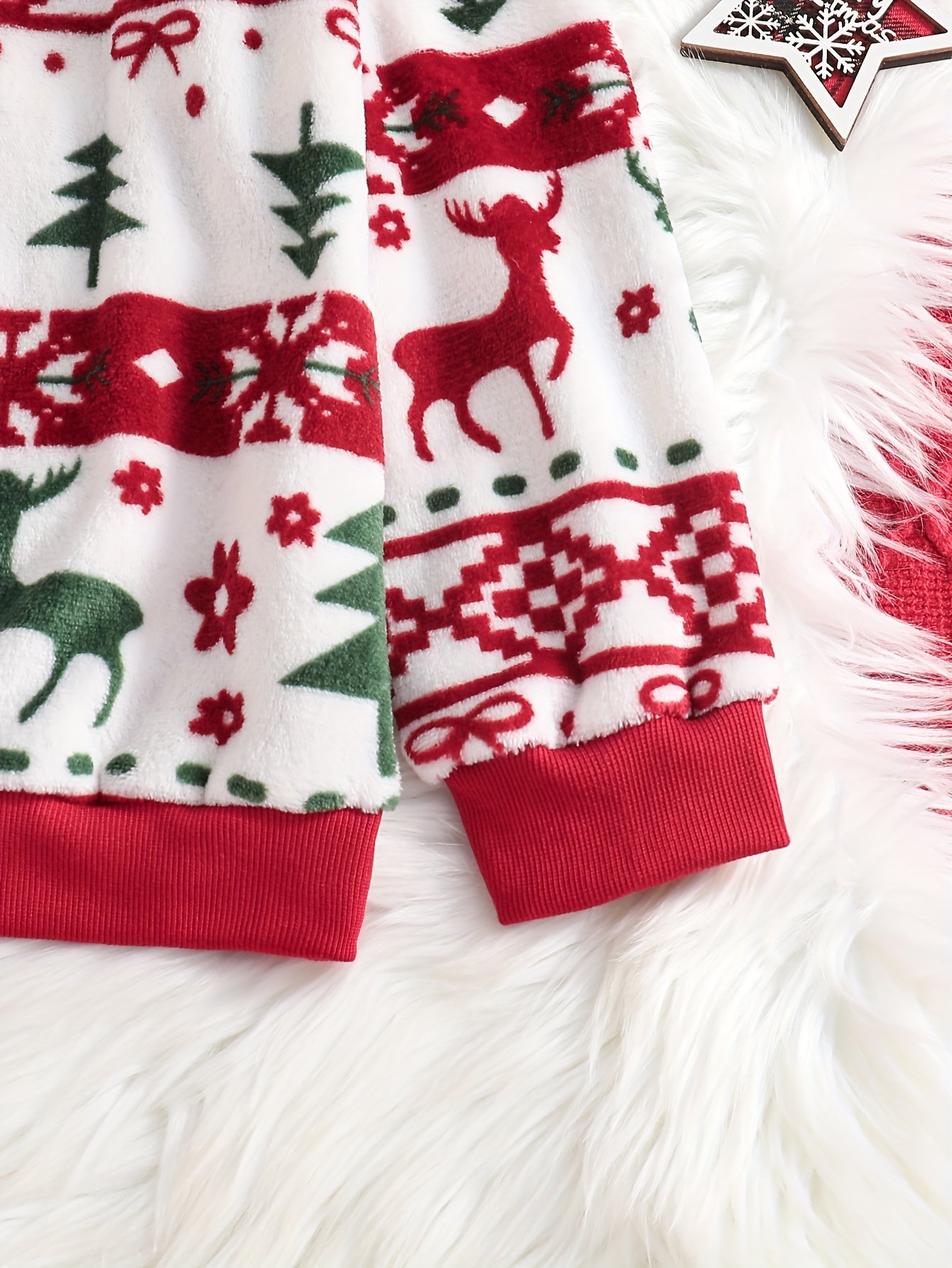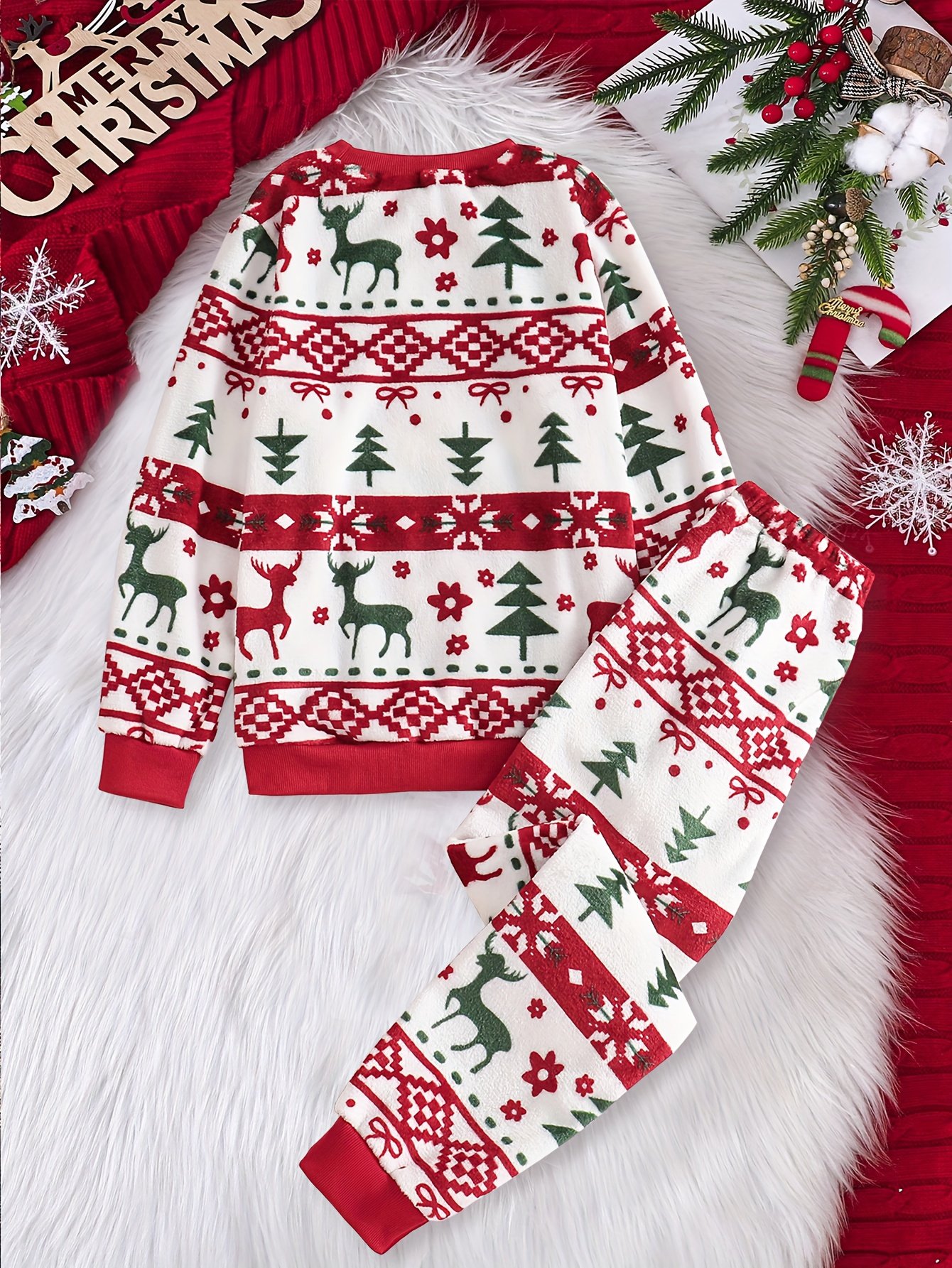 - تصميم شتوي ساحر: يأتيك هذا الطقم بتصميم “Color-Block” عصري ونقشات احتفالية مرحة لأشجار عيد الميلاد والغزلان، مما يضفي بهجة خاصة على إطلالة صغيرك ويجعله نجم كل مناسبة شتوية.