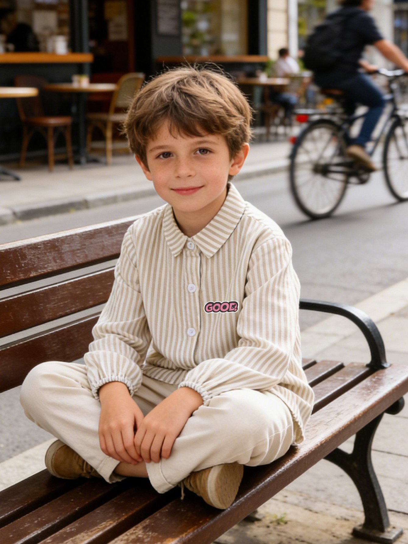 - تصميم عصري وأنيق: يتميز بنمط مخطط جذاب باللون الأزرق، وياقة “لابل” كلاسيكية، وتفاصيل أزرار متقنة، تضفي لمسة راقية على إطلالة صغيرك.
