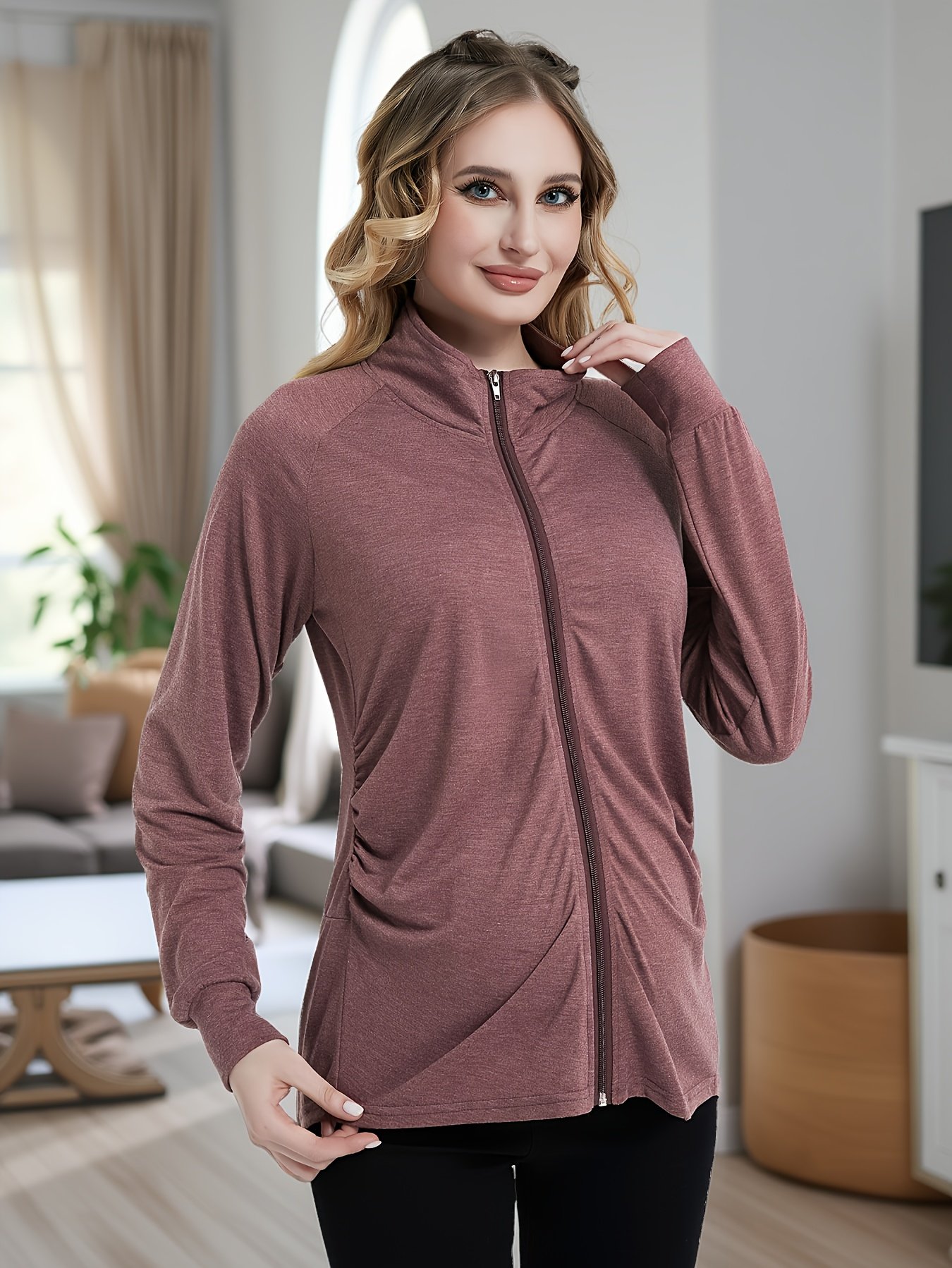 - جاكيت متعدد الاستخدامات: بتصميمه السادة الكلاسيكي، سحابه العملي والياقة القائمة، يمكنكِ تنسيقه بسهولة مع أي زي، سواء لإطلالة كاجوال أو أكثر رسمية.
