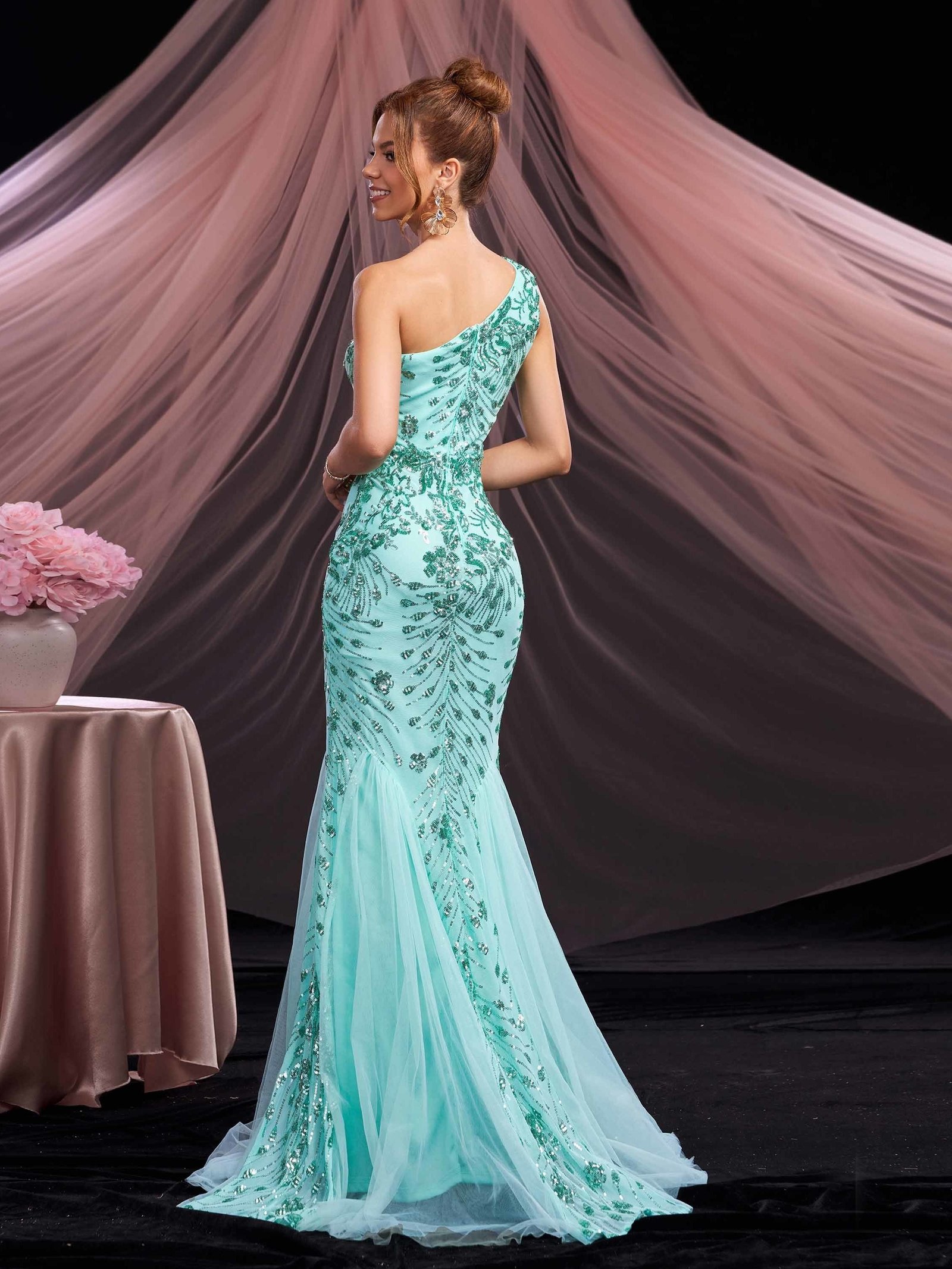 • تصميم بكتف واحد عصري: يُبرز جمالك بأسلوب جريء وفريد، مع قصة طويلة وضيقة (Bodycon) تبرز منحنيات جسمك بأناقة ساحرة.