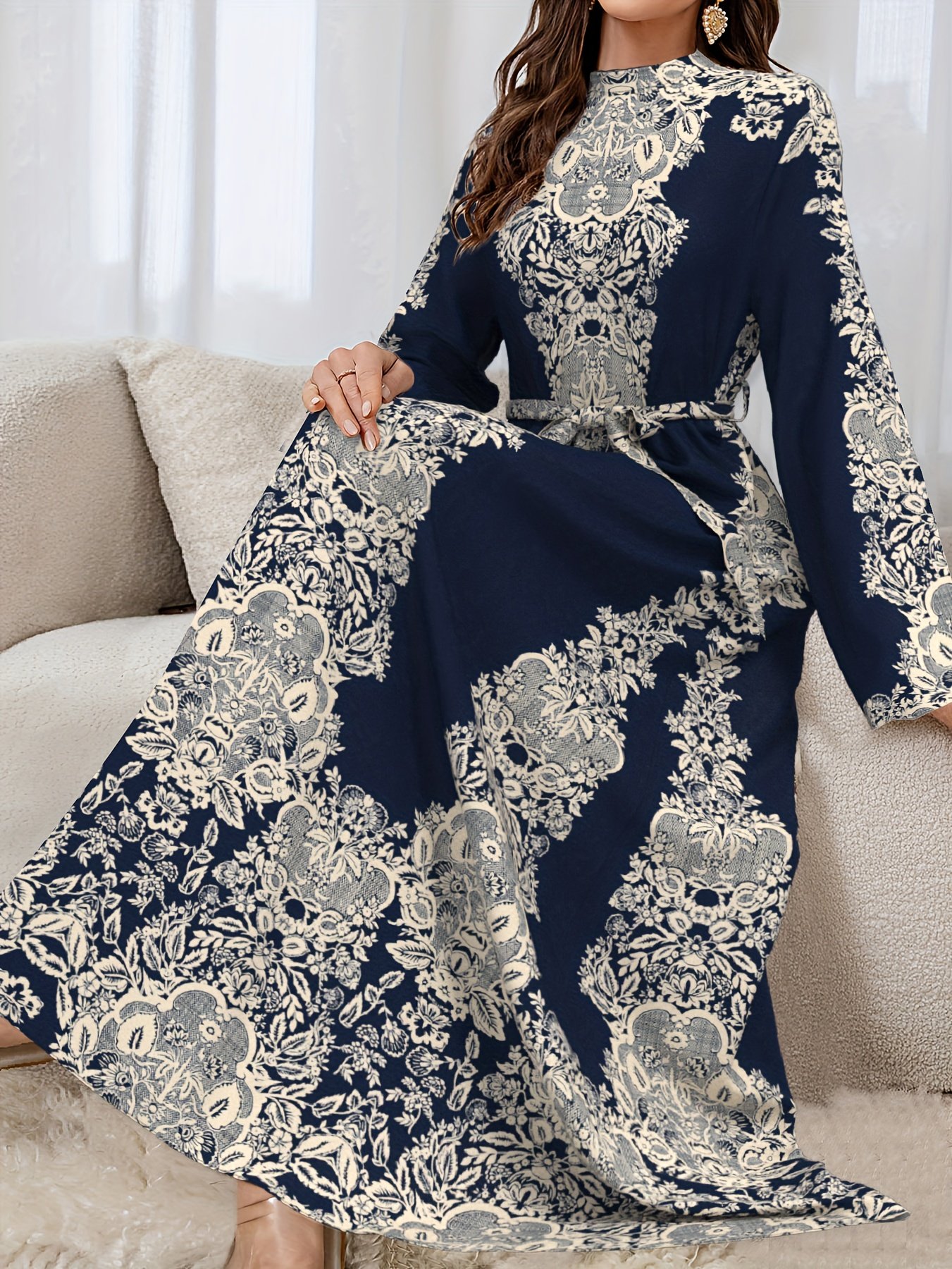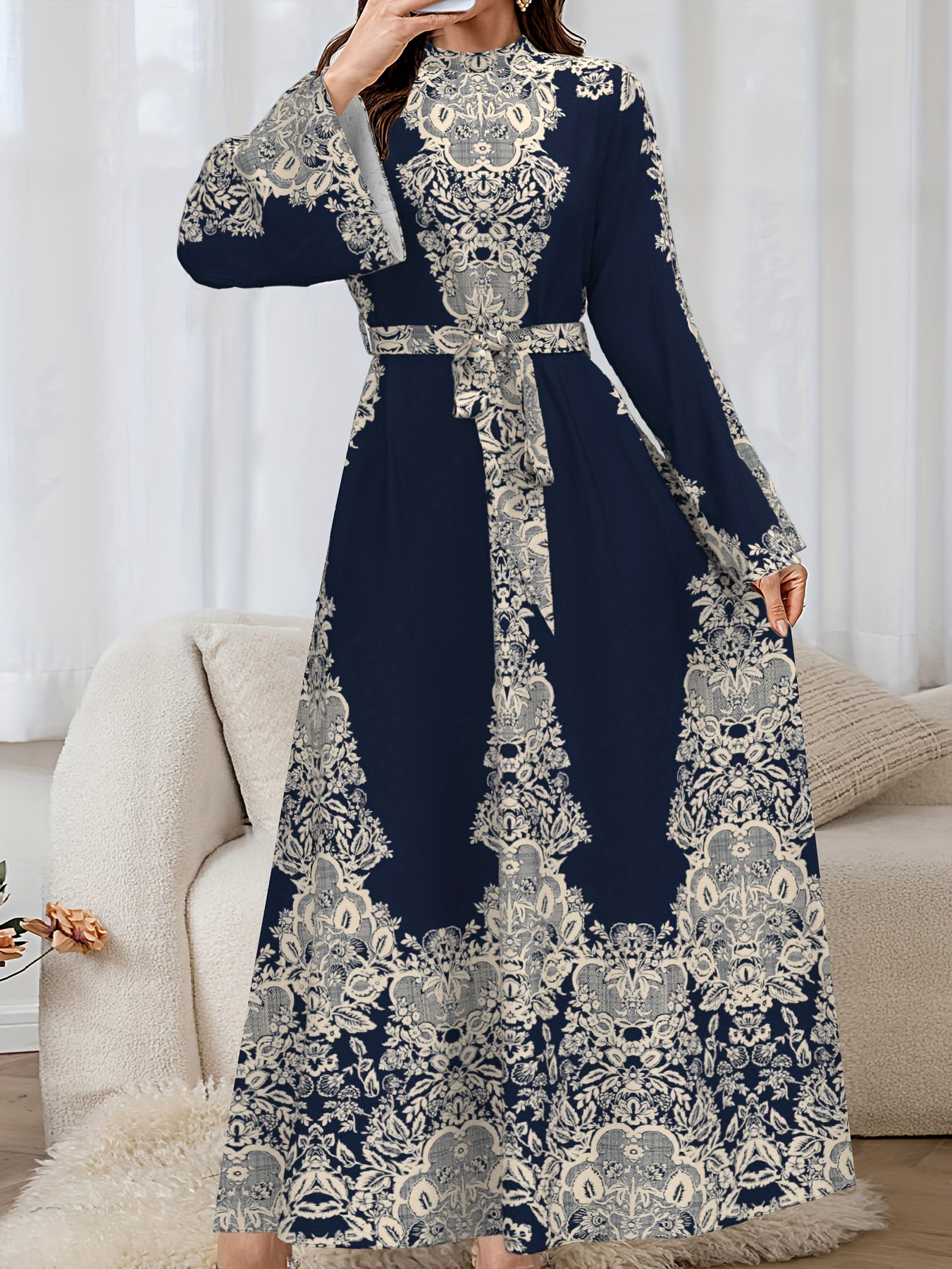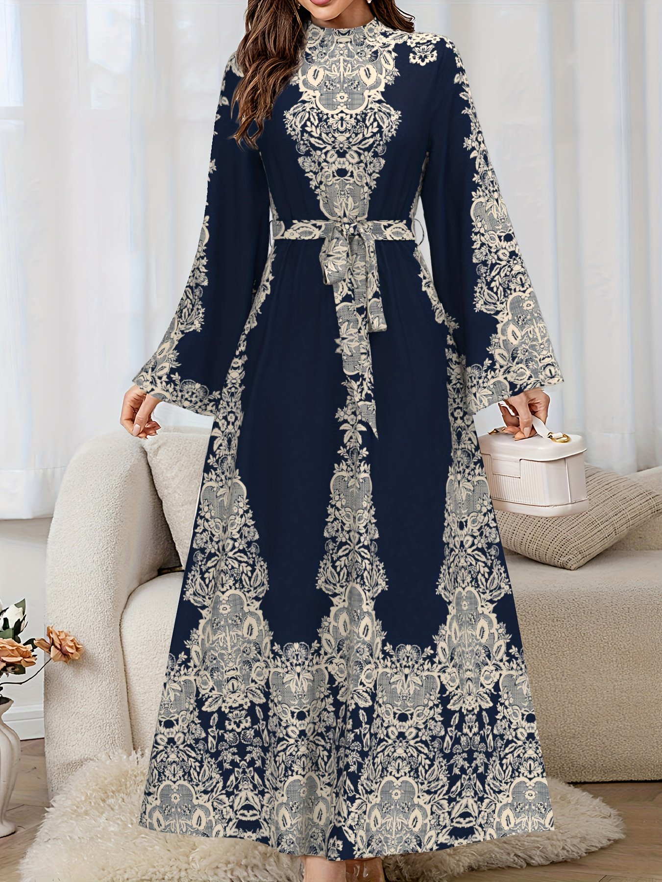- تصميم طويل ومهيب: ينسدل الفستان بأناقة على الأرض، مانحاً إطلالة ملكية ومحتشمة، ومناسباً للمناسبات الرسمية والاحتفالات على حد سواء، ليضفي عليكِ حضوراً لا يُنسى.