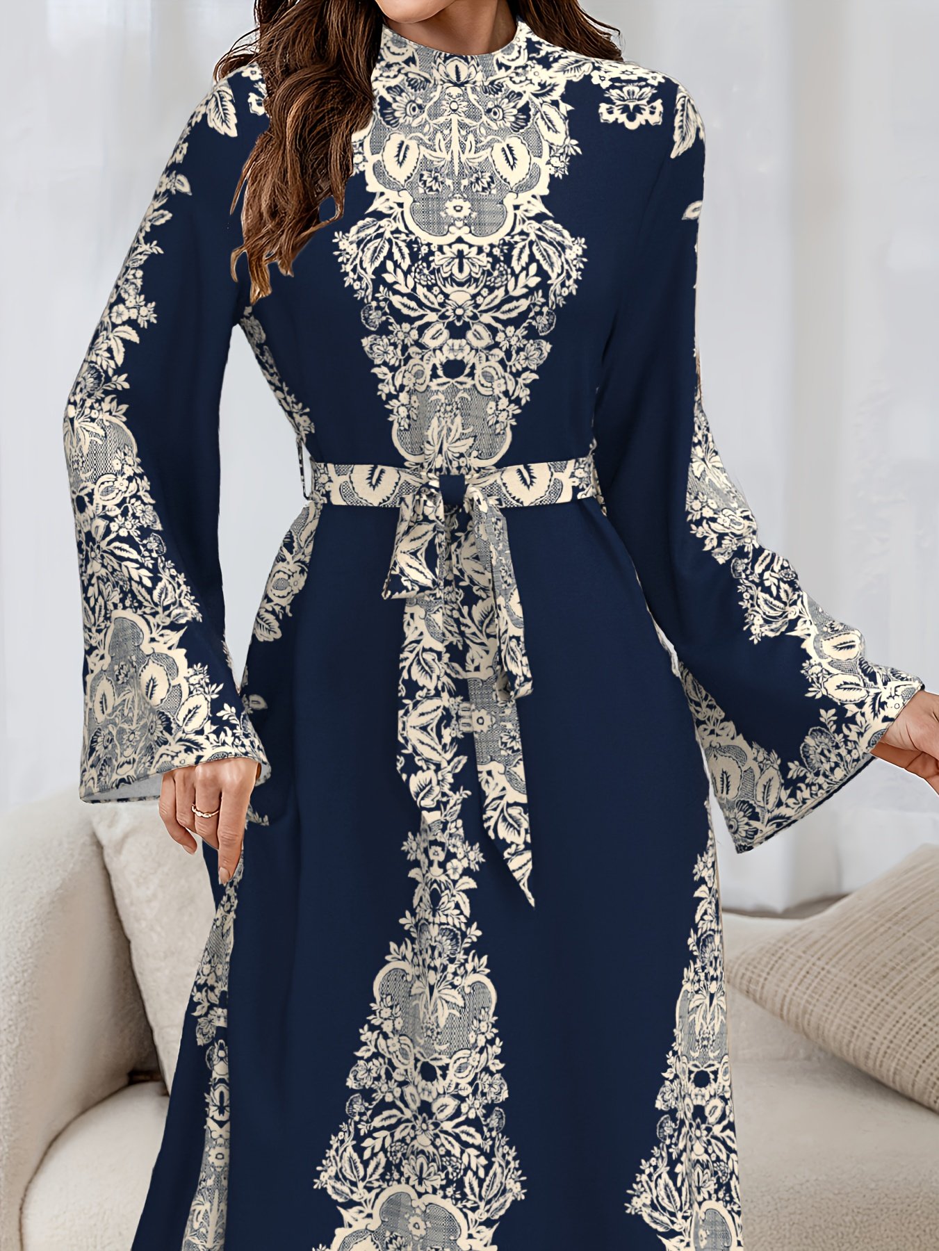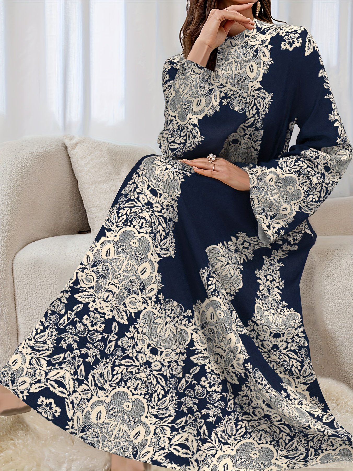 - أكمام طويلة ذات كسرات ساحرة: أكمام طويلة بتصميم واسع ومرهف (Flutter sleeve) تضفي حركة أنيقة ولمسة أنثوية ناعمة، مع الحفاظ على الأناقة والاحتشام.