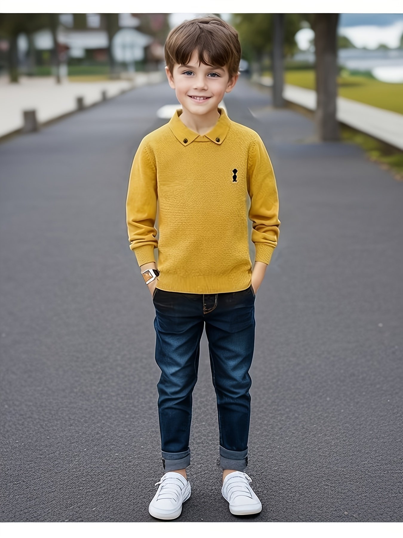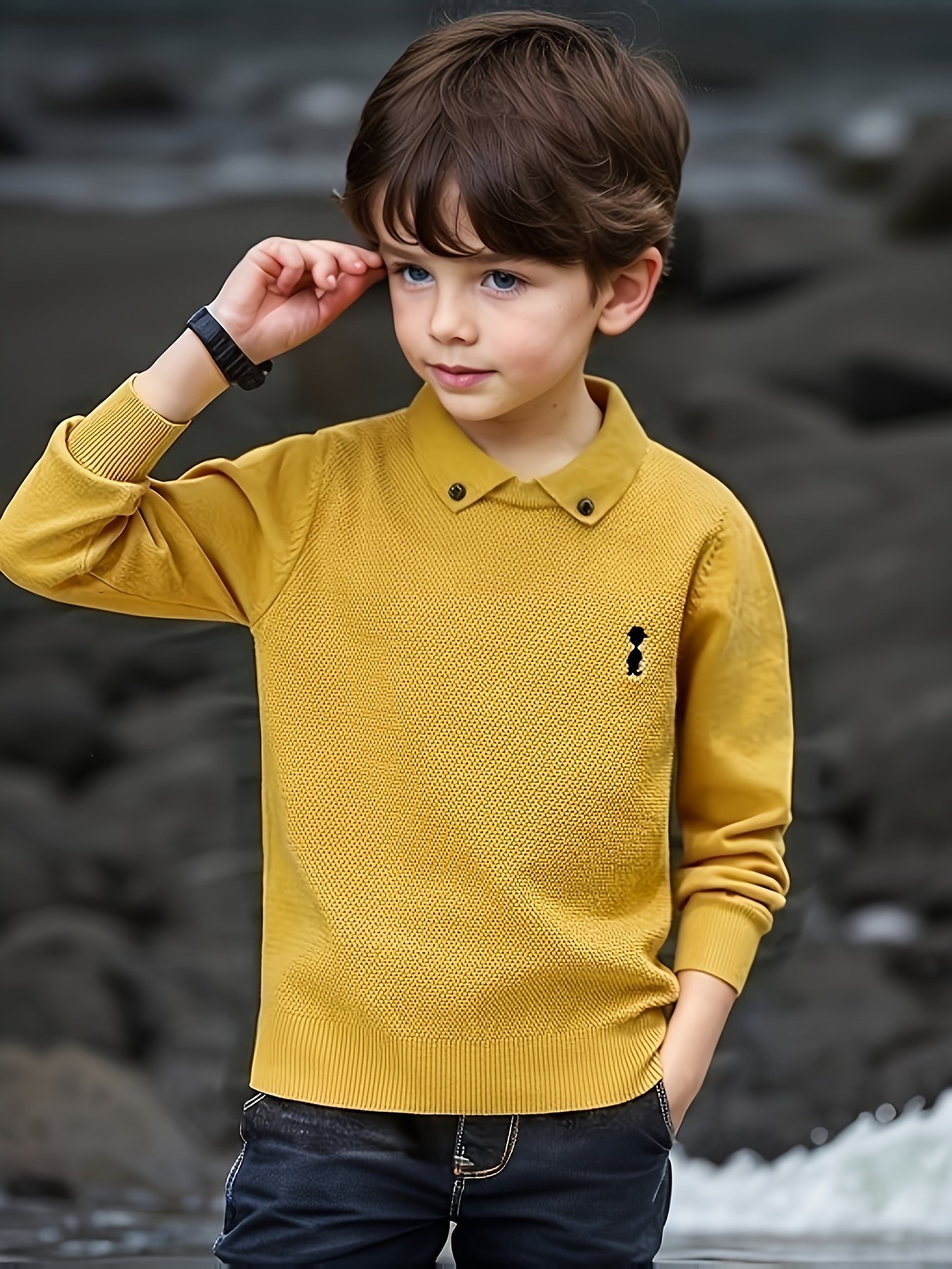 • سهولة الارتداء بلمسة أنيقة: تصميم سهل الارتداء (بلوفر) مع تفاصيل أزرار تكميلية تضيف لمسة عملية وجمالية في آن واحد، مما يسهل على ابنك ارتداءه وخلعه بنفسه بكل سهولة.