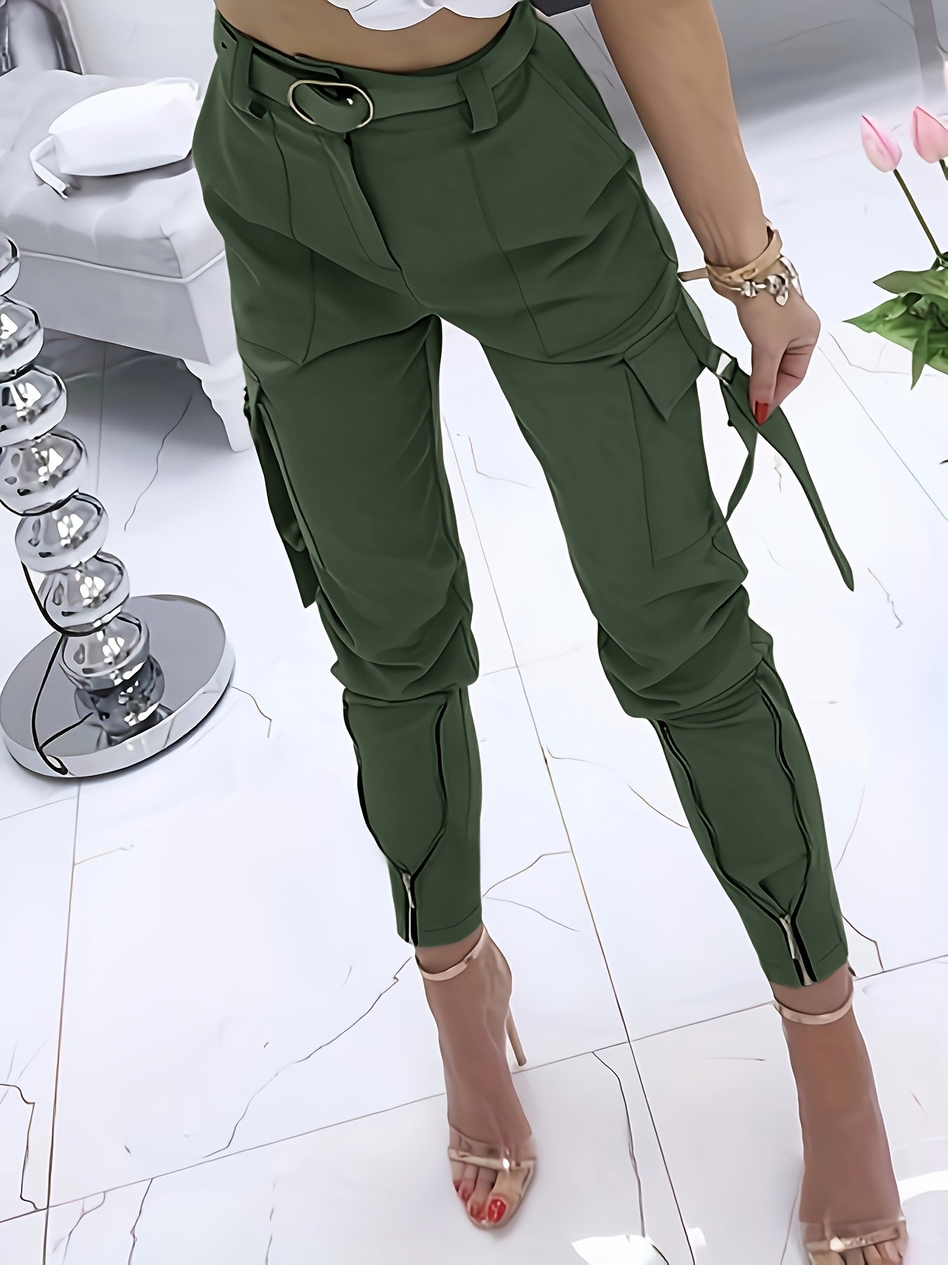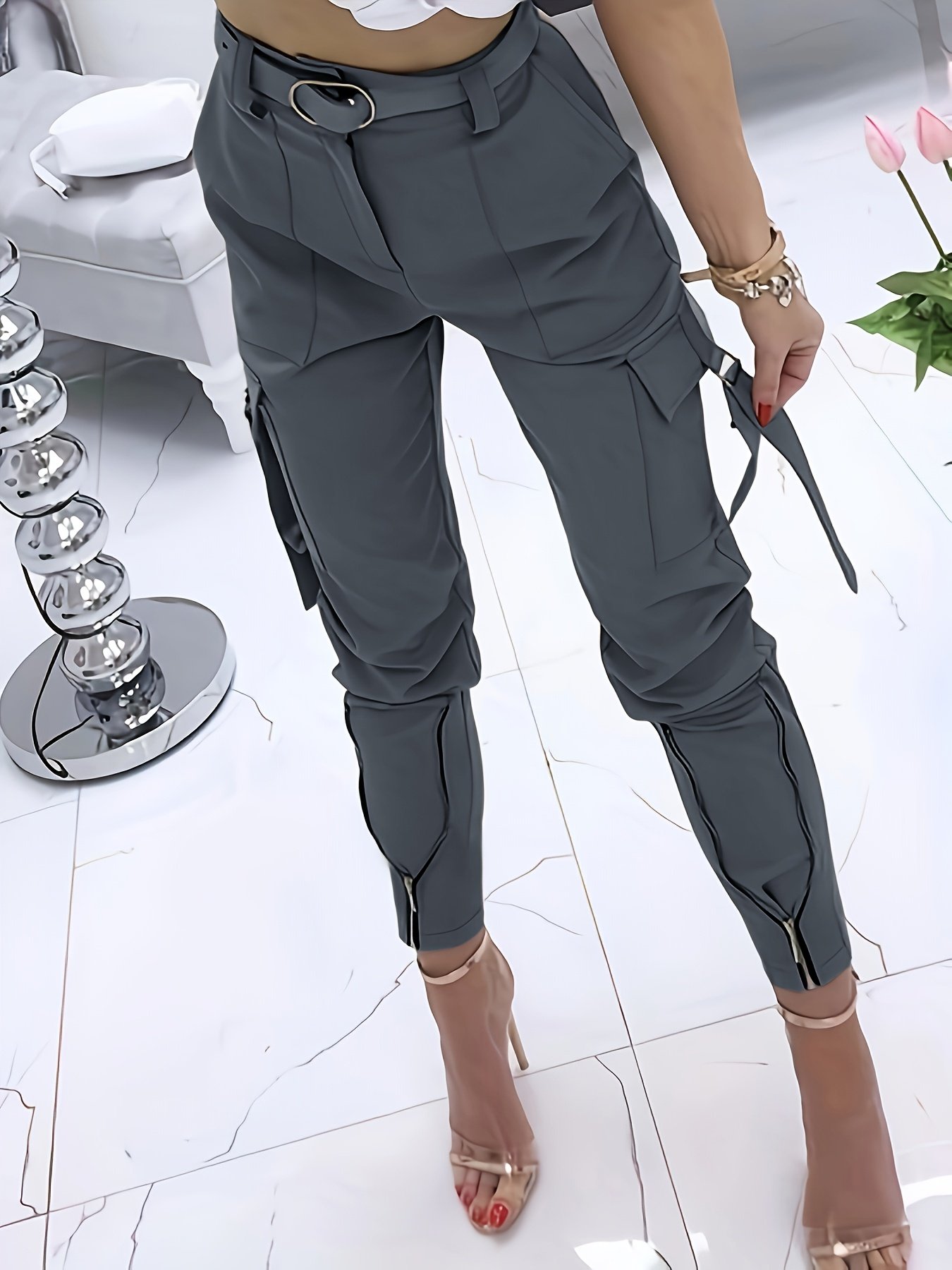 - تصميم أنيق وعصري: بنطلون كارجو بقصة ملائمة تبرز جمال قوامك، مع تفاصيل أزرار وسحاب تضفي لمسة عصرية وعملية.