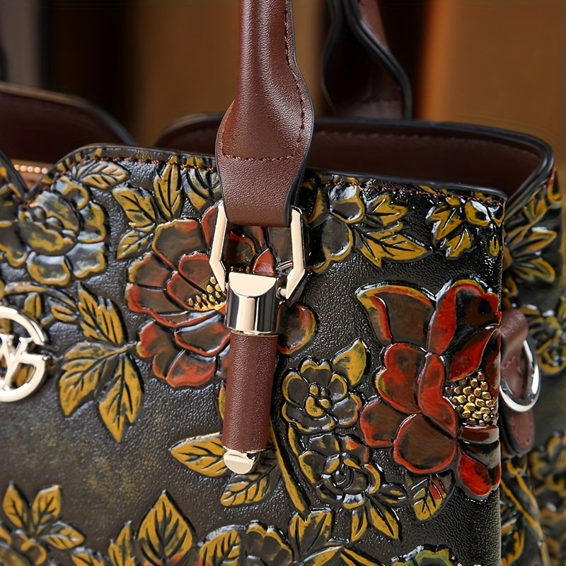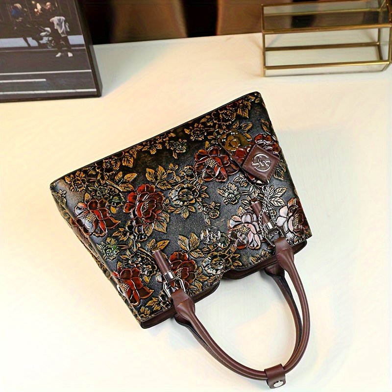 - نقوش الزهور البارزة: تتميز بتصميم زهري منقوش بمهارة فائقة ودقة متناهية، يضفي عليها لمسة فنية فريدة وأصالة تخطف الأبصار، مما يجعلها أكثر من مجرد حقيبة، بل قطعة فنية أنيقة تحملينها.