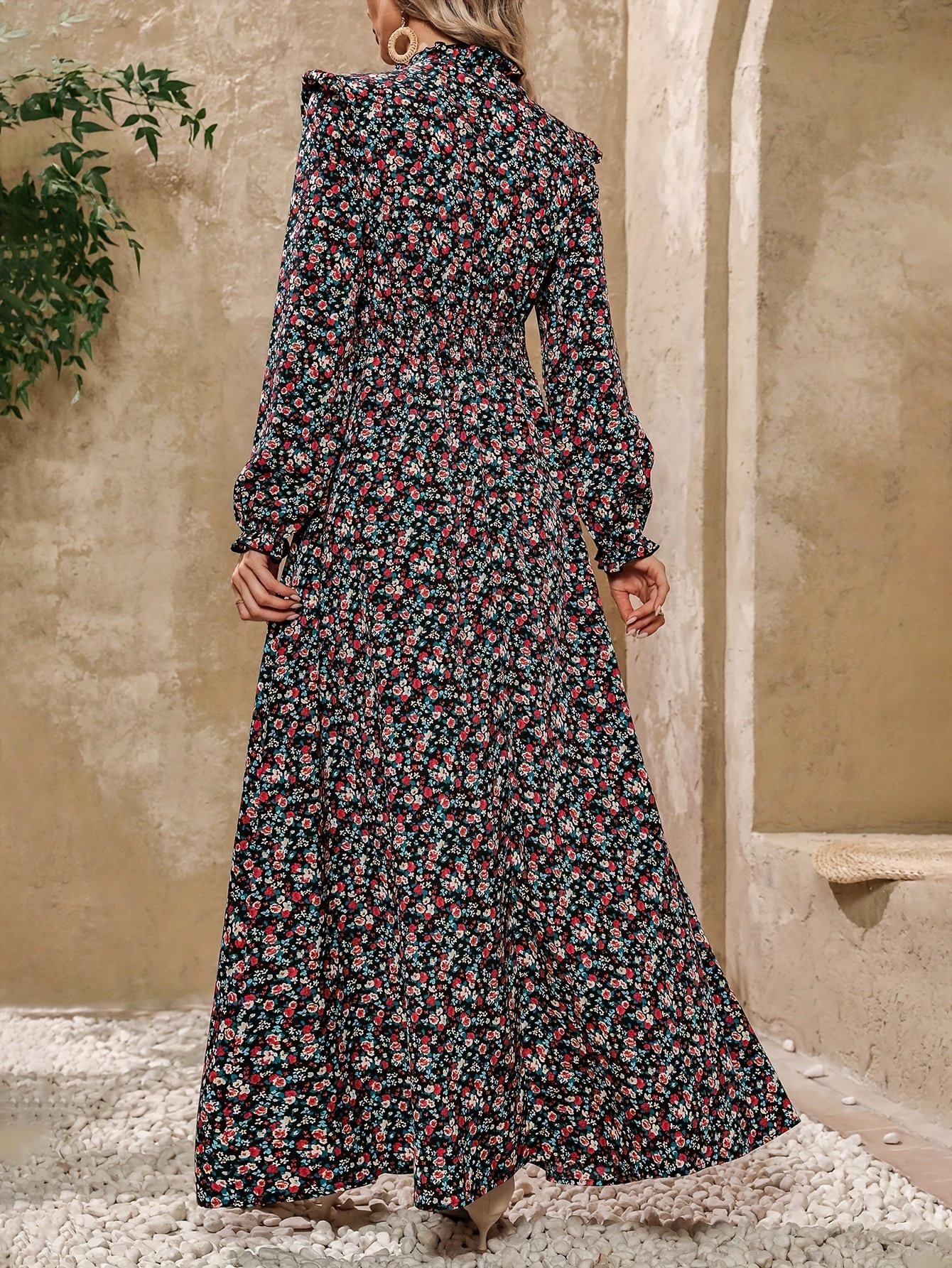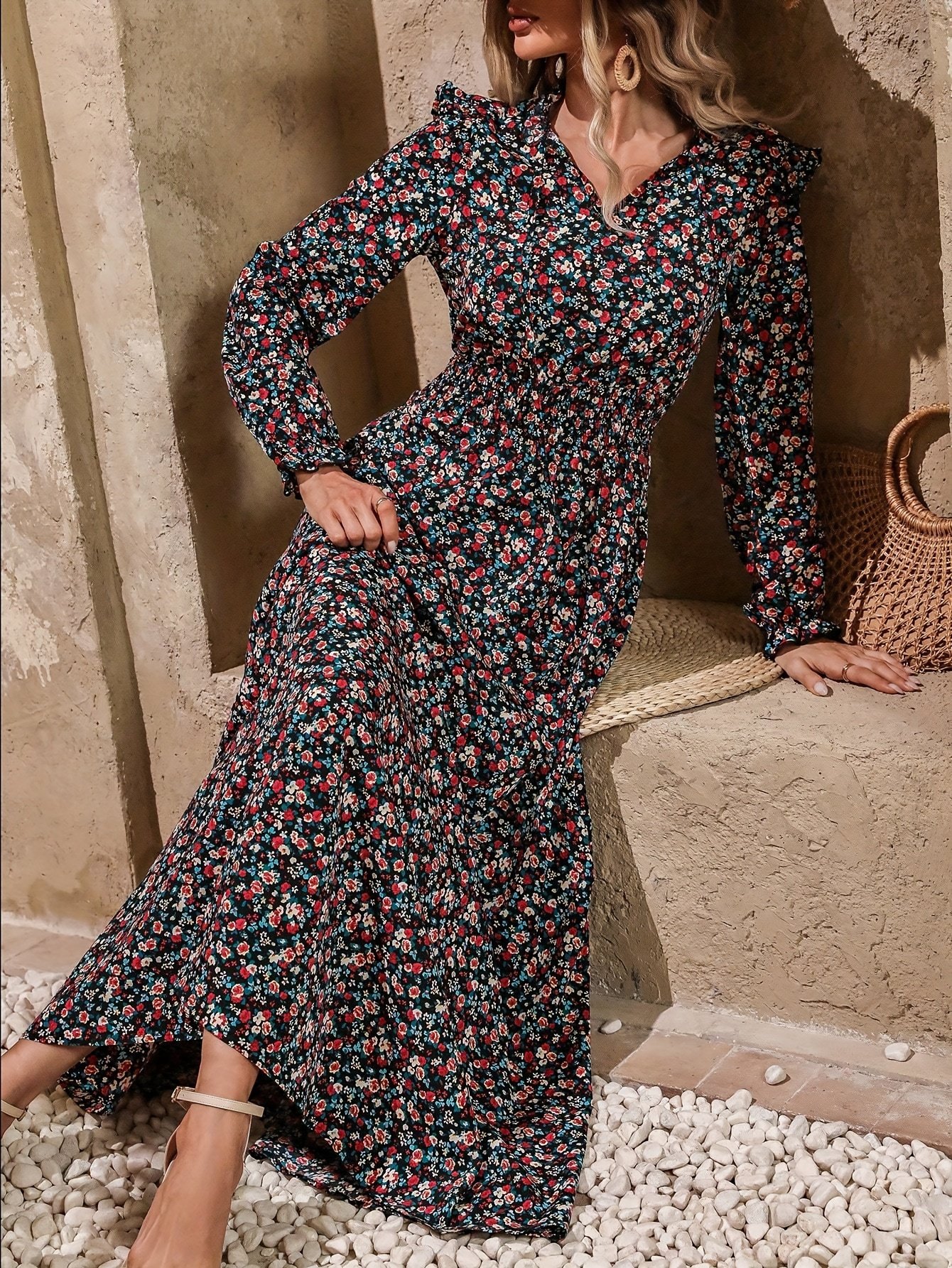 - نقوش زهرية آسرة: يتميز الفستان بنقوش زهرية حيوية وعشوائية، تضفي عليه لمسة فنية فريدة وتجعلكِ متألقة في كل مناسبة.