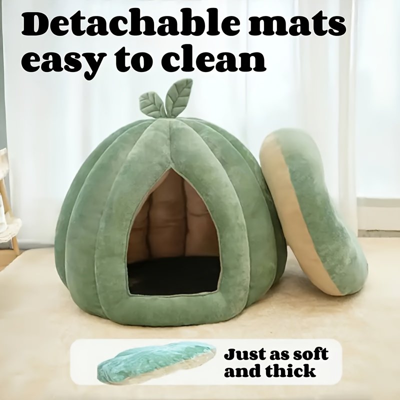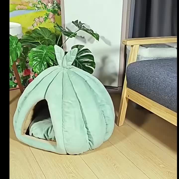 - تصميم اليقطين الفريد والأنيق: شكل دائري مستوحى من اليقطين بلون أخضر جذاب، يضفي لمسة من البهجة والجمال على ديكور منزلك، ويمنح قطتك مكانًا خاصًا ومميزًا للنوم واللعب.