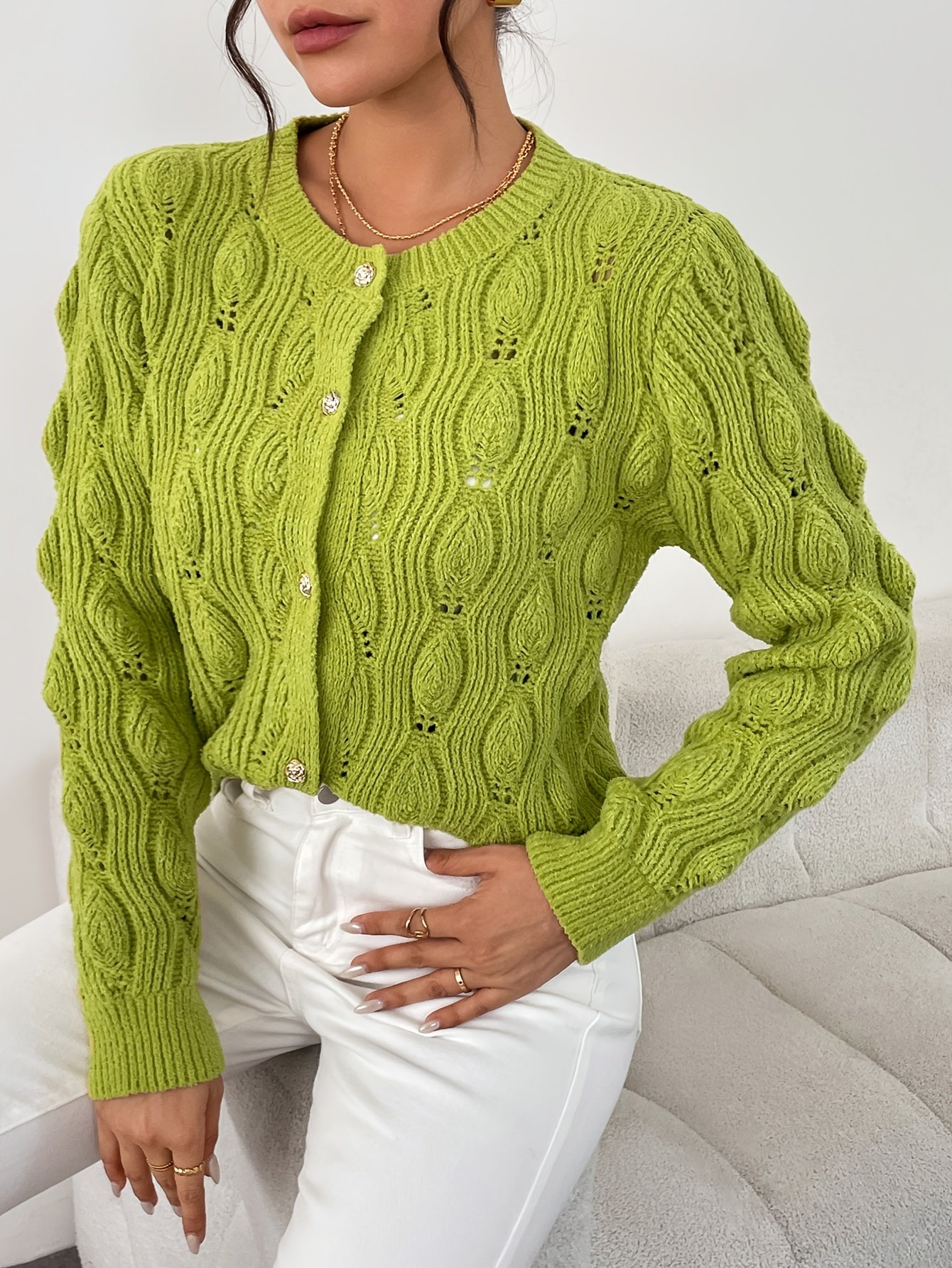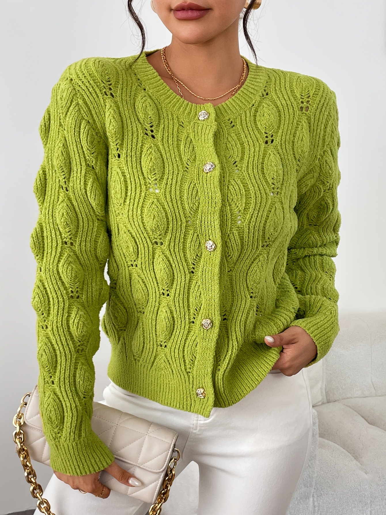 - تصميم فريد وأنيق: يتميز بتفاصيل مجوفة دقيقة وأزرار متناسقة تضفي لمسة من الرقي والجمال، مع إمكانية ارتدائه مفتوحًا أو مغلقًا لتناسب إطلالاتكِ المتعددة.