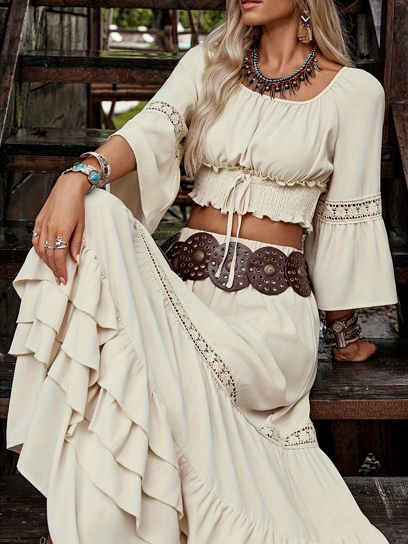 - تصميم يجمع بين الأصالة والمعاصرة: بلوزة قصيرة (Crop Top) عصرية بأكمام طويلة مزينة بكشكشة أنيقة، وتنسجم ببراعة مع تنورة ماكسي طويلة بحافة مكشكشة تضفي عليك إطلالة كلاسيكية رومانسية.