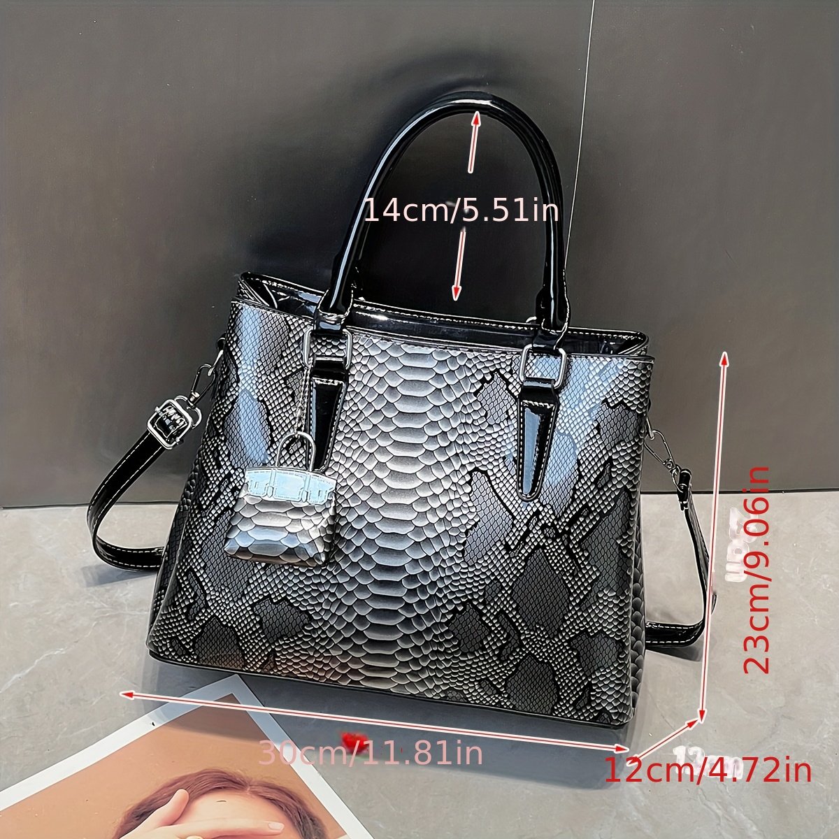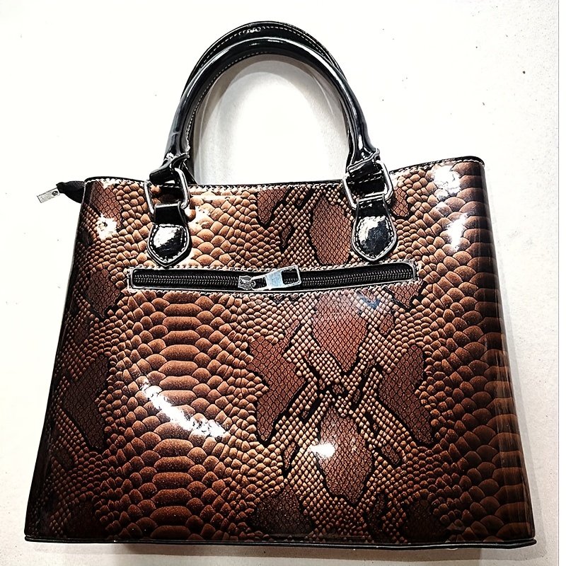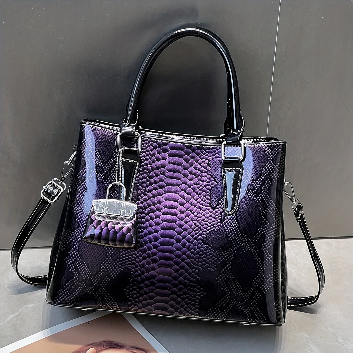 - تصميم آسر: نقشة الأفعى الجذابة وتدرج الألوان الساحر (الذهبي والبنفسجي) يمنحان حقيبتكِ تميزاً لا يضاهى ويجعلانكِ محط الأنظار.