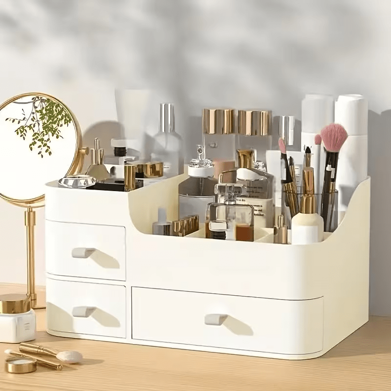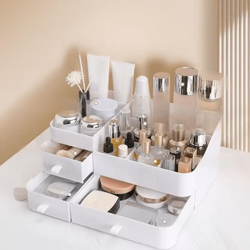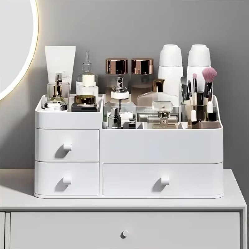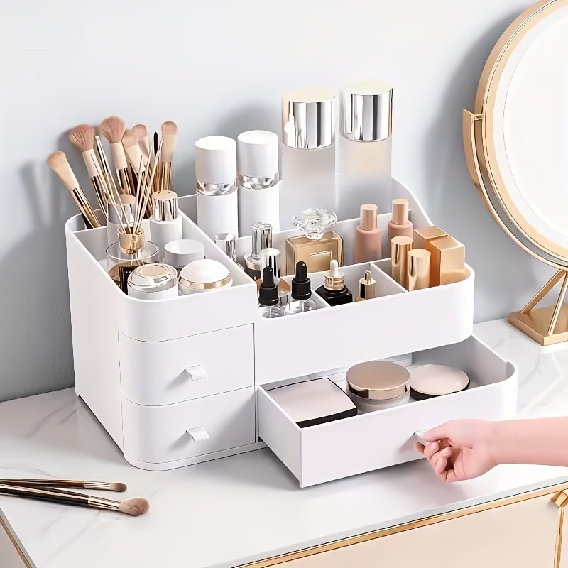 - سعة تخزين هائلة: لا مزيد من البحث عن أدواتكِ! مصمم لاستيعاب مجموعتكِ الكاملة من المكياج، الفرش، المستحضرات، وحتى المجوهرات، ليضمن بقاء كل شيء في متناول يدكِ ومنظمًا بشكل لا مثيل له.