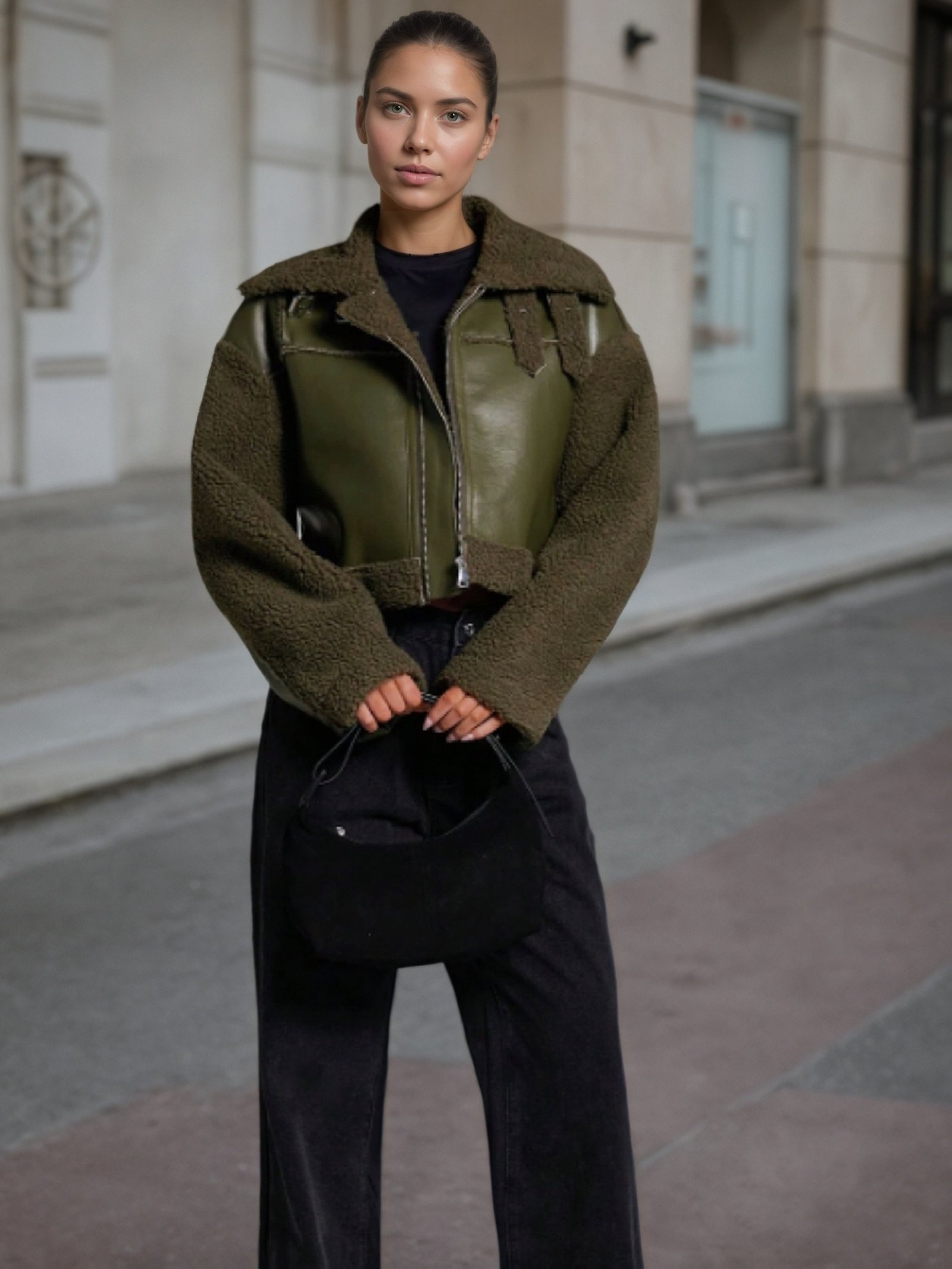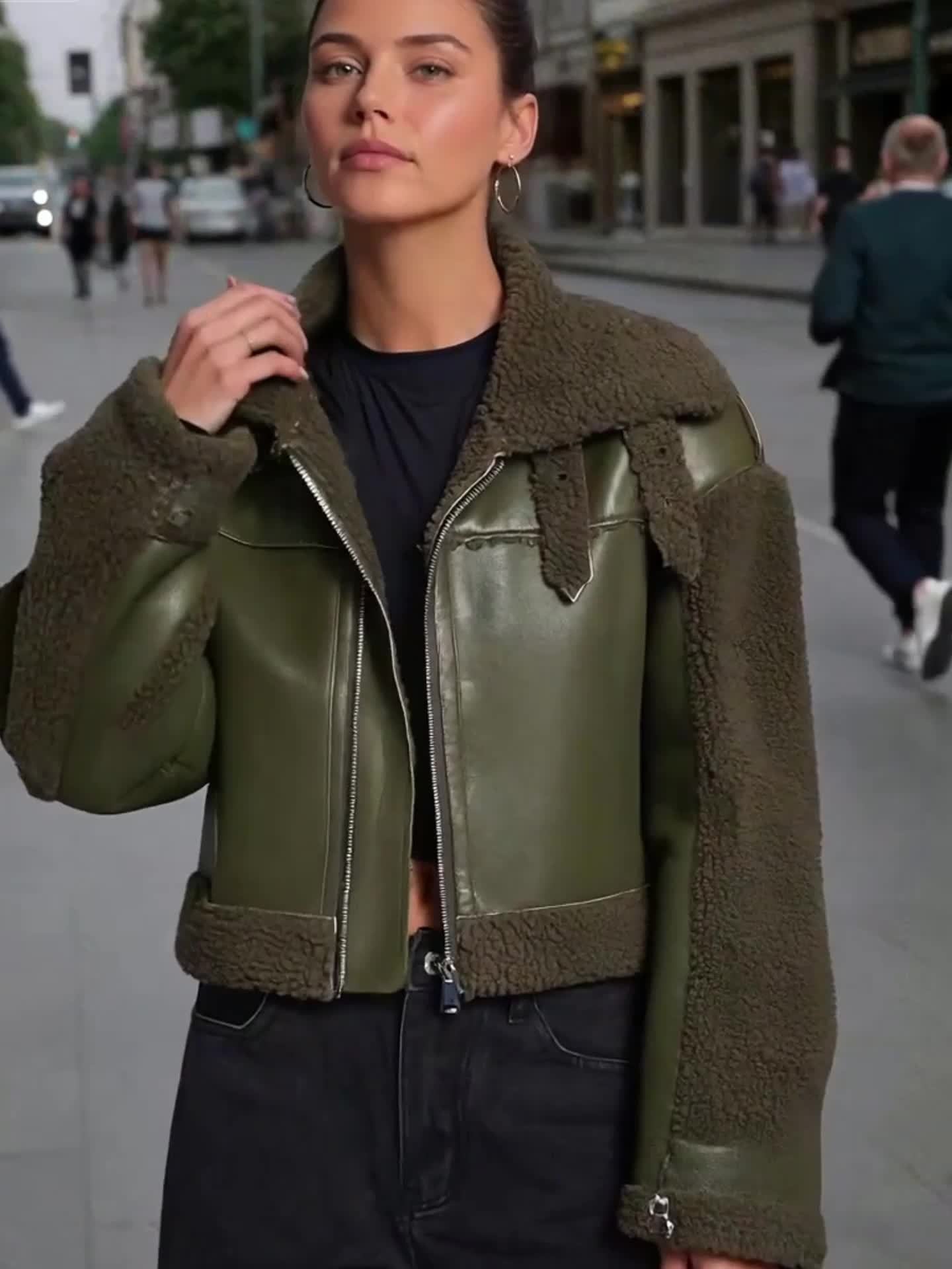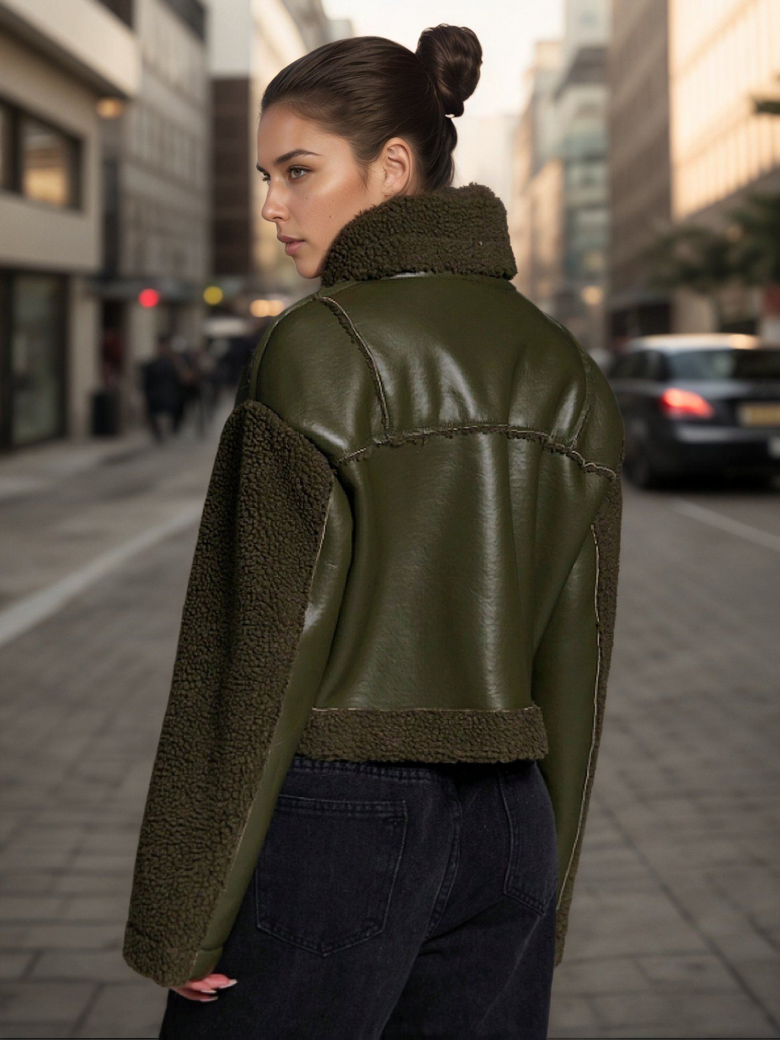 - تصميم مستوحى من الدراجات النارية بلمسة فينتاج: يتميز بقصة “بايكر” العصرية وتفاصيل السحاب الأمامية، ليضفي عليك إطلالة جريئة ومميزة تبرز شغفك بالمغامرة مع سحر الأناقة الكلاسيكية.