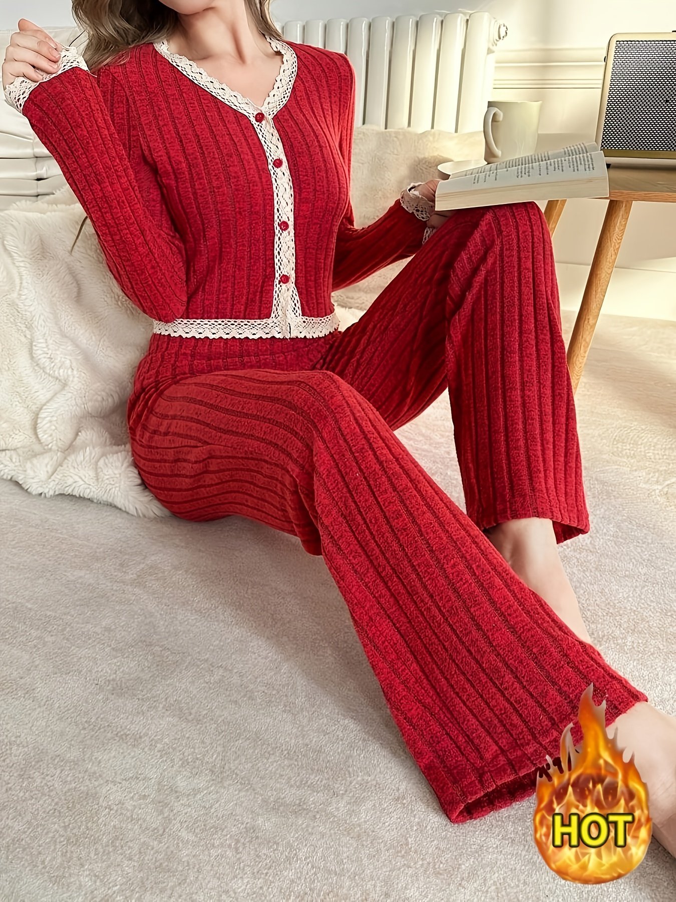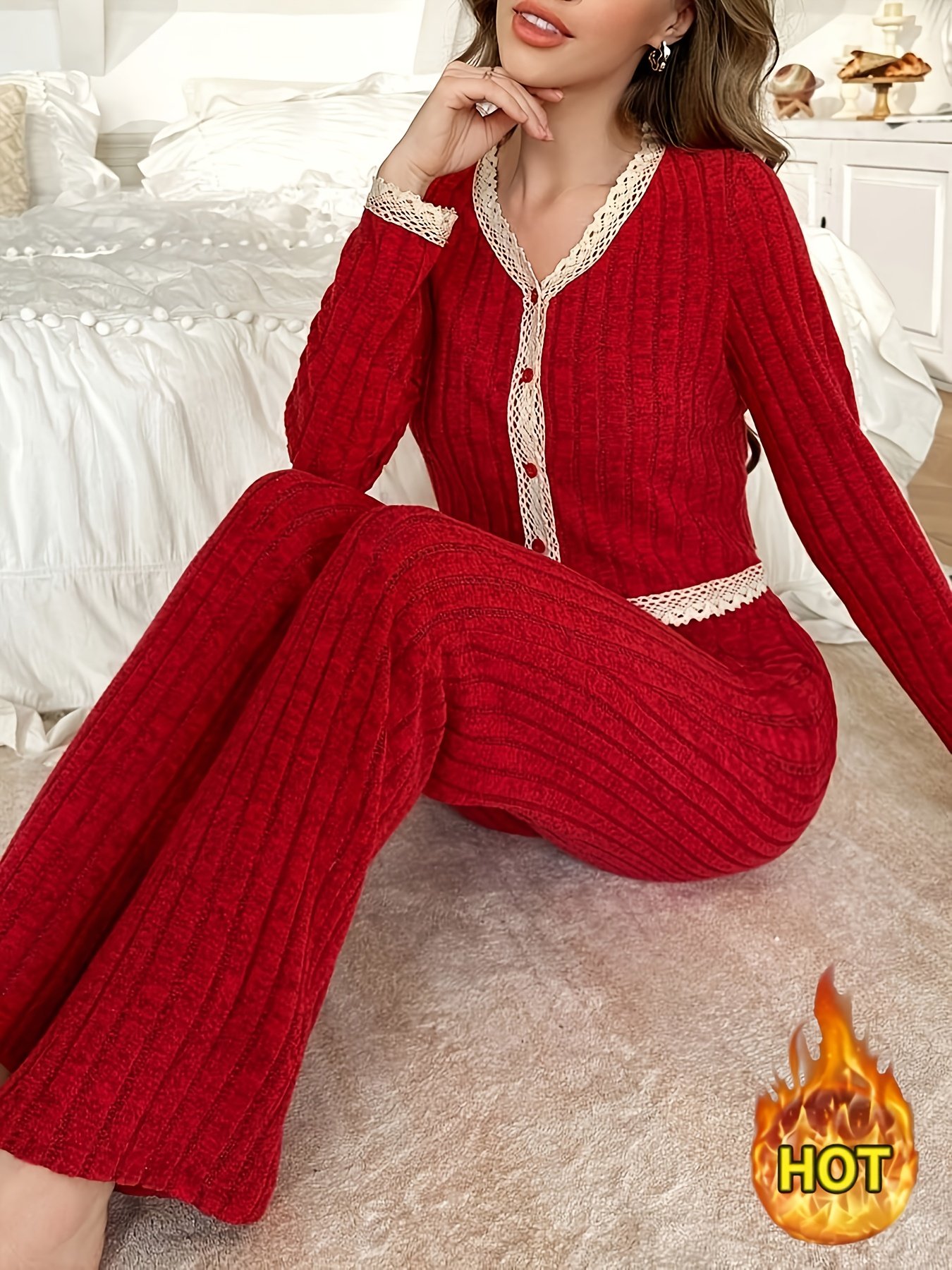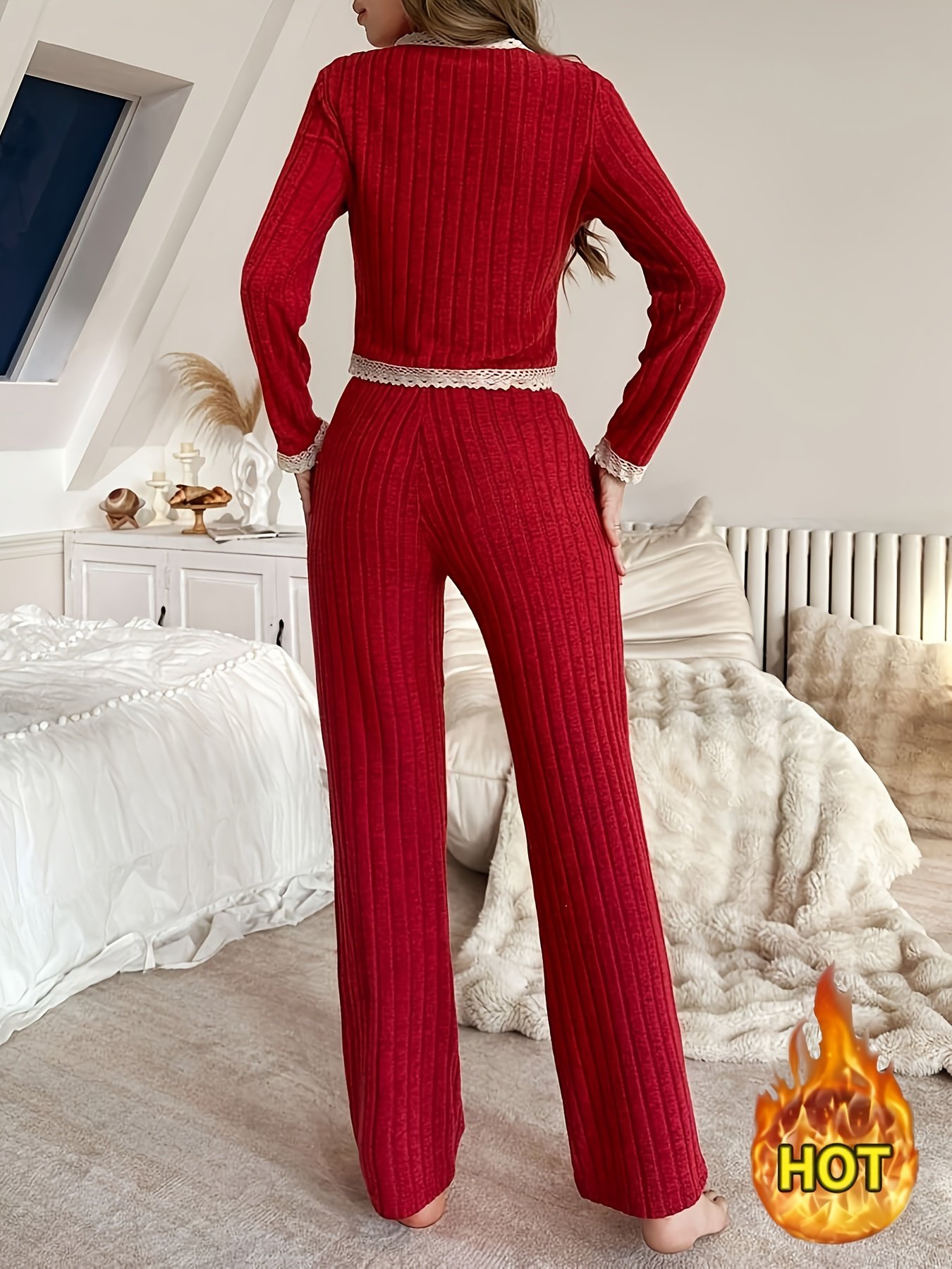 - راحة لا تضاهى بحرية حركة مطلقة: استمتعي بأقصى درجات الراحة مع هذا الطقم المكون من قطعتين، المصمم بمرونة دقيقة تتيح لكِ حرية كاملة في الحركة دون قيود. يضمن الخصر المطاطي للسروال ملاءمة مثالية وشعورًا بالراحة يدوم طوال الليل وخلال لحظات استرخائكِ.