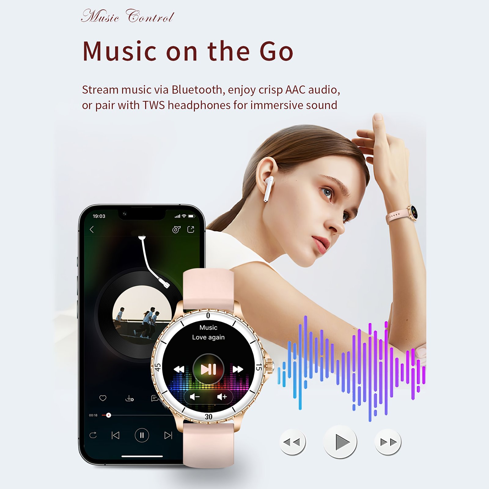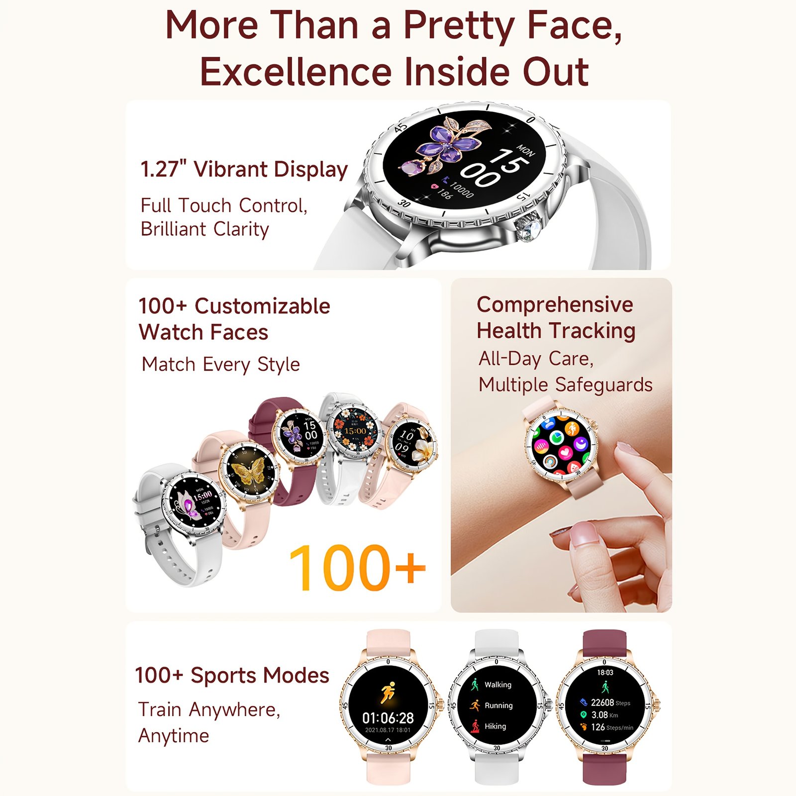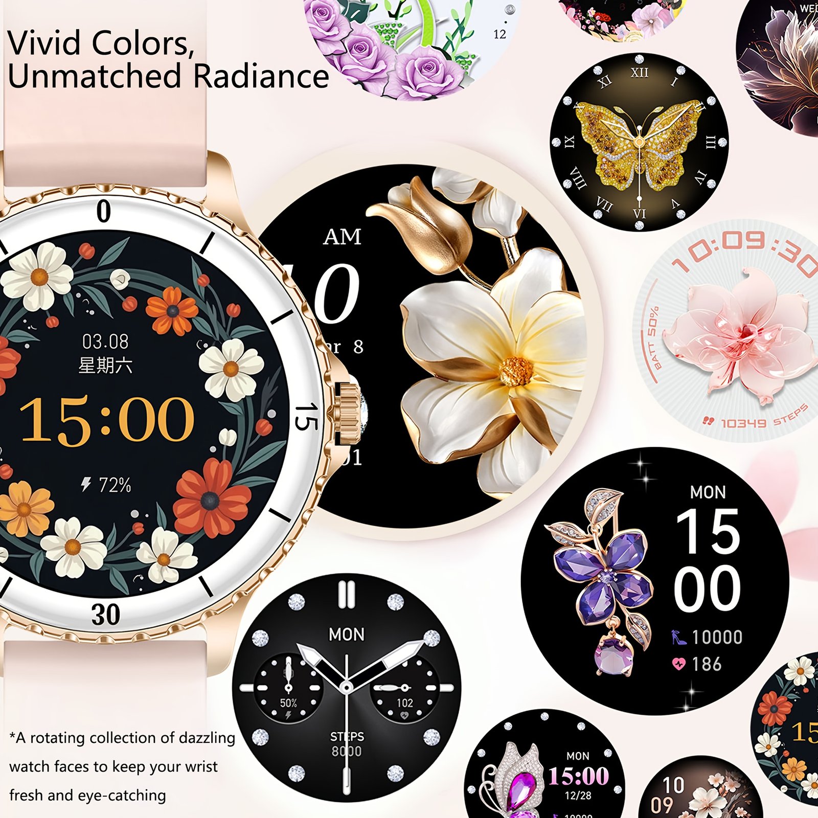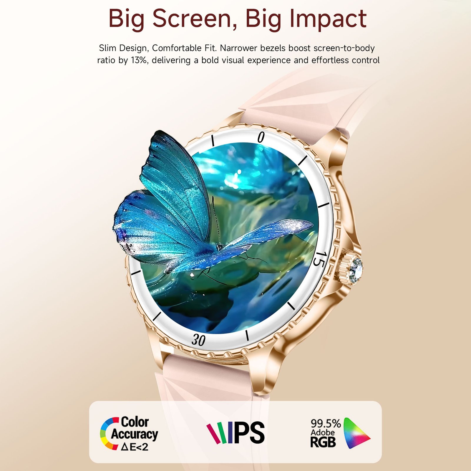- شاشة AMOLED نابضة بالحياة: استمتعي بتجربة بصرية مذهلة مع شاشة لمس كاملة فائقة الوضوح بحجم 1.27 بوصة، ودقة 360×360 بكسل ونسبة شاشة مدهشة تصل إلى 90%، لتقديم تفاصيل لا مثيل لها وواجهة استخدام سلسة.