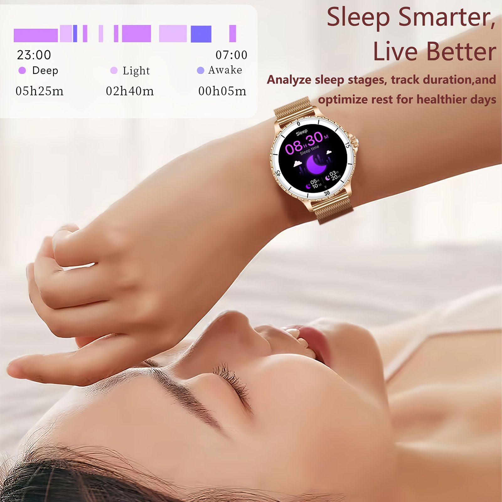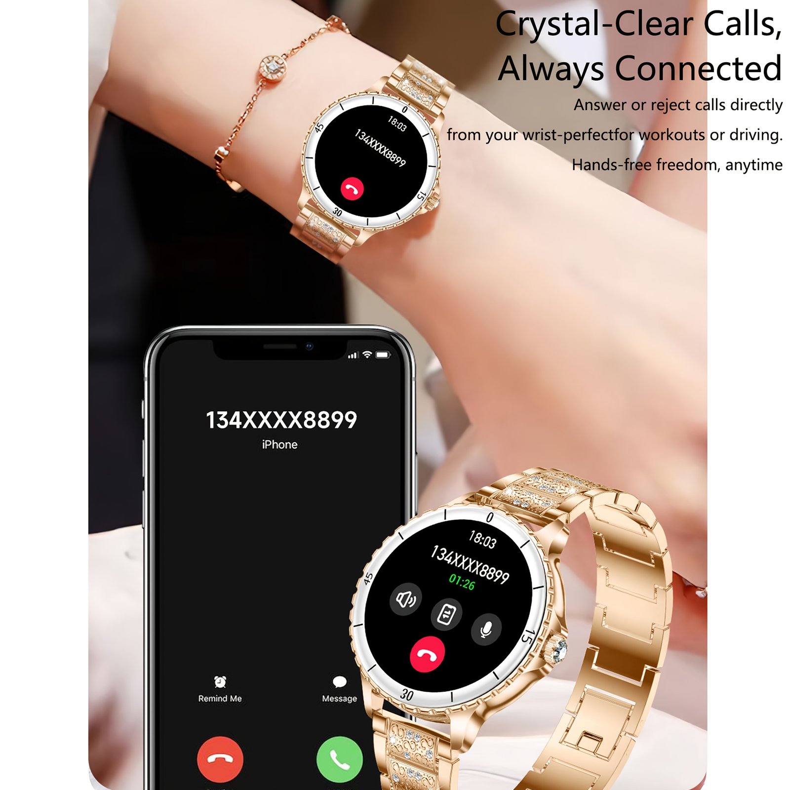 - اتصالات ذكية متكاملة: ابقي على اتصال دائم! يمكنكِ إجراء واستقبال المكالمات مباشرة من معصمك، بالإضافة إلى تلقي إشعارات الرسائل والتطبيقات بسلاسة، بفضل تقنية اللاسلكي 5.3 المتقدمة.