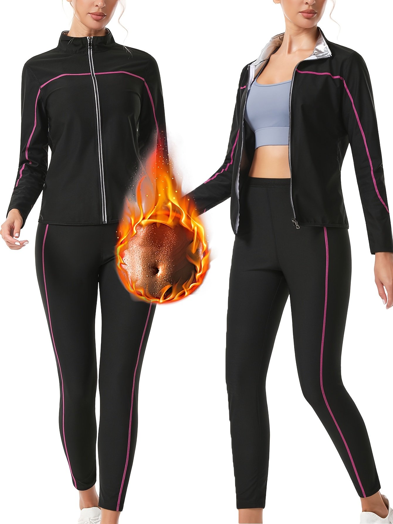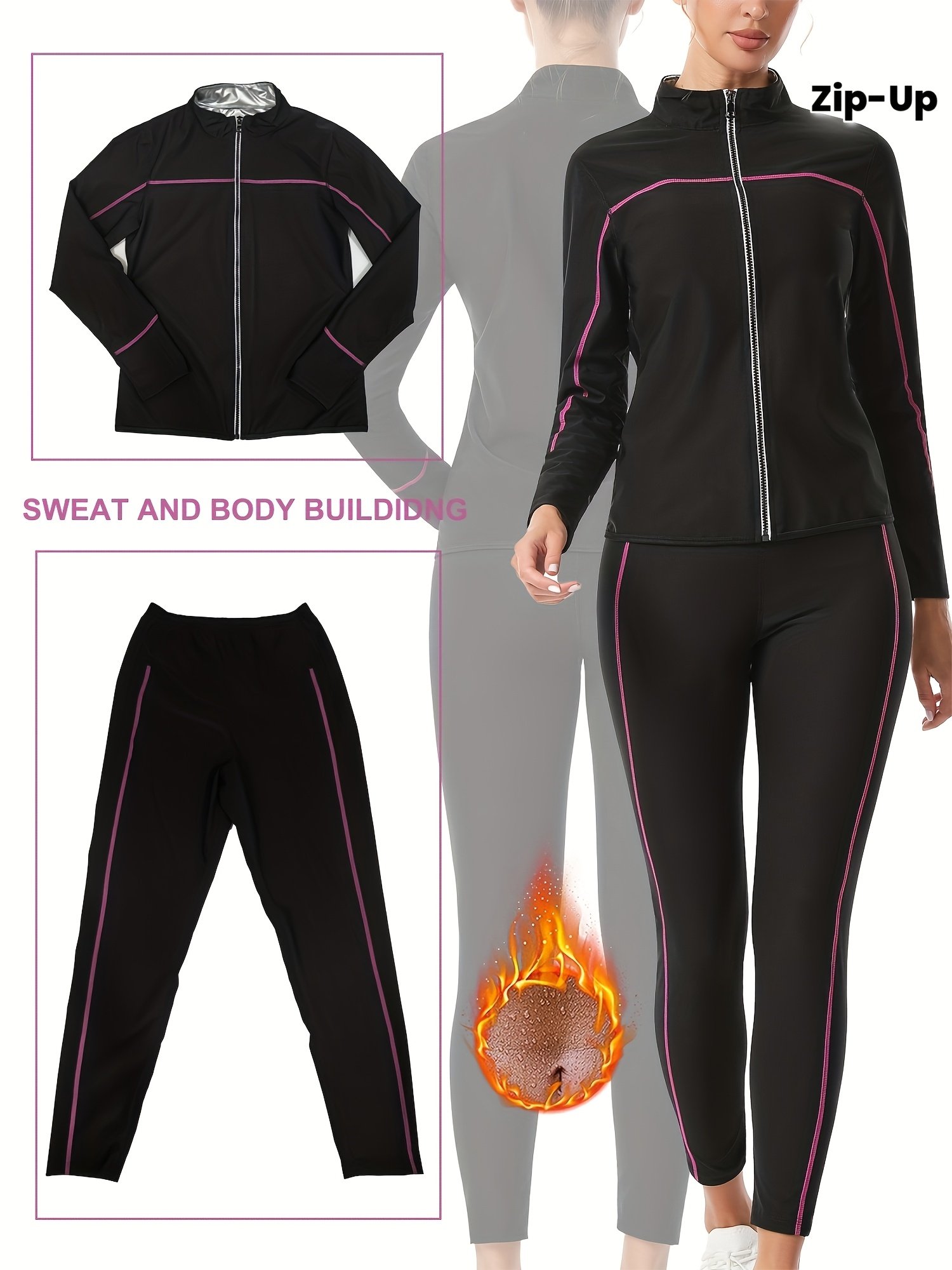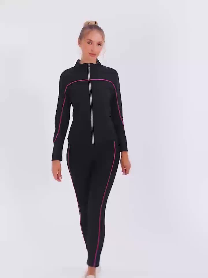 - طقم رياضي متكامل: يأتي الطقم كاملاً بقطعتين (جاكيت وبنطال) لضمان تغطية الجسم بالكامل وتعزيز فعالية التعرق في جميع مناطق الجسم المستهدفة.