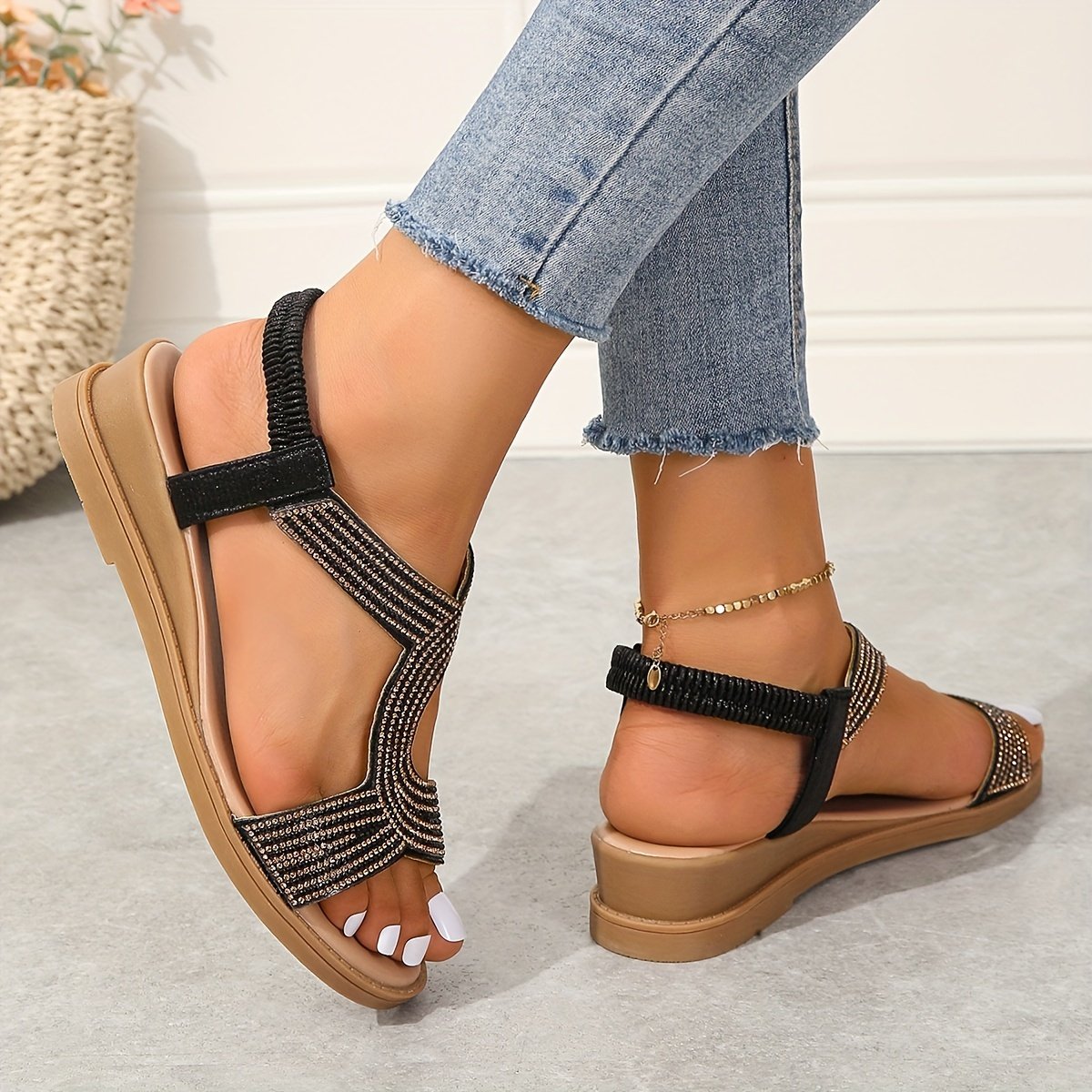 - سهولة الارتداء والخلع: بفضل حزام الكاحل المرن، يمكنكِ ارتداء الصندل وخلعه بسلاسة وراحة تامة، مع ضمان الثبات والأمان لقدميكِ طوال اليوم دون أي عناء.