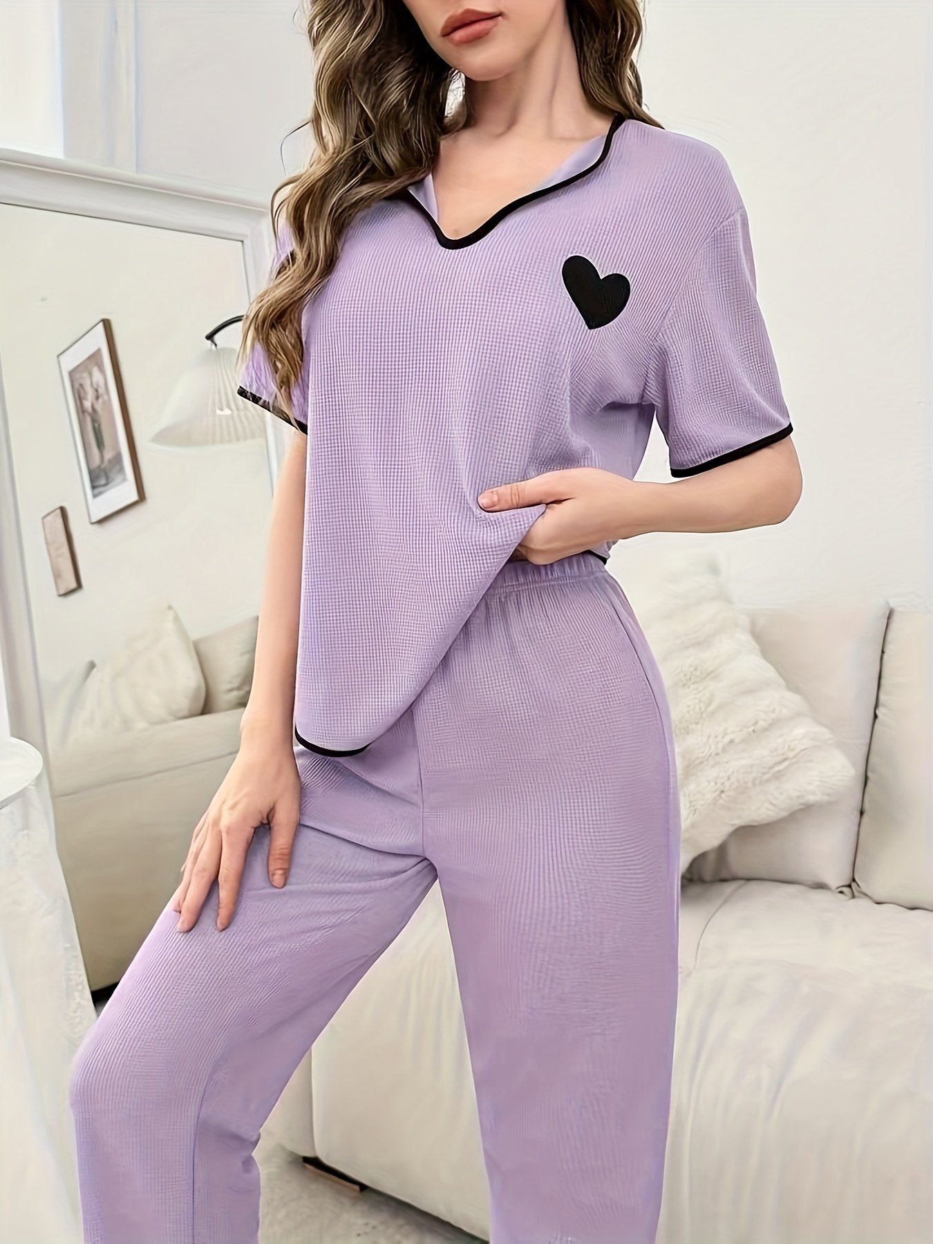 - تصميم أنثوي ساحر: يزدان بنقشة القلب الأنيقة التي تضفي لمسة من الرقة والبهجة على إطلالتكِ المنزلية، لتشعري بالجمال حتى في أوقات استرخائكِ.