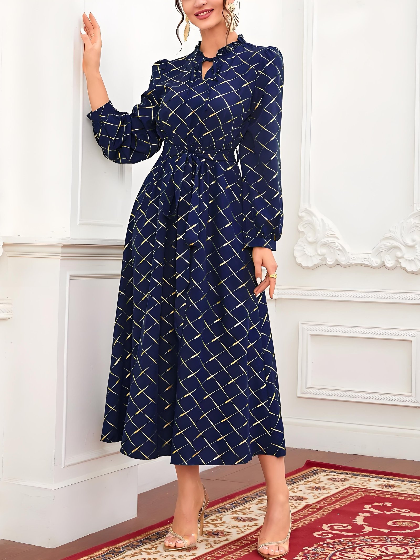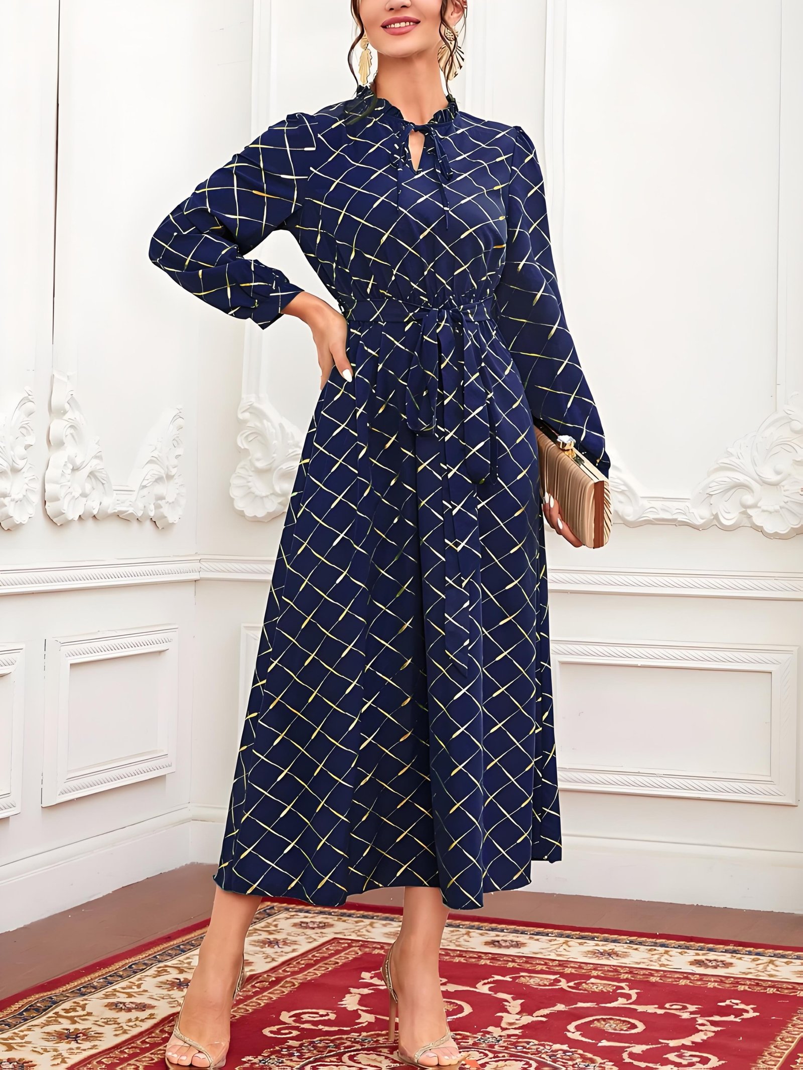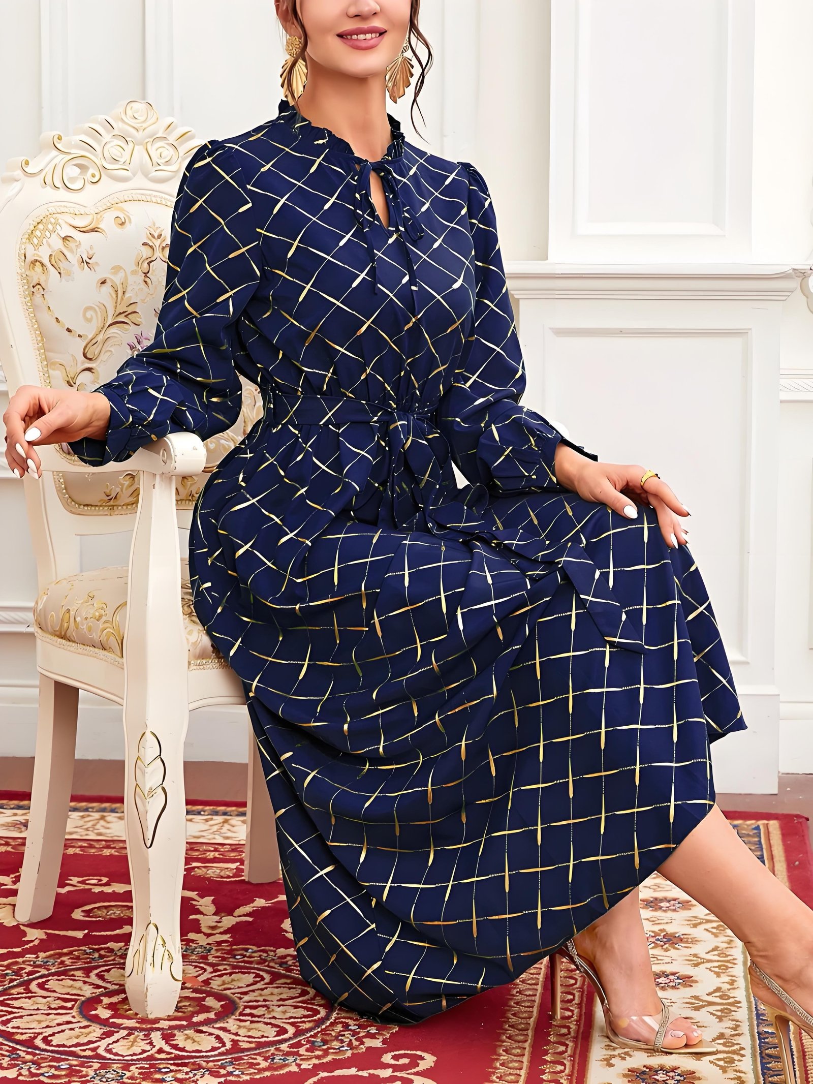 - ياقة قائمة أنيقة: تضفي القصة القائمة للياقة لمسة من الرقي والتميز على تصميم الفستان، مما يبرز أناقتكِ العصرية.