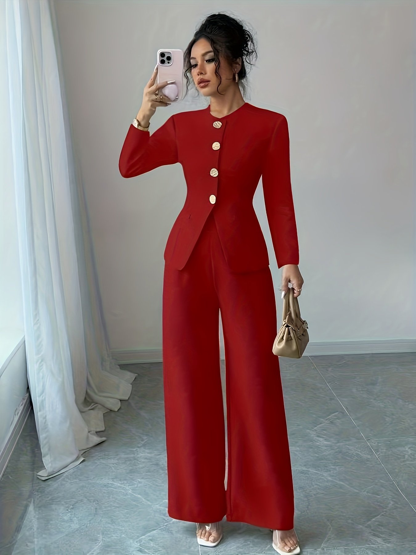 - أناقة اللون الأحمر الجريء: يأتيكِ هذا الطقم بلون أحمر عميق وجذاب، يضفي على إطلالتكِ لمسة من الجرأة والثقة بالنفس، ويضمن لكِ حضوراً ملفتاً للنظر في أي مناسبة رسمية أو عملية.
