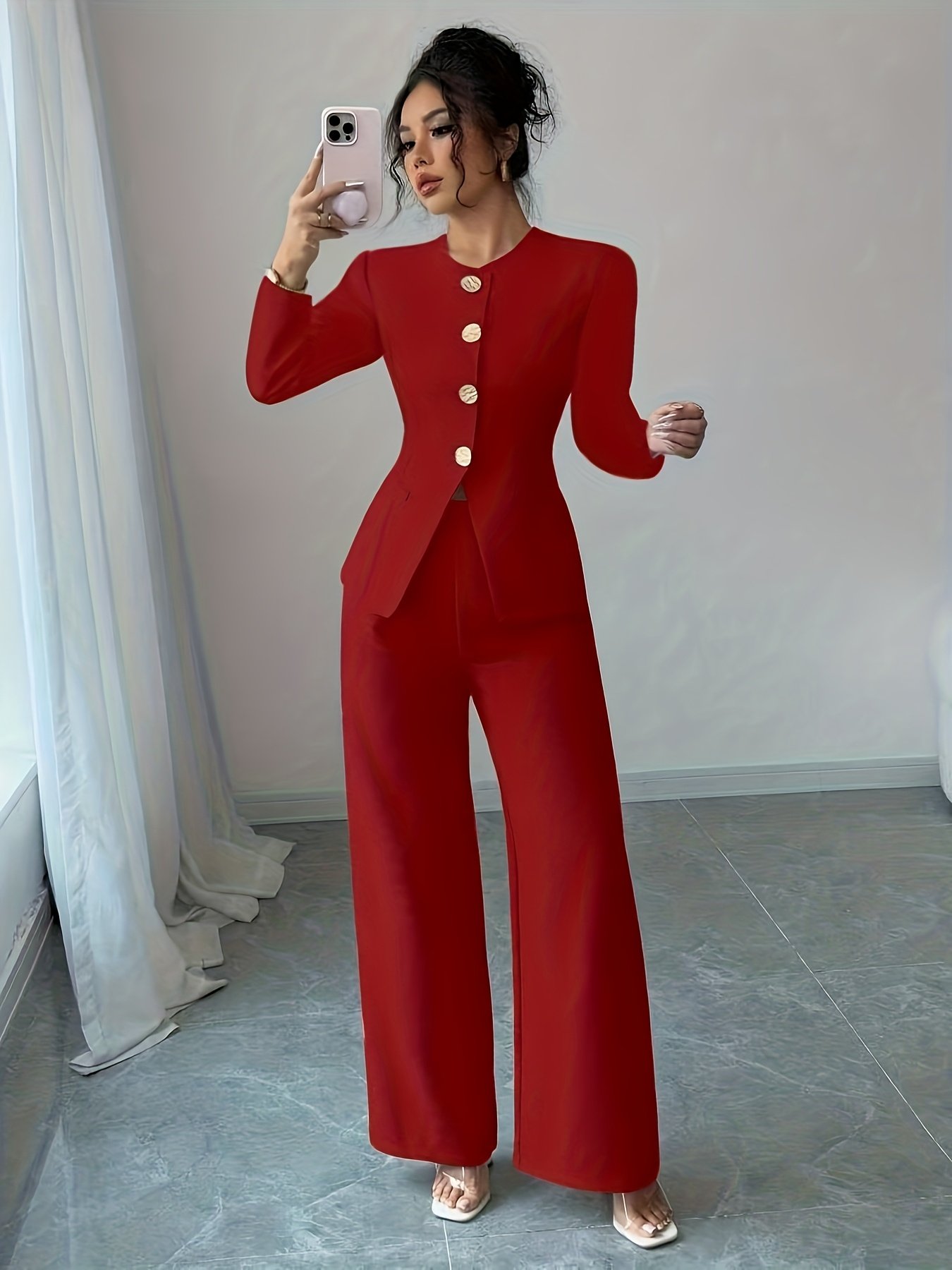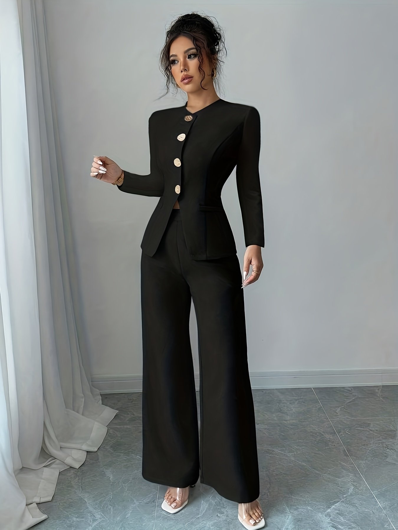 - تصميم متكامل وعصري: يتكون الطقم من بلوزة أنيقة بأكمام طويلة وياقة دائرية، وسروال ذو قصة مريحة مع تفاصيل أزرار أمامية، ليمنحكِ إطلالة متناسقة، عصرية ومتكاملة دون عناء التنسيق.