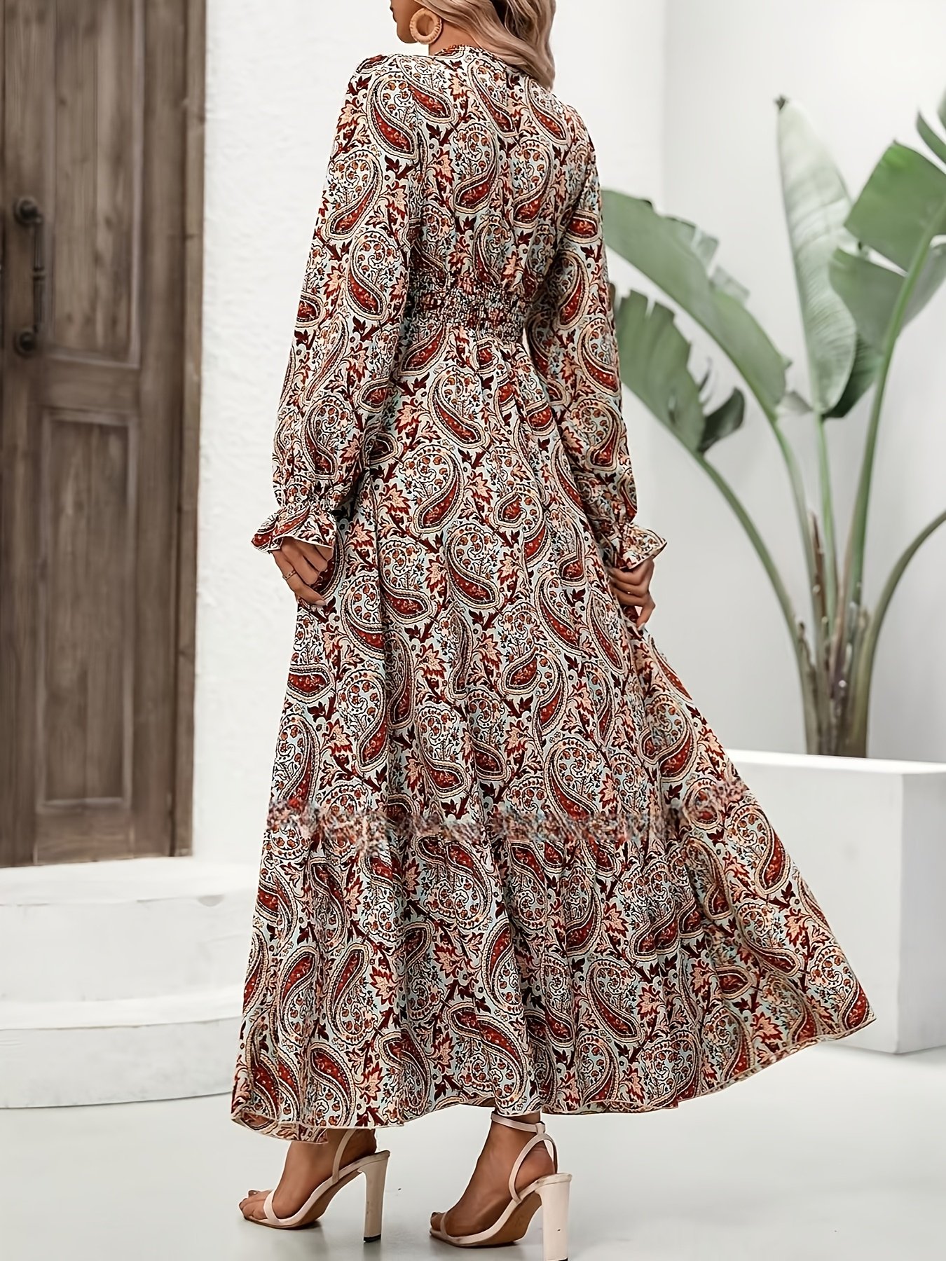 اكتشفي قمة الأناقة والراحة مع فستاننا الطويل ذو النقشة الكشميرية الفريدة. تصميم يمزج بين الأناقة العصرية والراحة المطلقة، ليصبح خيارك الأمثل لكل المواسم والمناسبات، من النزهات الصباحية إلى أمسيات العطلات الساحرة.