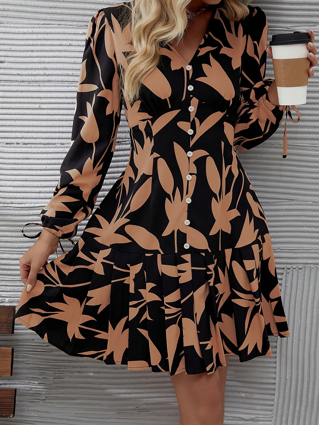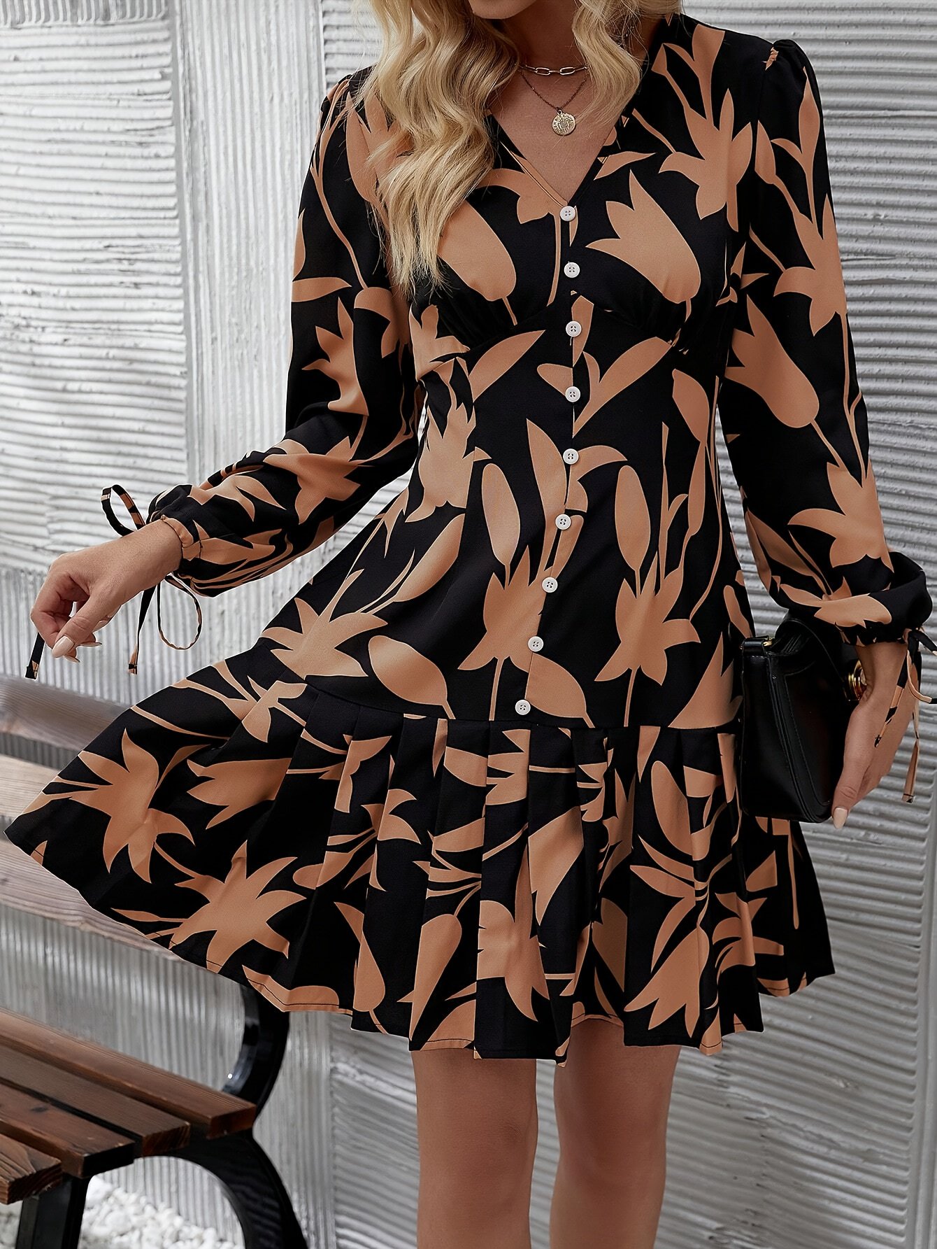 - نقوش مزهرة ساحرة: يزينه طبعة زهور عشوائية نابضة بالحياة تضفي لمسة من البهجة والأنوثة، مع كسرات رقيقة تزيد من رونقه وجاذبيته وتمنحه حركة أنيقة.
