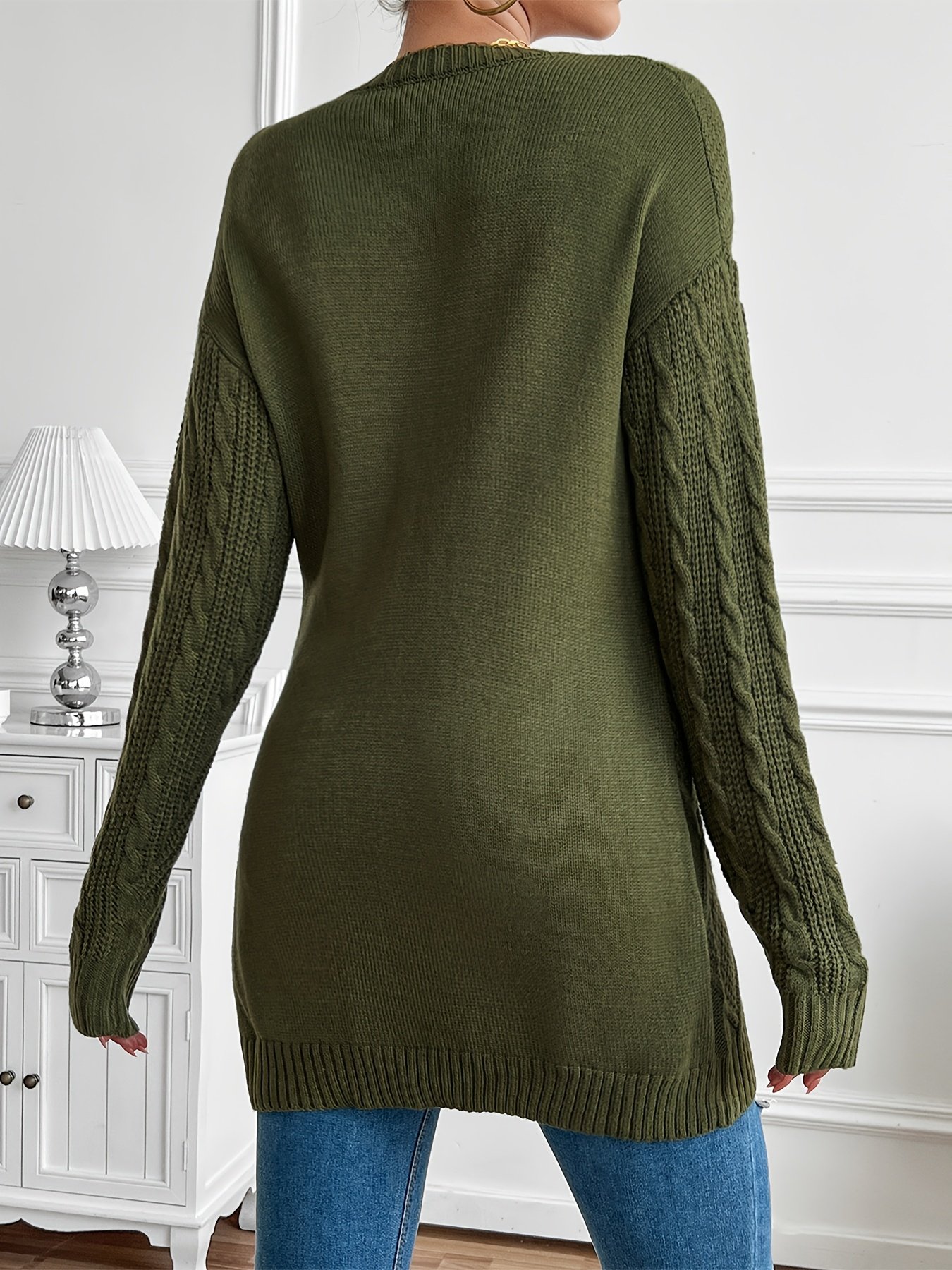 • تصميم فضفاض وعصري: بقَصّة طويلة وأكتاف منسدلة وياقة دائرية كلاسيكية، توفر لكِ الكنزة إطلالة عصرية ومريحة تسمح بسهولة التنسيق مع مختلف الأزياء، سواء كانت لجلسة دافئة في المنزل أو خروجة أنيقة.