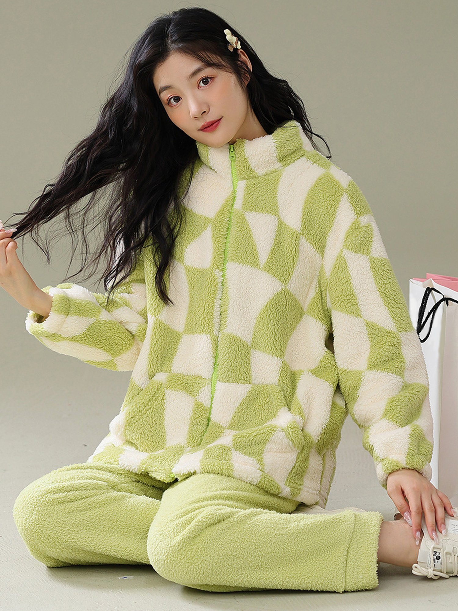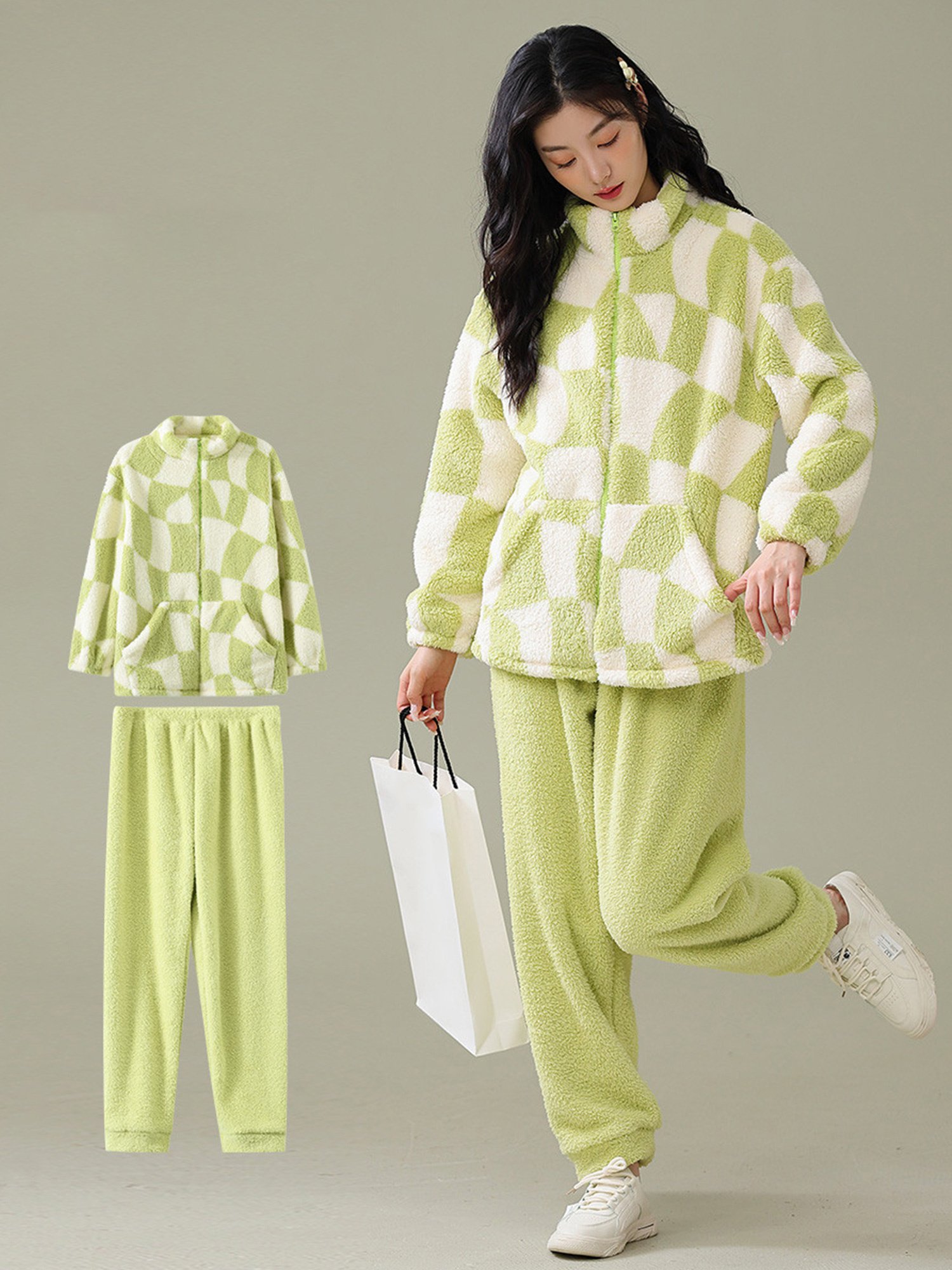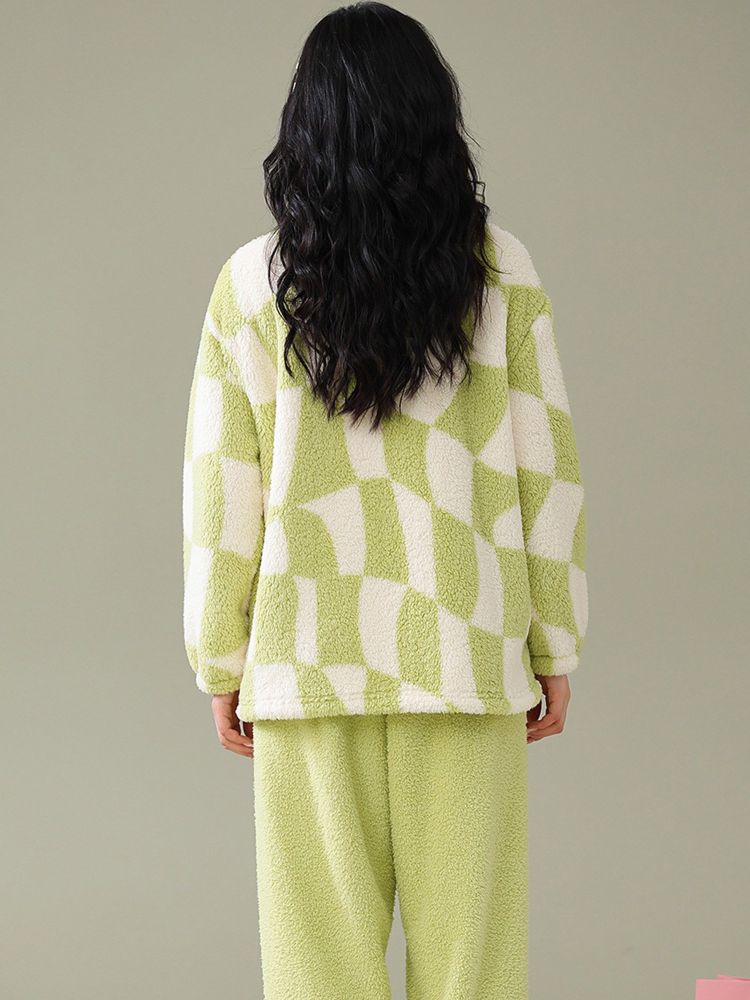 - نقشة عصرية ساحرة: تميزي بنقشة المربعات الجذابة والعصرية باللون الأخضر، التي تضفي لمسة من البهجة والأناقة الكاجوال على إطلالتكِ، سواء كنتِ في المنزل تستمتعين بلحظاتكِ الهادئة أو في نزهة صباحية سريعة تتطلب لمسة من الأناقة.