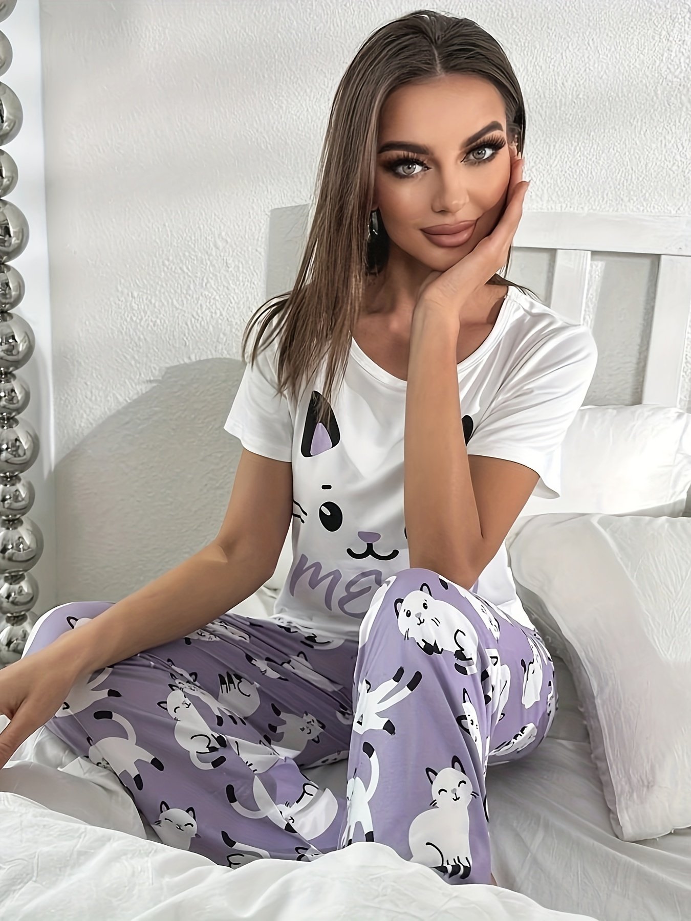 - تصميم فريد ومرح: استمتعي بلمسة من السعادة مع نقوش القطة اللطيفة والرسائل العصرية الجذابة التي تزين الطقم. هذا النمط الكرتوني الأنيق يضفي لمسة شخصية ومبهجة على إطلالتكِ المنزلية، مما يجعلكِ تشعرين بالجمال والراحة.