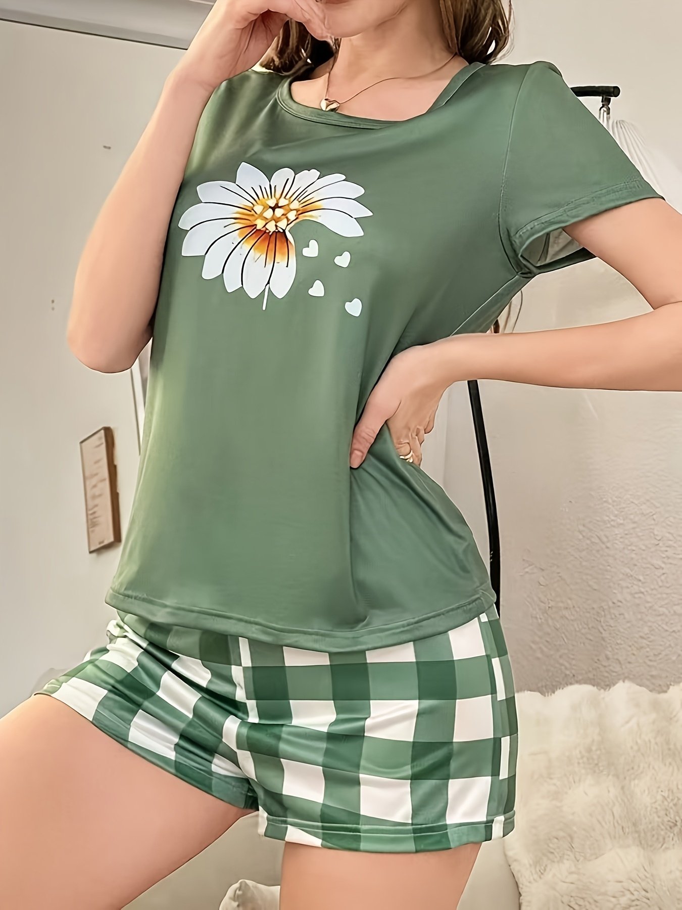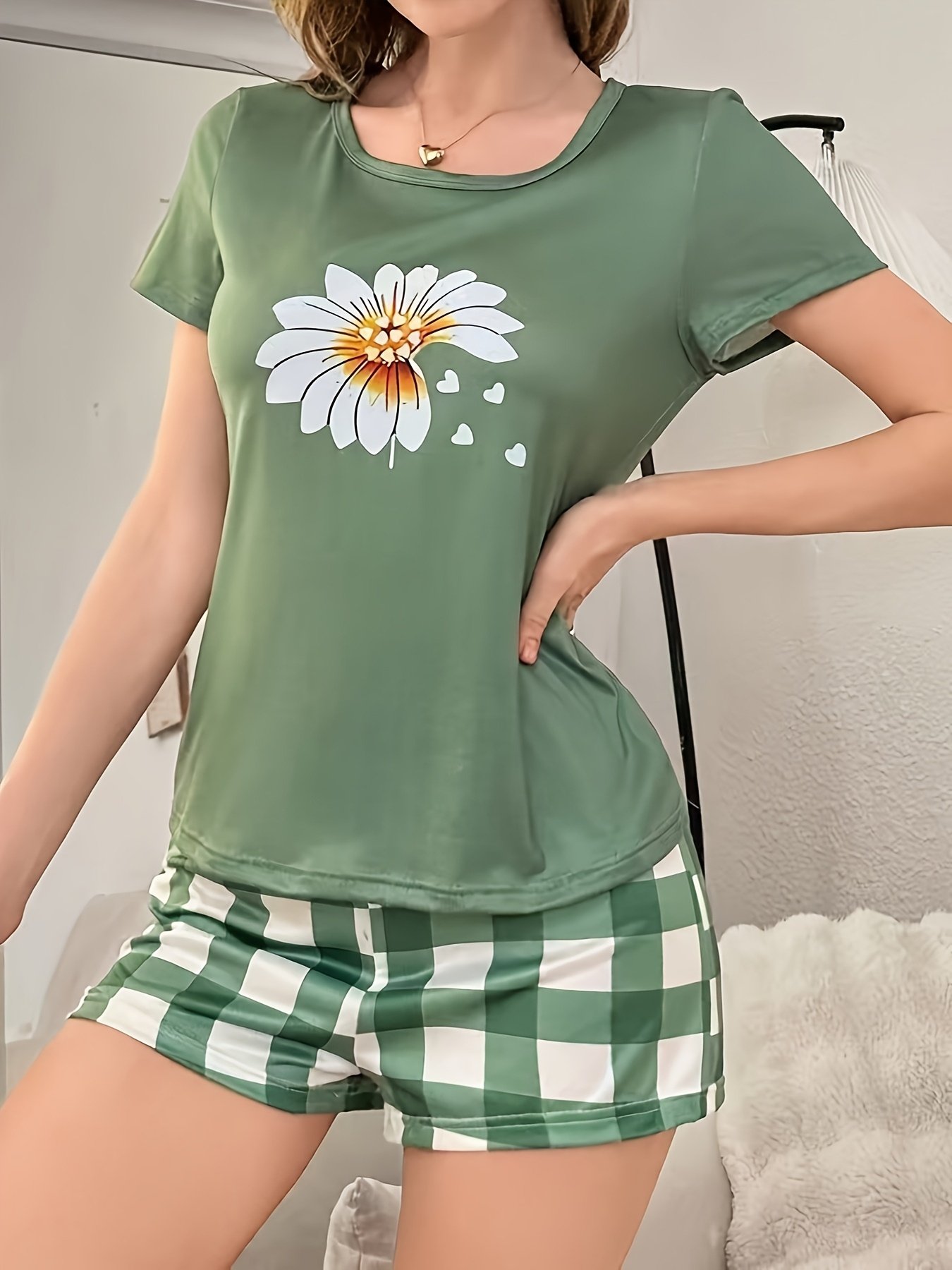 - تصميم زهري ساحر: يأتيكِ الطقم بنقشة زهور أنيقة وجميلة تضفي لمسة من الأنوثة والرقة على إطلالتكِ المنزلية، مع ياقة دائرية كلاسيكية وأكمام قصيرة تمنحكِ حرية الحركة والانتعاش.
