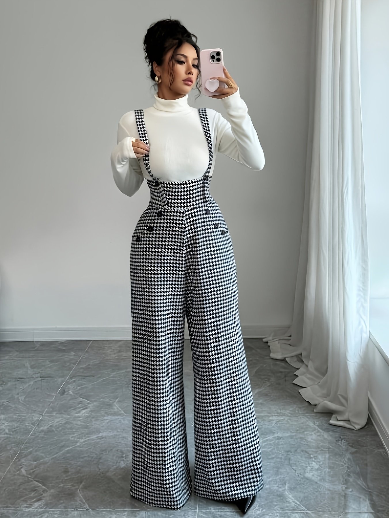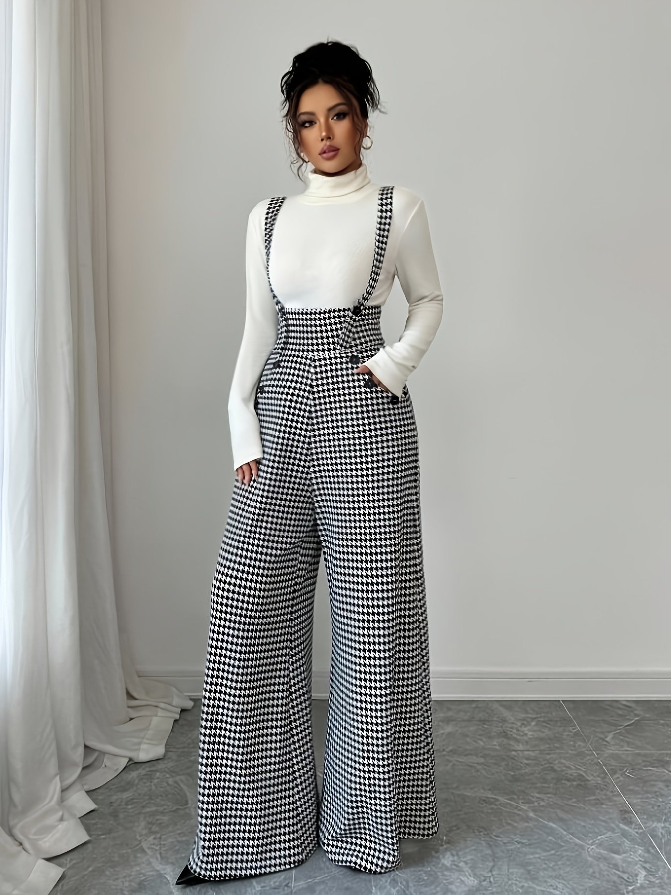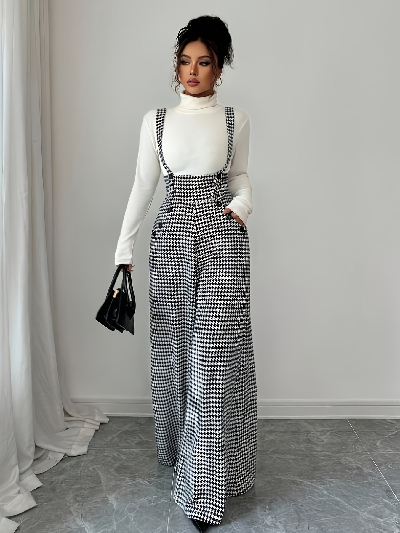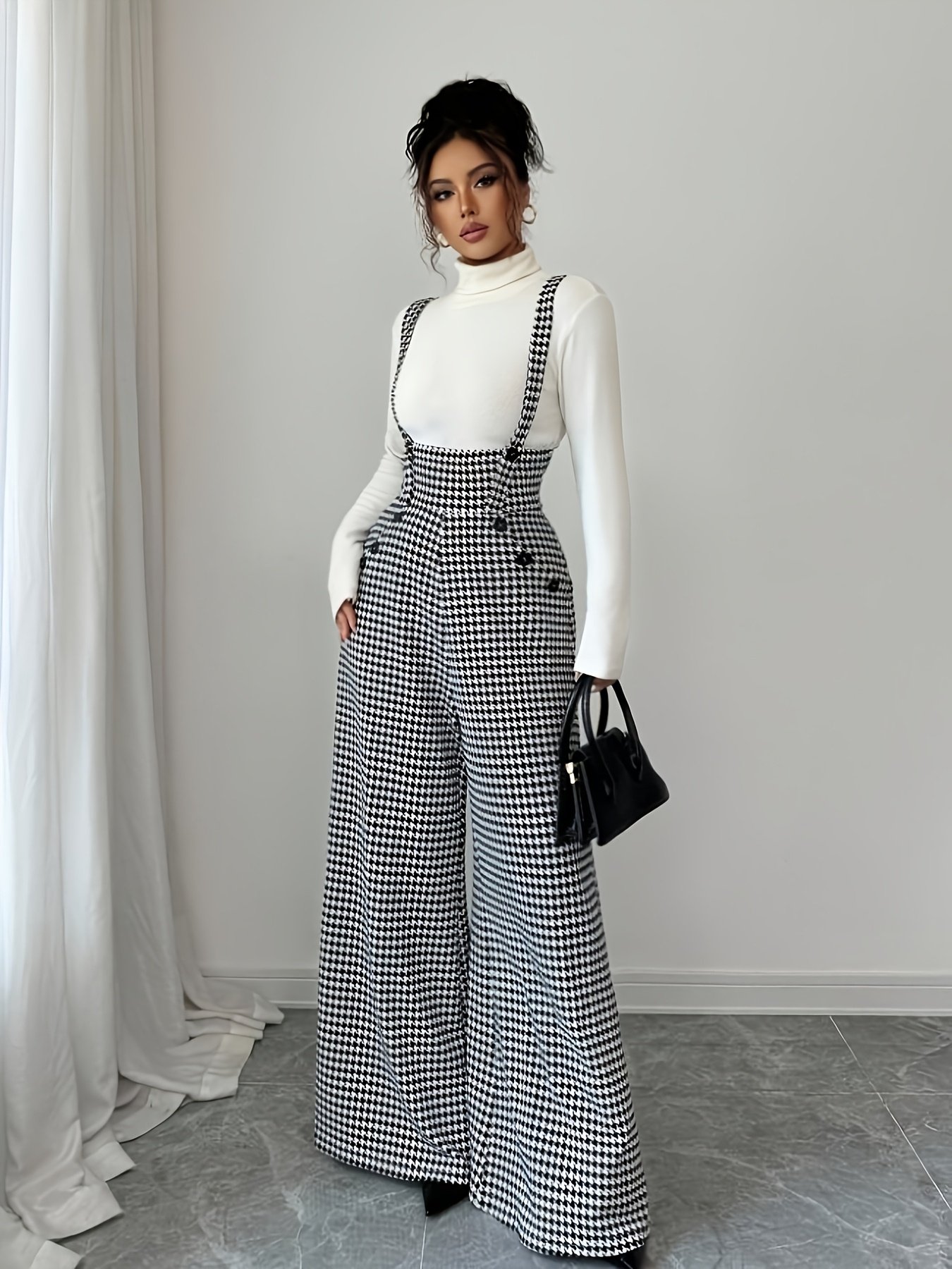 • تصميم أيقوني ونقشة عصرية: يتميز بنقشة الهاربورن (Houndstooth) الخالدة باللونين الأسود والأبيض، لمسة تضفي عليكِ رقيًا لا يضاهى وجاذبية عصرية تتناسب مع أذواق الأناقة الرفيعة.