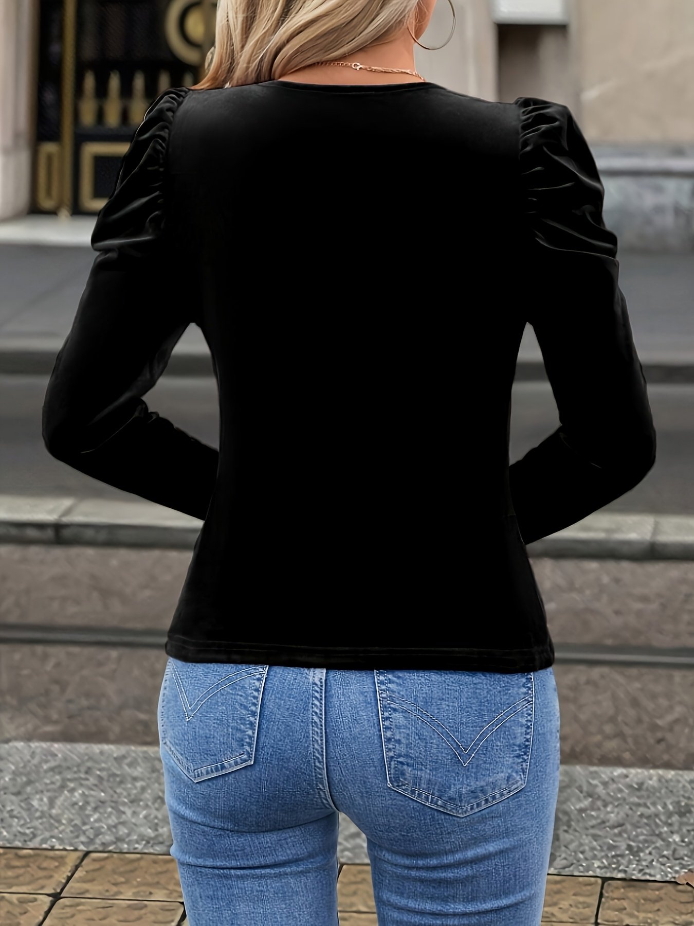 - أكمام منفوخة بتصميم فريد: لمسة مميزة وعصرية تضيف حجمًا وشخصية إلى مظهرك، محوّلة التيشيرت العادي إلى قطعة فنية راقية تجذب الأنظار وتبرز أناقتك.