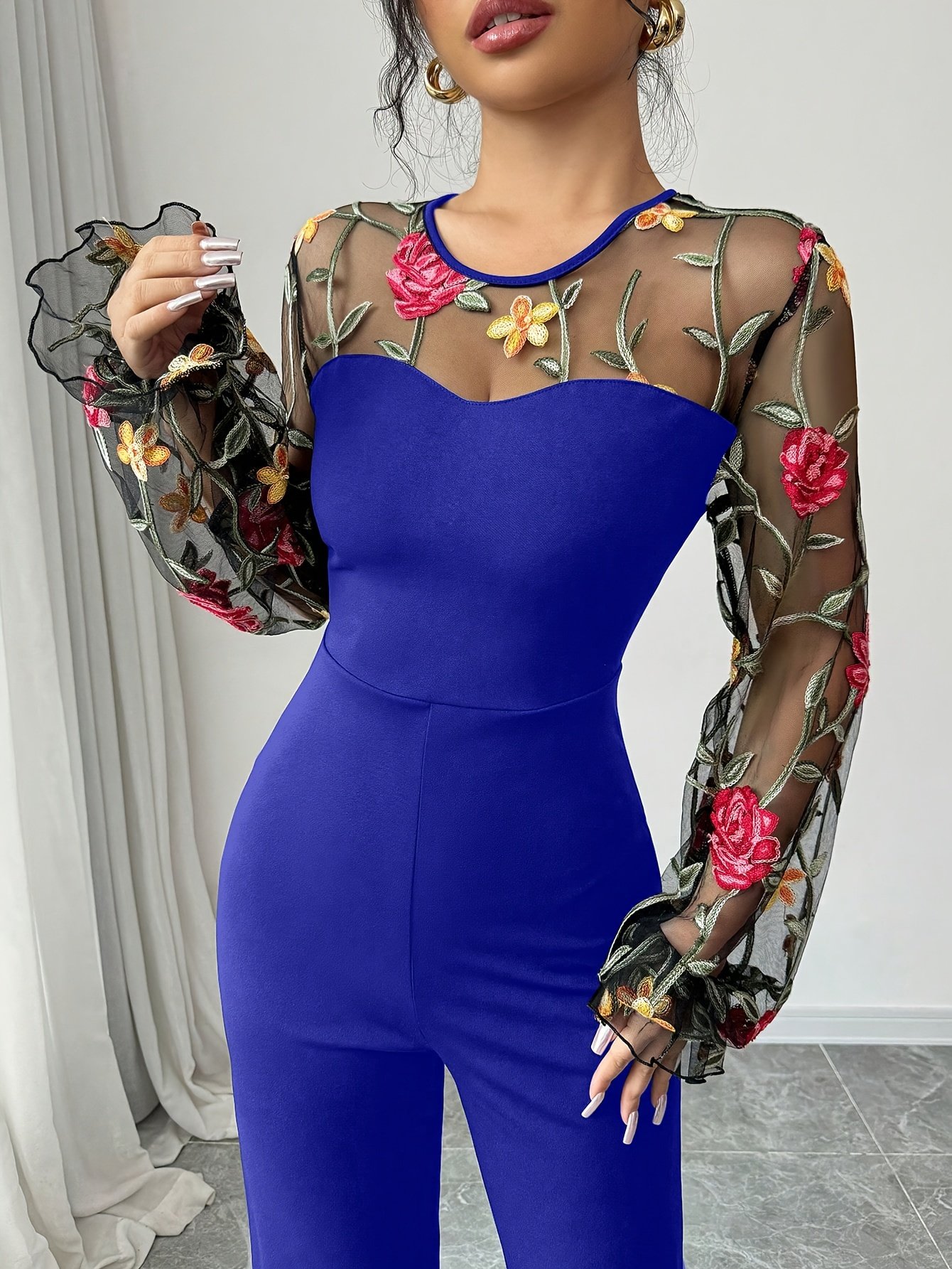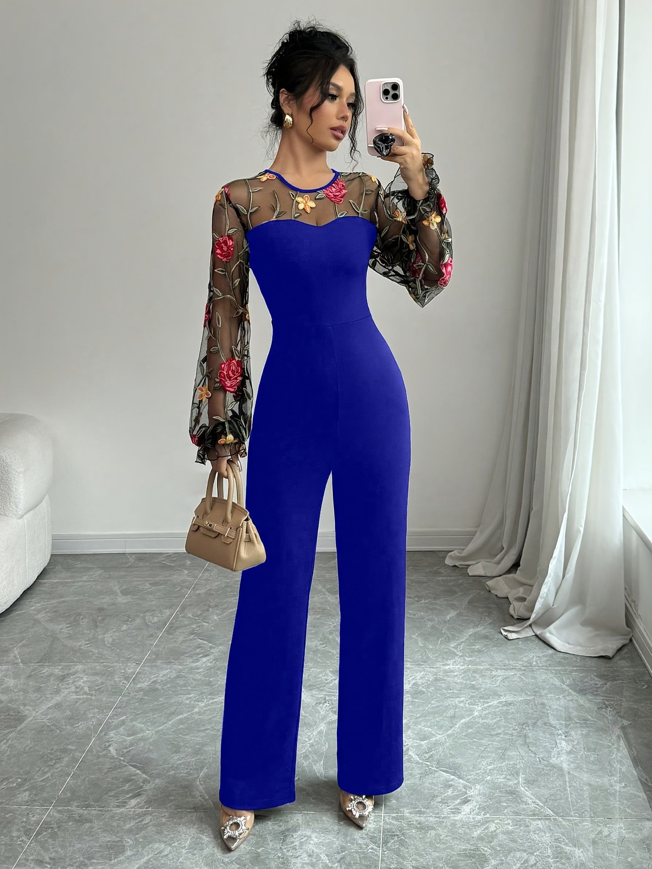 - الأكمام الفانوسية الجذابة: أكمام مصممة بأسلوب فانوسي عصري تمنح الجمبسوت حجمًا أنيقًا وشكلاً مميزًا، لتضفي عليكِ حضورًا لا يُنسى.