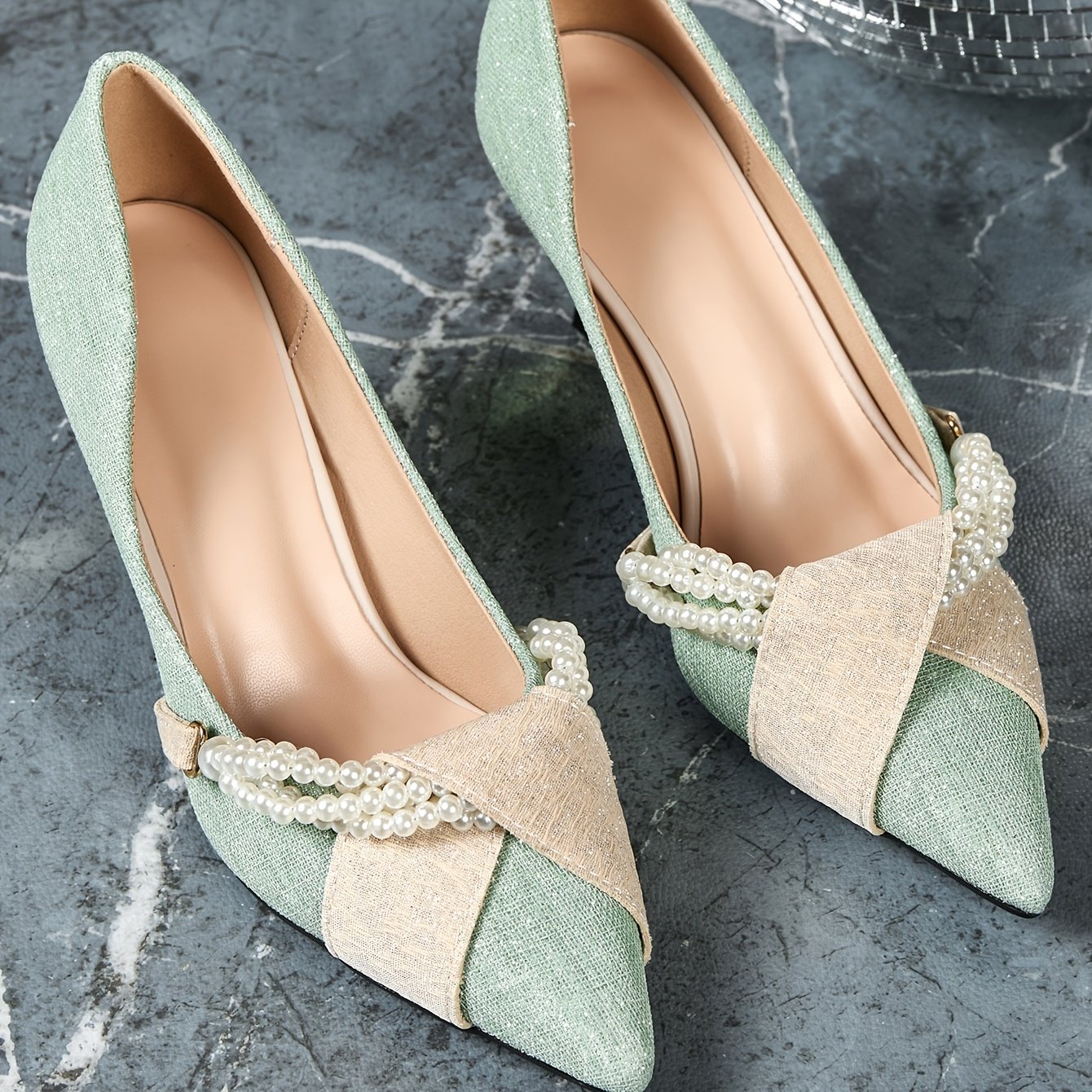 - تألق أخضر نعناعي ببريق ذهبي: مزيج فريد من اللون الأخضر النعناعي الهادئ مع لمعان ذهبي مبهر وتفاصيل فيونكة رقيقة، يضمن لكِ إطلالة براقة ومميزة.