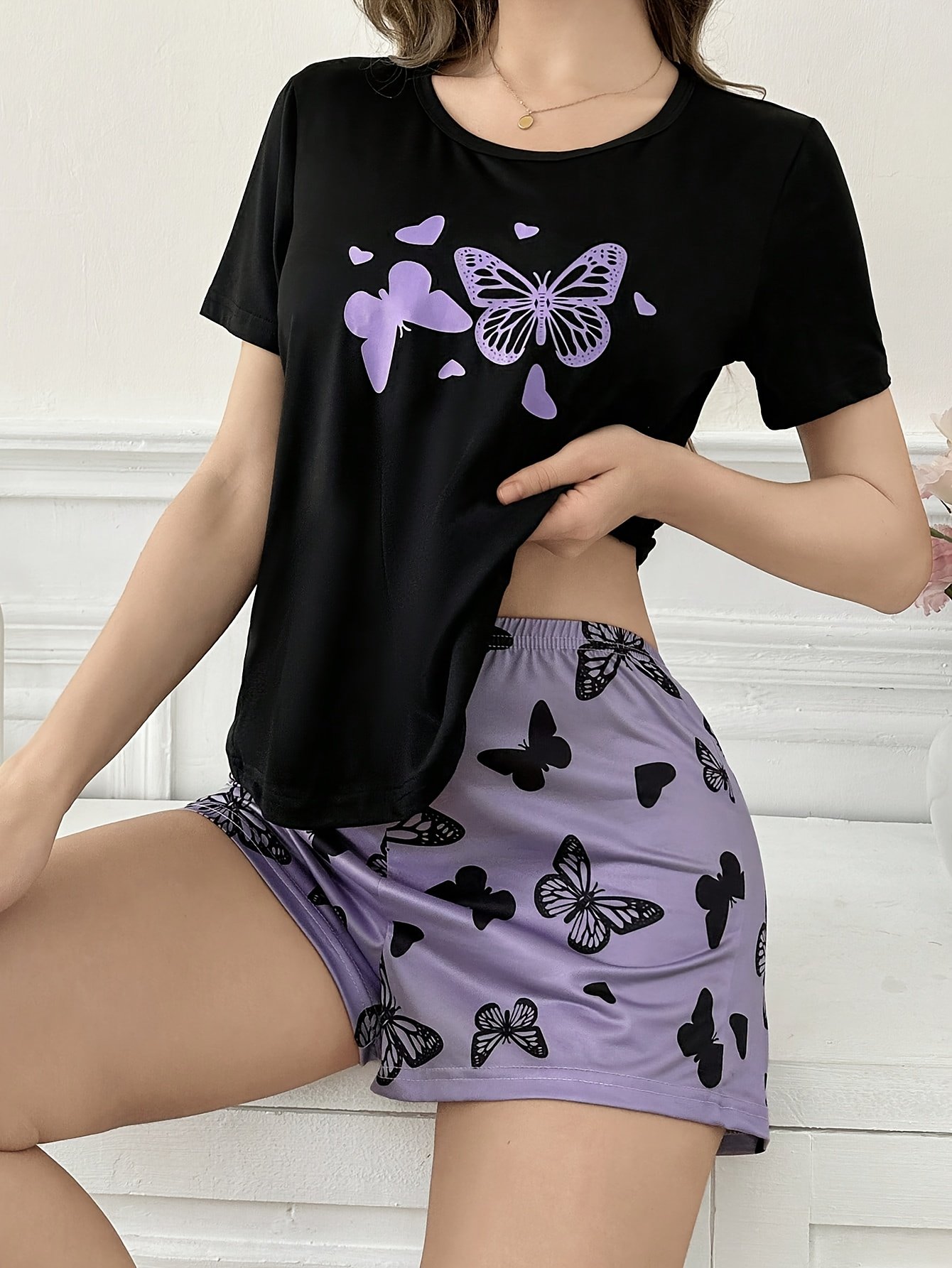 - تصميم أنيق وجذاب: يتميز بطبعة فراشات ساحرة ومميزة، مع ياقة دائرية كلاسيكية وأكمام قصيرة، وشورت مريح بخصر مطاطي، ليمنحكِ إطلالة عصرية ومريحة في آن واحد، مثالية للاسترخاء بأناقة.