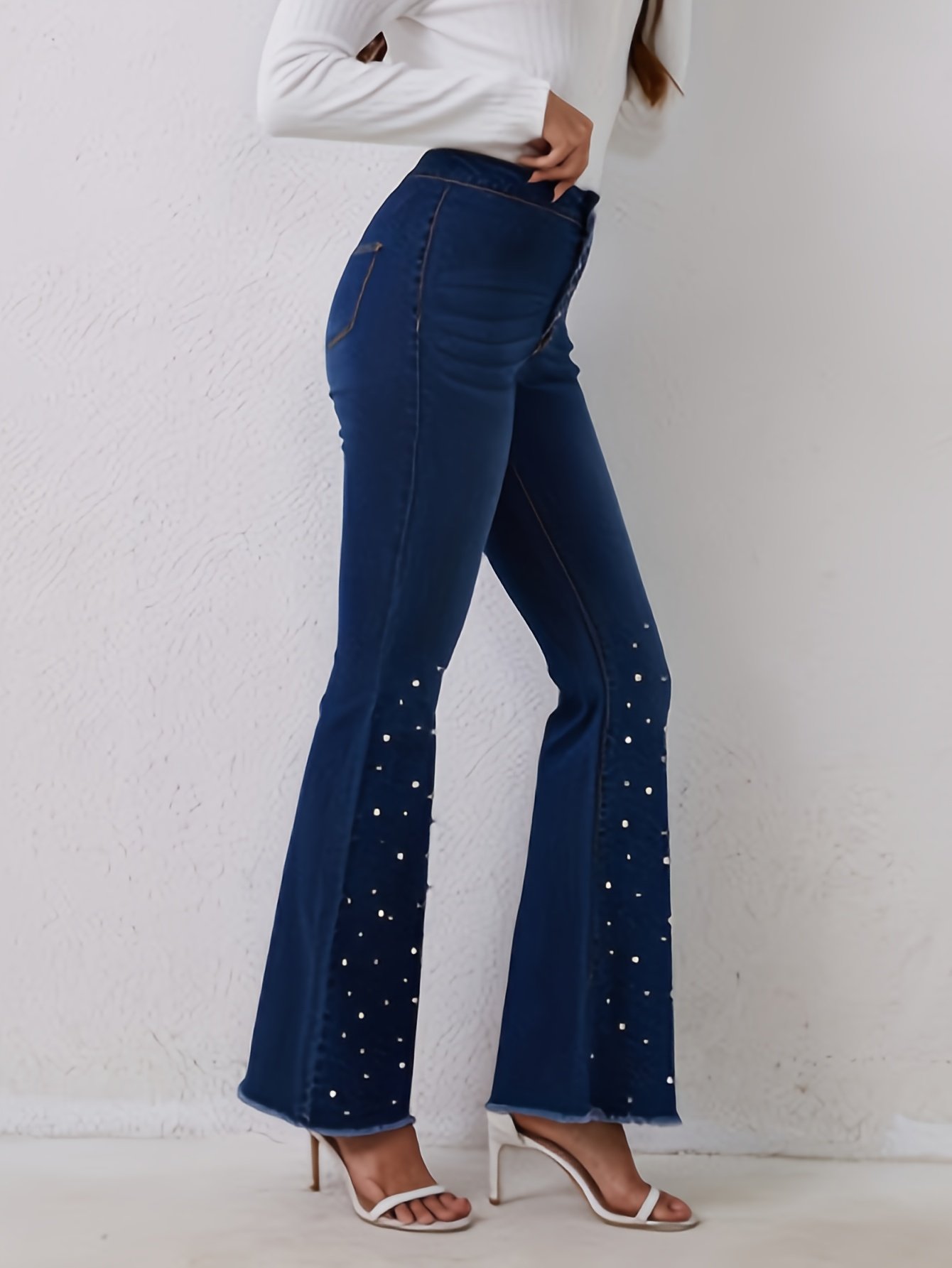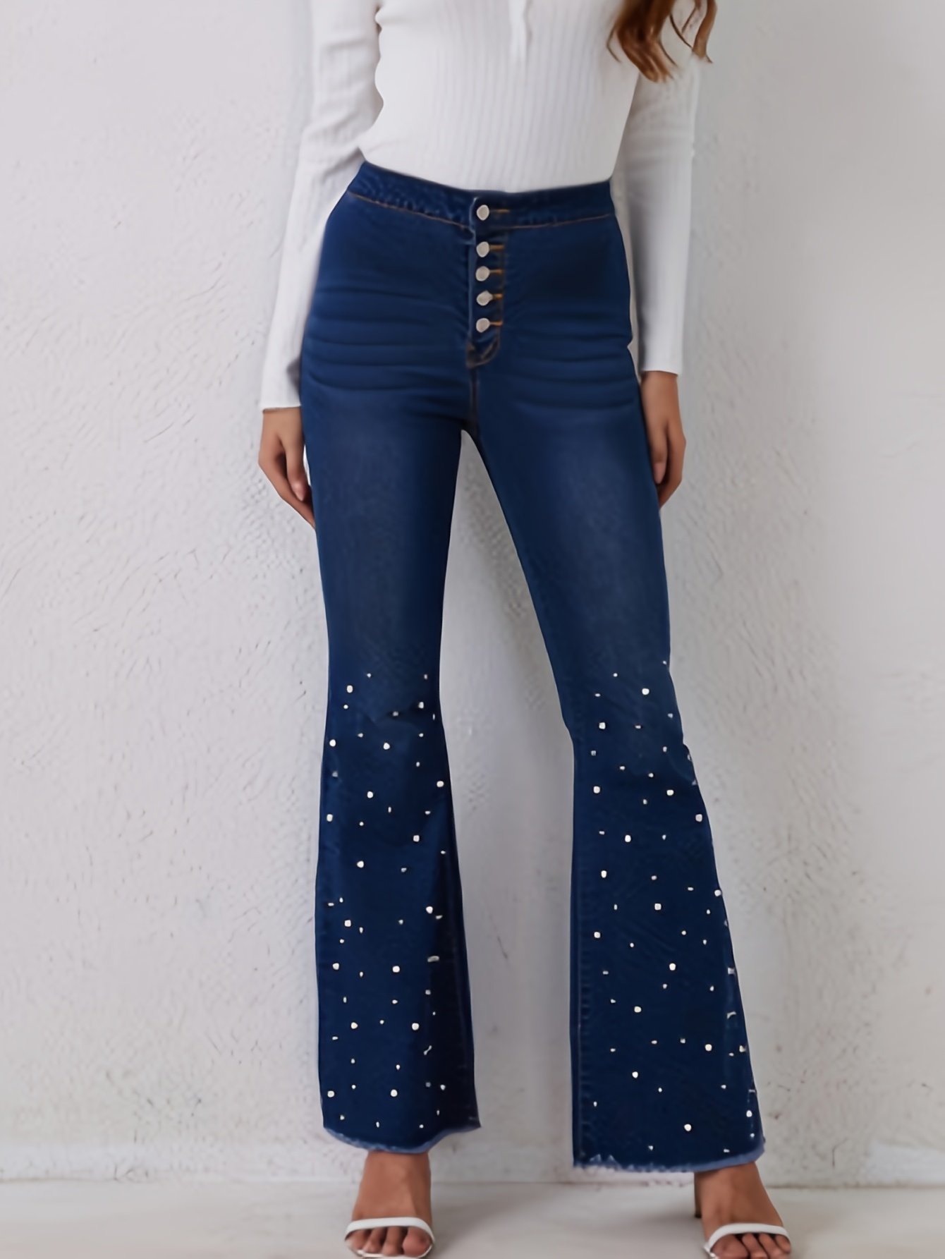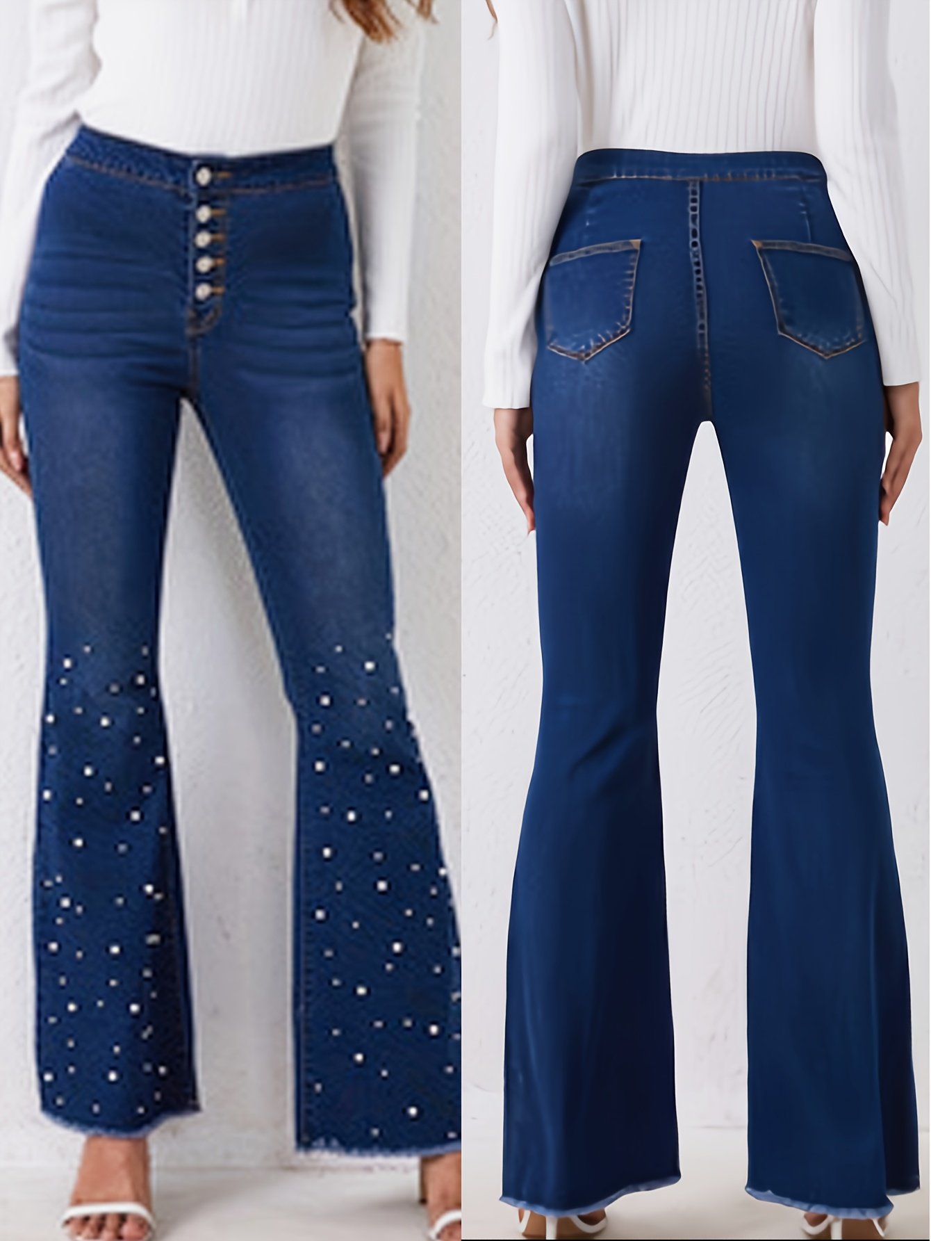 - تصميم فريد باللؤلؤ والكاشك: تزين هذا الجينز تفاصيل لؤلؤية أنيقة وكاشك جذاب، مما يمنحك لمسة من الفخامة والتميز لا مثيل لها.