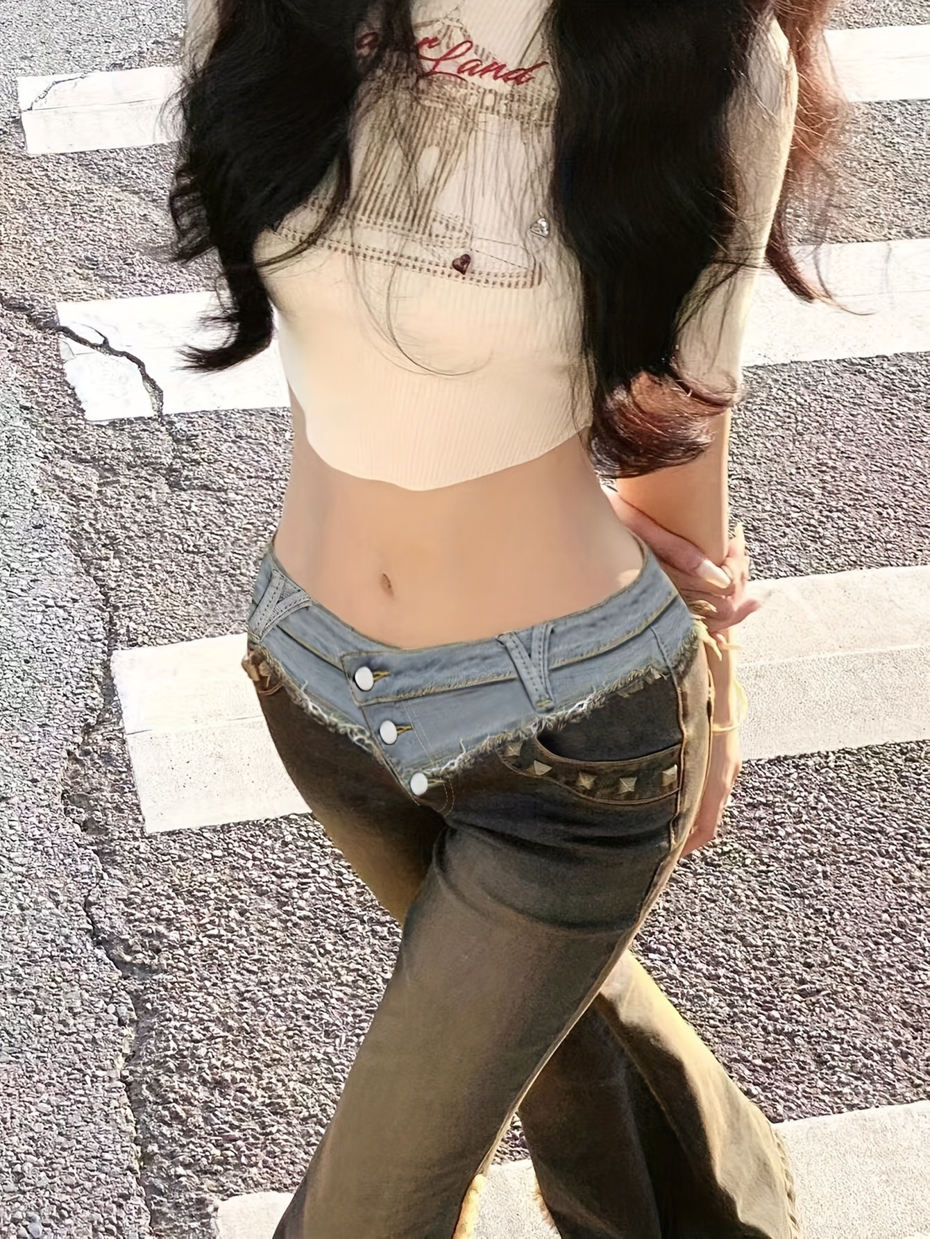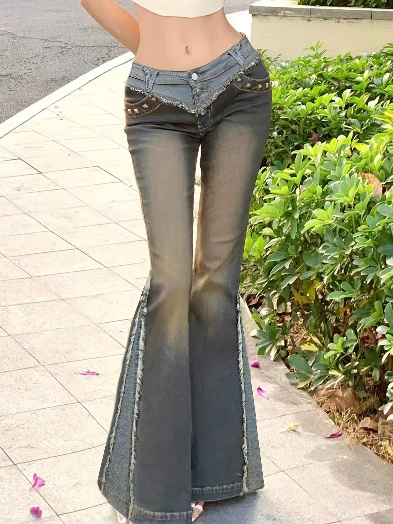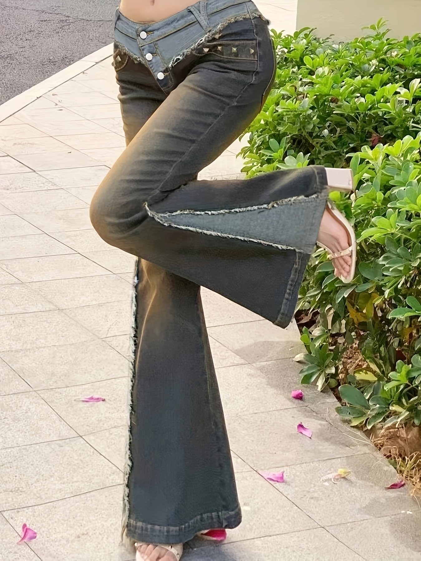 - تفاصيل ترصيع لافتة: زُيِّن هذا الجينز بلمسات ترصيع معدنية دقيقة تضيف إليه بريقاً خاصاً وتفرداً، محوّلة إياه إلى قطعة فنية تليق بإطلالاتك النهارية والمسائية.