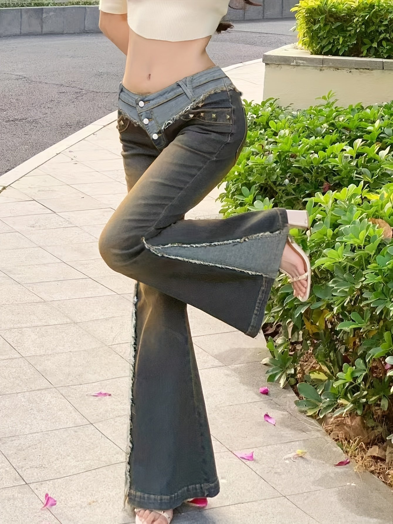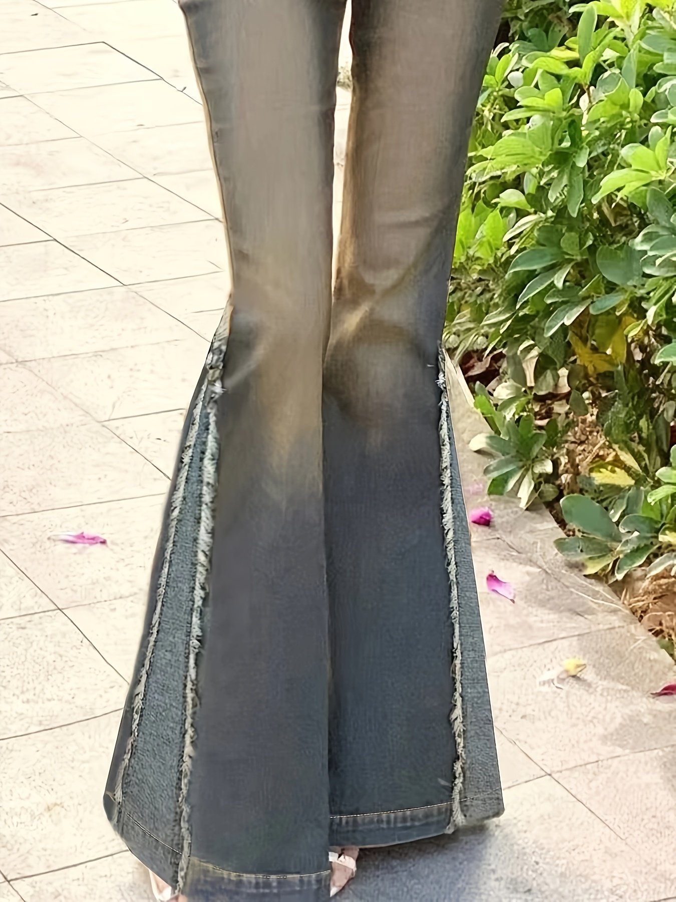 - قصة الفلير العصرية: يتميز بتصميم بقصة ضيقة عند الفخذين تتسع تدريجياً من الركبة إلى الأسفل (Flare Leg)، مما يمنحكِ إطلالة مستوحاة من السبعينات مع لمسة عصرية تبرز أناقتك وتطيل قوامك.