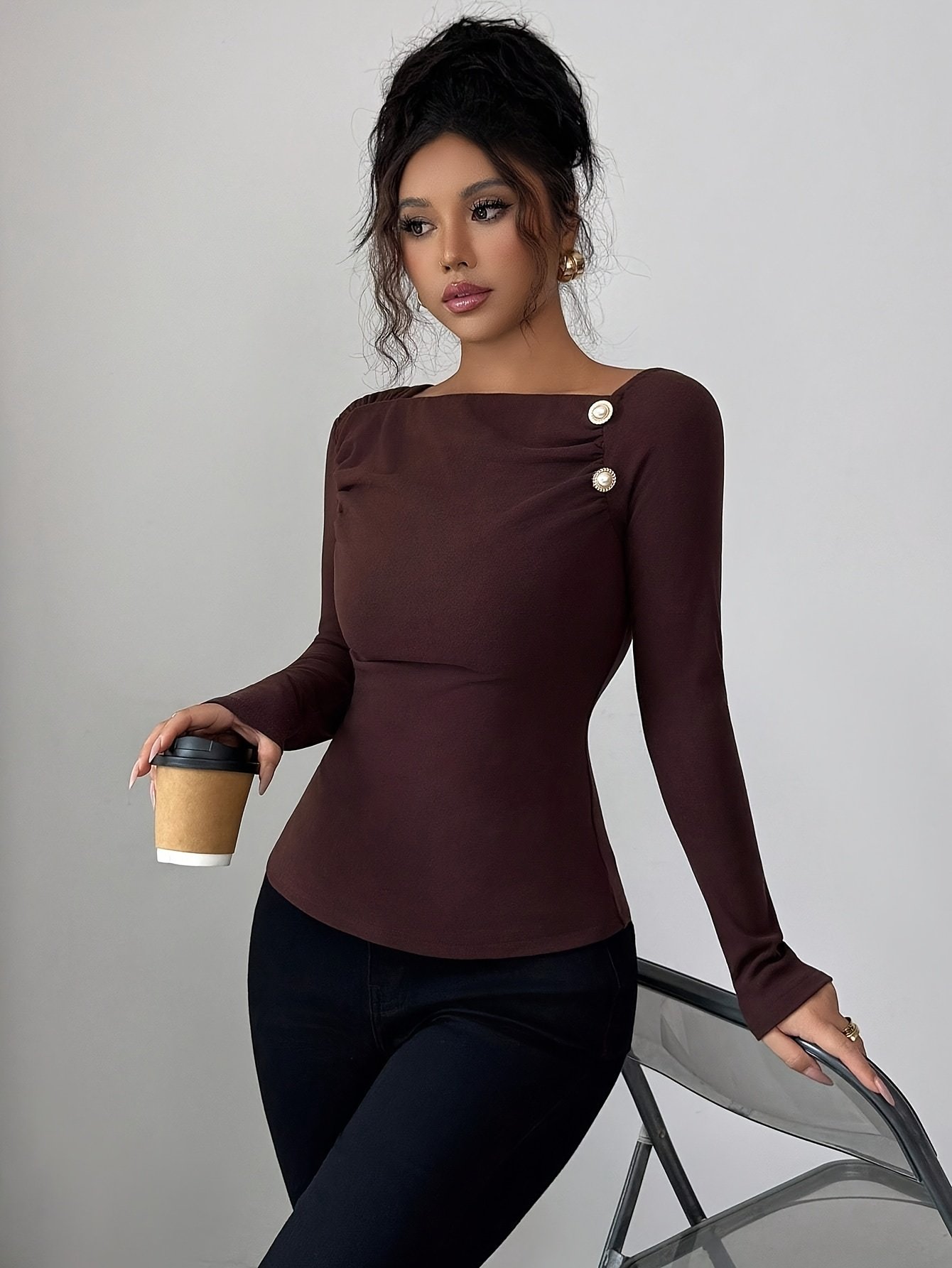 - تفاصيل أزرار مميزة: أزرار أنيقة تضفي لمسة جمالية راقية وتفردًا على التصميم ذي اللون السادة الكلاسيكي، مما يجعله سهل التنسيق مع أي قطعة في خزانتكِ.