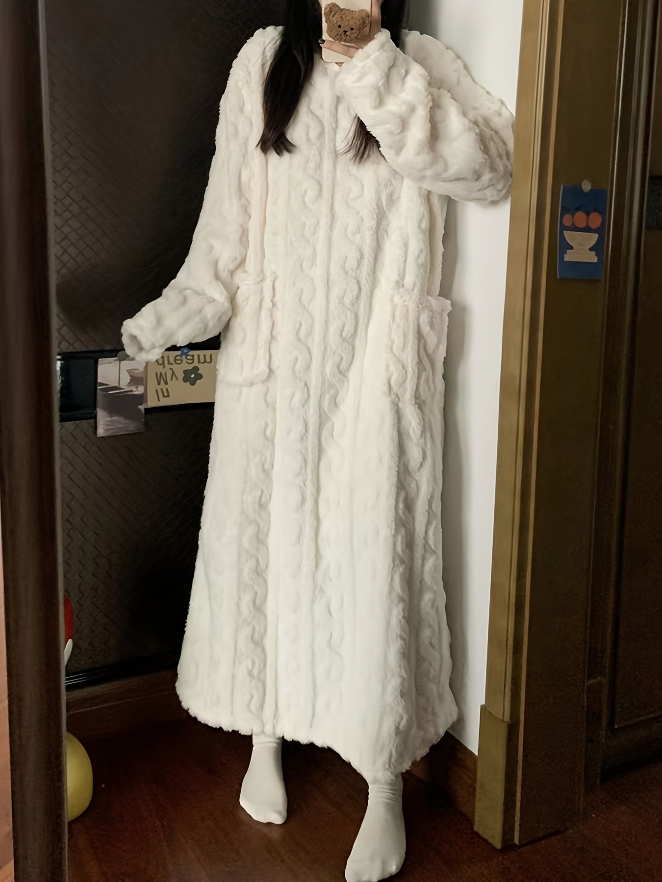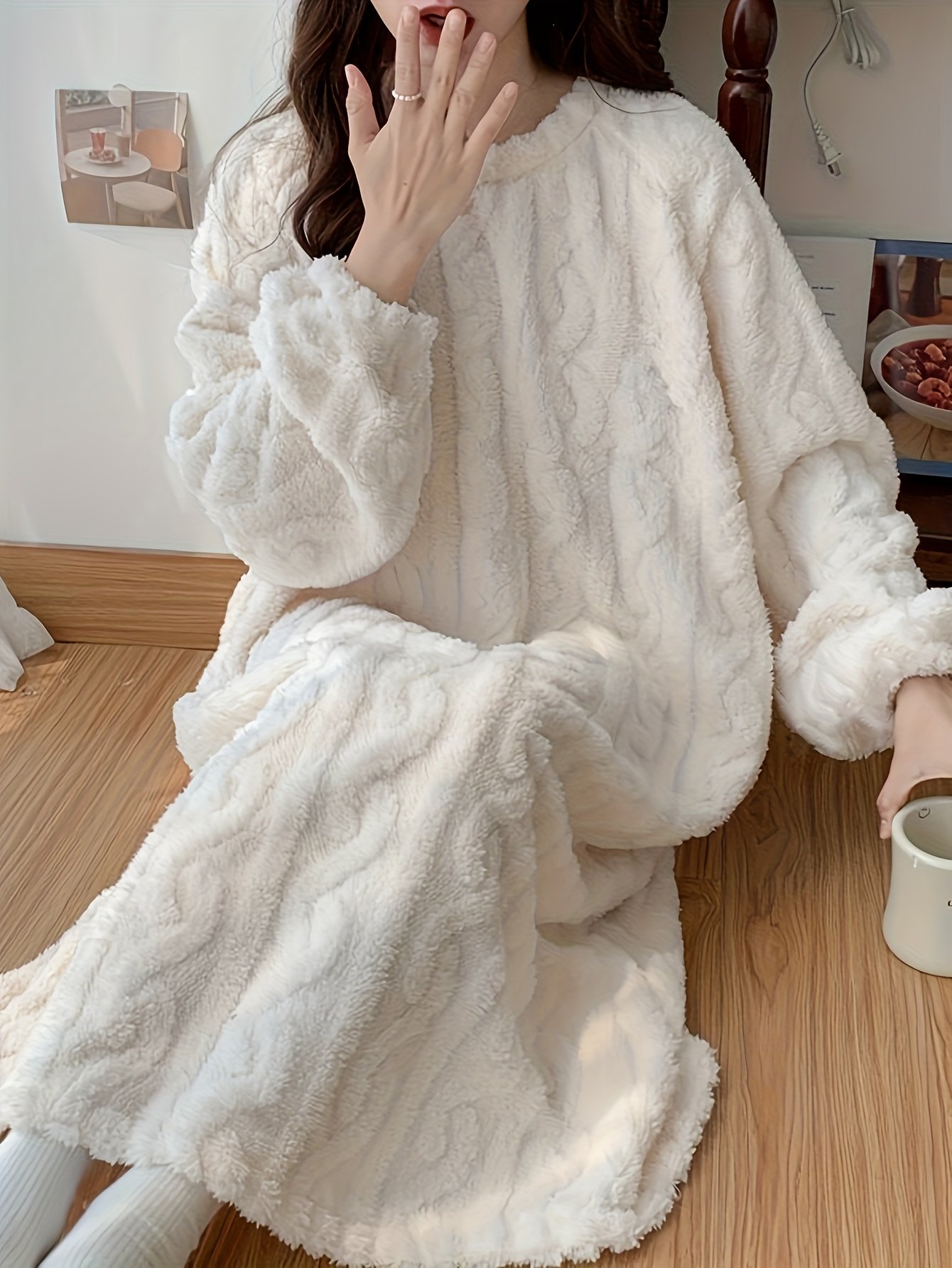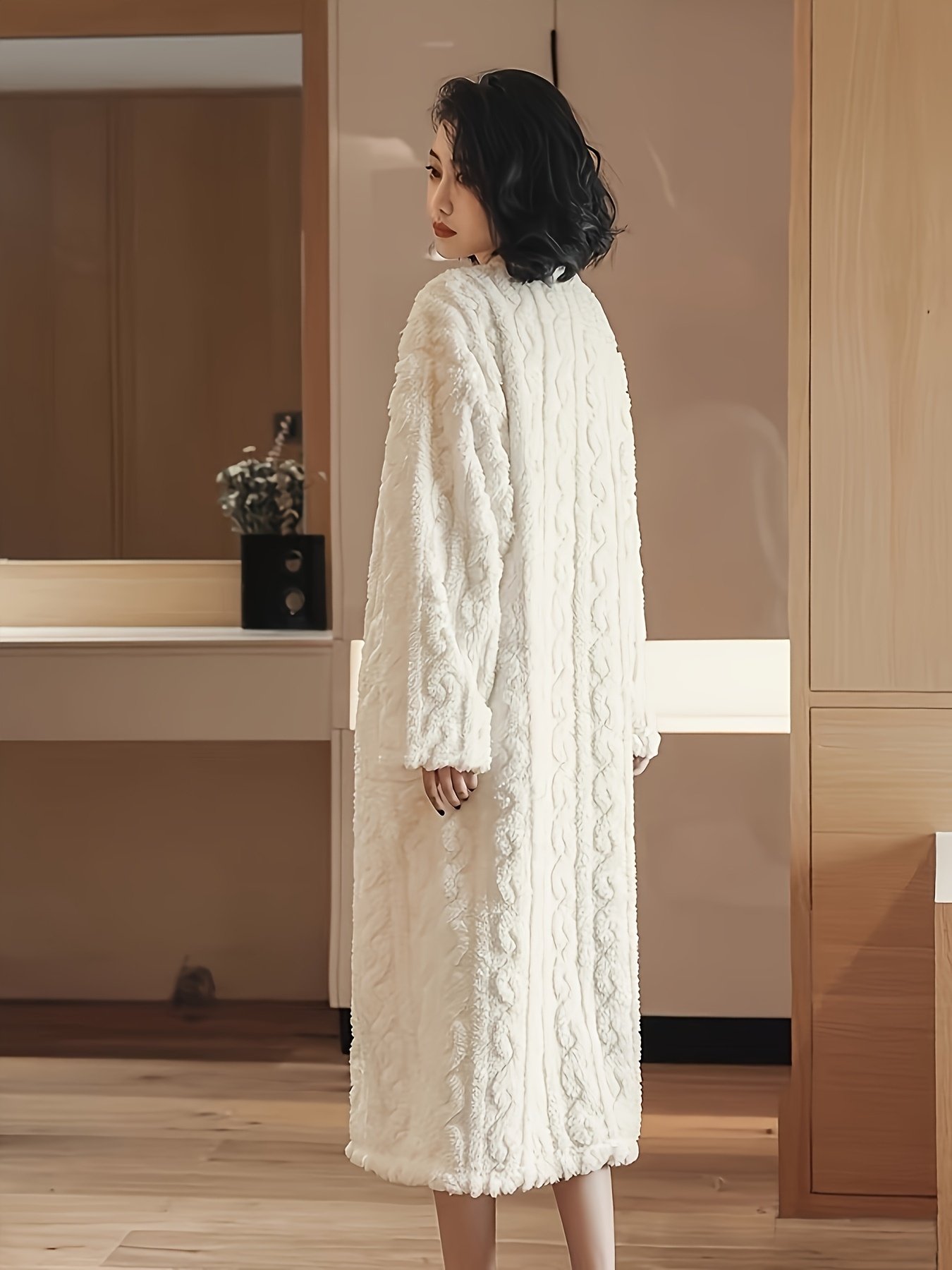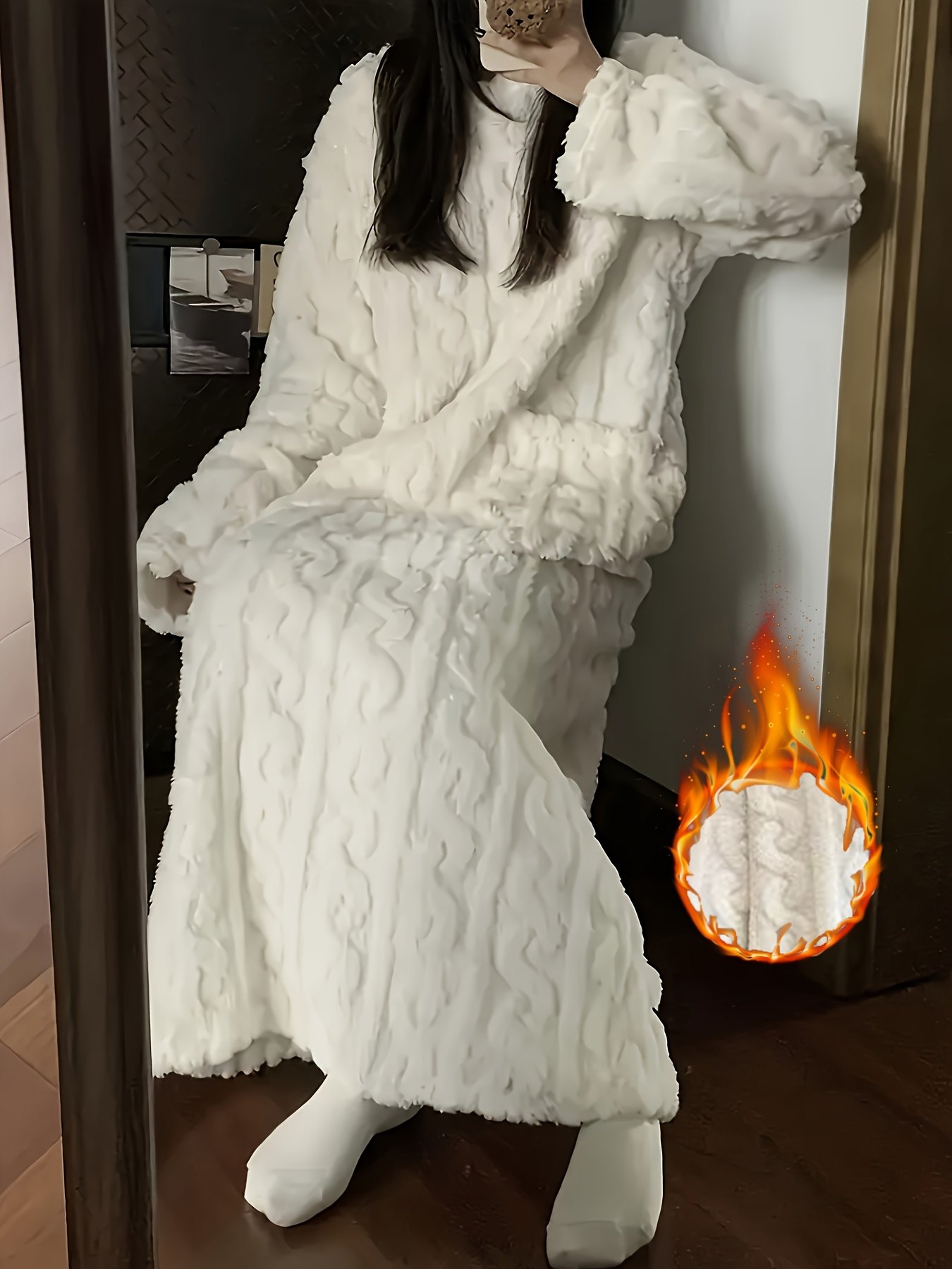 • دفء استثنائي: مصنوع من قماش صوفي سميك وفاخر يوفر لكِ دفئًا لا مثيل له في أبرد ليالي الشتاء، مع ملمس ناعم كالحرير على بشرتك، لتبقى دافئة ومسترخية.